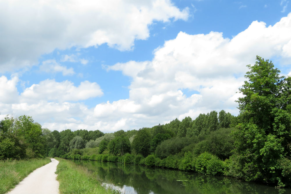 Na dat laatste monument keerde ik terug naar Corbie waar ik het pad langs de Somme nam, voor de rest van de dag. Het was mooi fietsen langs de Somme, heel rustig en ten midden van het groen. Ook Amiens passeerde ik langs de oevers van de Somme. Hier was het niet rustig en groen natuurlijk maar het is wel een makkelijke manier om een stad te doorkruisen. Hier heb ik trouwens niet even rondgekeken, daarvoor was het mij wat te groot en druk. Voorbij Amiens kwam ik wel weer tenmidden het groen, met overigens ook links en rechts van de rivier nog veel watervlaktes.