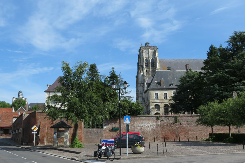 Origineel was het de bedoeling om verder langs de Somme en langs Abbeville te rijden. Ik had echter op verscheidene folders St Riquier en zijn abdij gezien en dat lag maar een beetje boven Long, wijziging van de plannen dus. Dat betekende natuurlijk wel dat er terug mocht geklommen worden en wel direct na het begin al. St Riquier bleek inderdaad wel een interessant stadje met duidelijk al enige geschiedenis en verspreid over het stadje resten van wat een erg grote abdij moet geweest zijn. Van St Riquier ging het richting Nouvion en van daar ging het verder over de kleinere wegen met weinig wegwijzers en zonder nummer. Het wordt dan even moeilijker maar in combinatie met de kaart op het schermpje van mijn GPS nog behoorlijk goed te doen. Zo kwam ik in Rue, ook een plaatsje met al enige geschiedenis schijnbaar. Bij het verlaten van Rue werd het echt even moeilijk omdat de effectieve situatie niet overeen kwam met mijn schermpje, waar ik een weg zocht was er geen maar even verder vond ik er wel één waar er geen hoorde te zijn. Hoe dan ook bleek het de weg te zijn die ik zocht. Helemaal vlekkeloos verliep het daarna echter ook niet helemaal. Ik kwam schijnbaar aan mijn einddoel terwijl ik dacht nog iets hoger te zitten. Ik vond er wel de drie campings zoals verwacht op mijn einddoel, de situatie op de kaart bleef dus toch nog wat verwarrend. Ik koos van de drie de camping die me het schappelijkste leek en die de duidelijkste tarieven toonde. En ze valt best mee maar ze hebben er wel geen wifi. Op de prijslijst ven één van de andere campings stond wel wifi maar aan 10 € per dag.