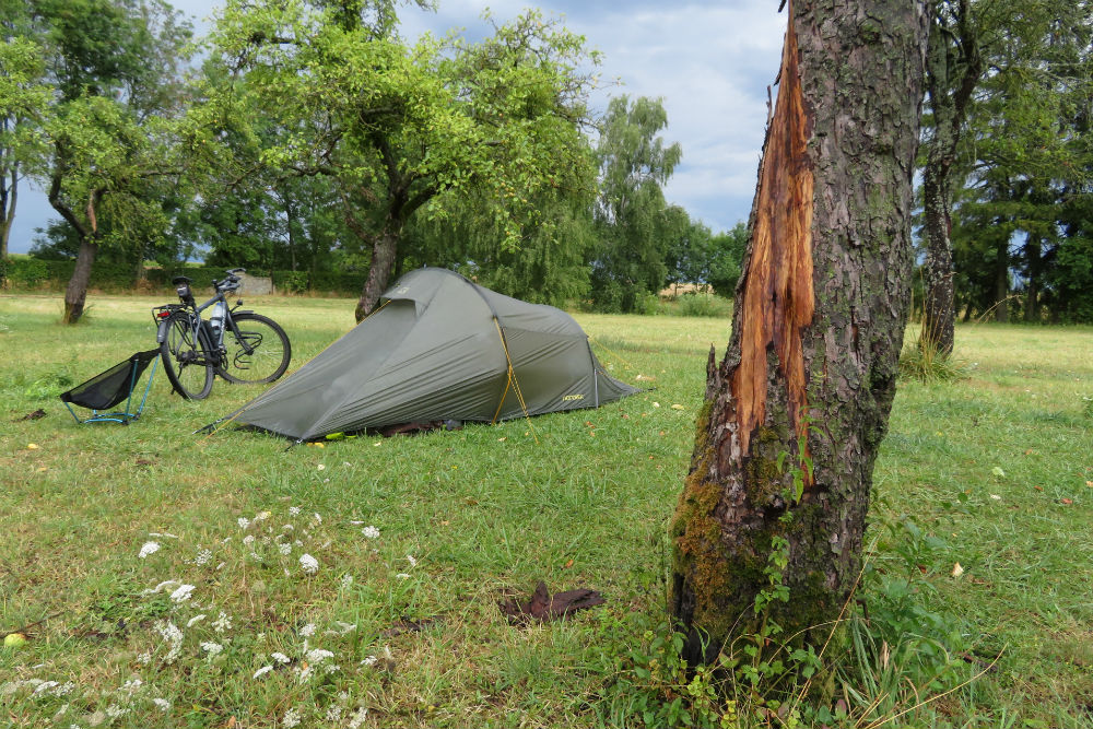 Na installatie en douche kon ik nog een potje water koken voor een tas koffie bij de namiddag snack maar ondertussen werden de wolken alsmaar donkerder en hoorde ik het in de verder al rommelen, ik besloot dus maar om me voorlopig met alles in mijn tentje terug te trekken. Even later bereikte inderdaad de regen ons. Toen passeerde echter de kern van het onweer met veel regen en stevige rukwinden, de volgende 15 minuten waren behoorlijk intens en niet de meest aangename kampeermomenten die ik reeds meemaakte. De schors waaide van de boom tot tegen mijn tentje maar verder heb ik achteraf bij niemand schade gezien.