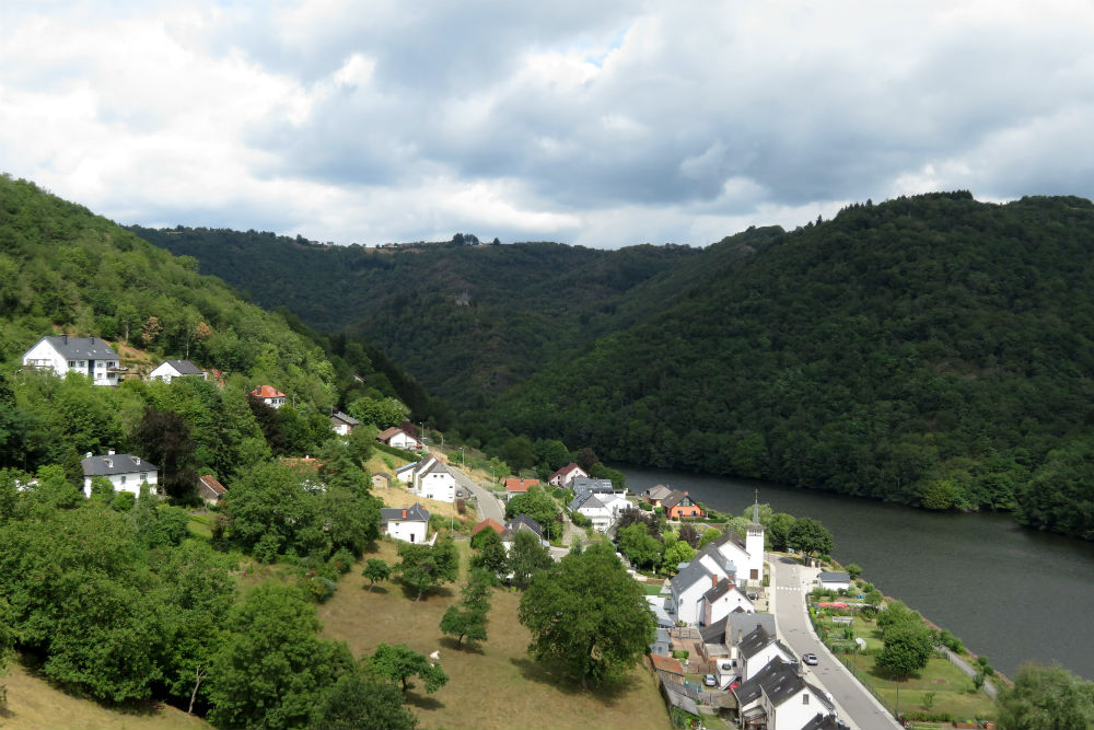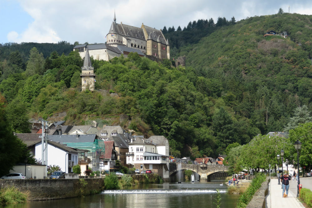 Mijn eerste stop was dus nog in Echternach zelf, best de moeite om even af te stappen. Daarna koos ik even voor de gemakkelijke optie. Ik had op mijn kaart een route uitgestippeld langs kleinere wegen maar omdat die grotere weg nog best meeviel, er bovendien een mooi fietspad langs liep en hij langs de rivier ging en dus potentieel wat minder zou klimmen bleef ik dus nog even in de vallei. Na 12 Km verliet ik dan toch de vallei om richting Beaufort te gaan voor het kasteel aldaar. Opvallend feit aan dat kasteel: terwijl kastelen in principe boven het dorp/de stad uittornen ligt het kasteel van Beaufort onder het dorp. Ik weet niet hoe die heer vroeger zijn dorpelingen beschermde, of zichzelf te aanvallen van bovenaf. Voorbij Beaufort ging het terug naar de vallei en richting Vianden. Ook Vianden heeft een kasteel en hier wel eentje dat boven de stad uitsteekt. Vianden is een behoorlijk toeristisch plaatsje waar ik toch wel even rondgelopen heb maar tot boven aan het kasteel ben ik niet geweest. Ik heb er wel die pannenkoek gegeten die ze me een tijdje geleden niet wilden bestellen. Het is wel geen zoete pannenkoek geworden maar een “jambon et fromage”, een beetje croque pannenkoek dus. Door niet goed op de kaart te kijken en de wegwijzer richting Clervaux te volgen, kwam ik ook bij het verlaten van Vianden op de grotere weg door de vallei. Ik besloot dan ook deze keer maar op die weg verder te gaan, hij was potentieel zelfs wat korter en vrij zeker met minder klimwerk. Bovendien viel de drukte heel goed mee. Een heel stuk verder stond er echter een “route barrée” en een omleiding naar Clervaux aangegeven. Ik besloot echter vol te houden en nu ook niet meer van mijn route af te wijken, als goede Belg onder het moto het zal wel gaan. Toen ik effectief aan de barrée stond waren ze daar inderdaad met de voorbereidingen voor een nieuw wegdek bezig, het was ook wel nodig, maar vandaag even niet en voor een fiets was het nog goed genoeg. Een stukje verder kwam ik overigens nog 2 bepakte fietsers uit de andere richting tegen en die bevestigden “es geht gut”. Zo “gut” ging het voor mij echter niet, voor mijn volgden nog 4 Km behoorlijk klimmen met daarna nog een oplopende plateau. Uiteindelijk kan je de slechte weg wel beter in de bergop hebben dan in de afdaling, wanneer de snelheid in principe toch een stuk hoger ligt. Ik kwam dus goed in Clervaux, waar ze ook weer een kasteel hebben. Voorbij Clervaux bespaarde ik me nog een 5 Km door niet de wegwijzer naar Troisvierges te volgen maar deze keer wel voor de kleinere wegen te kiezen.