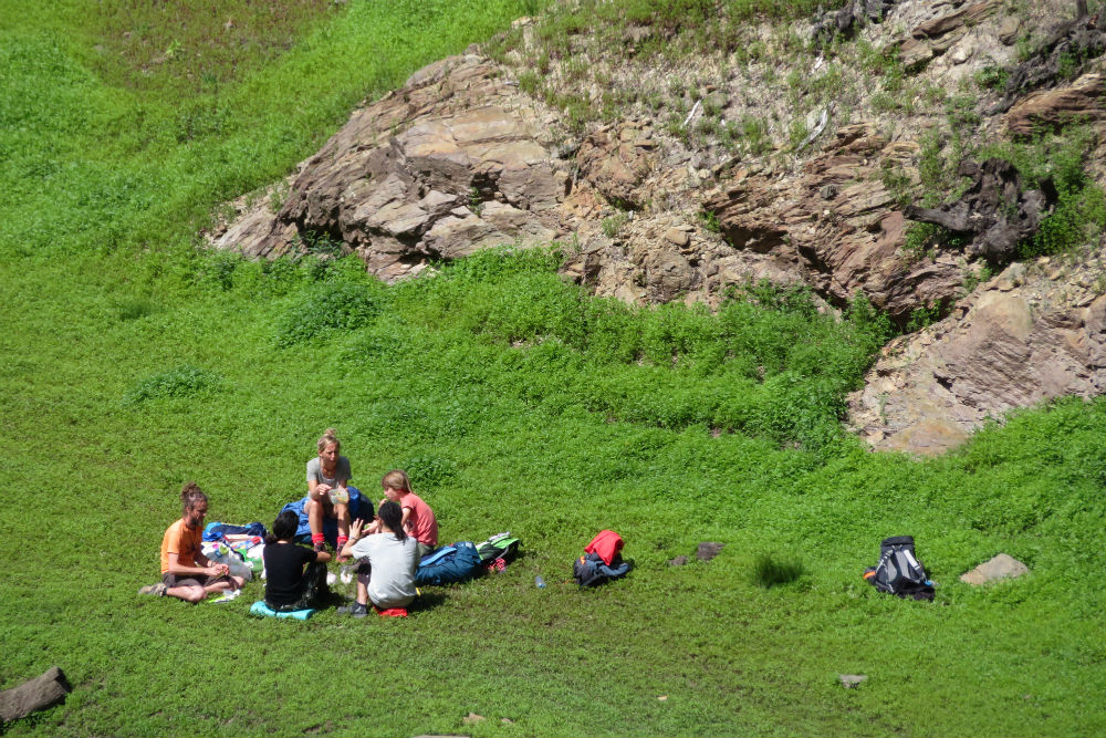 Er is hier vannacht ook een groep jonge Aziaten, vermoedelijk Japanners of Koreanen, gepasseerd. Toen ik vanmorgen langs hun standplaats passeerde hadden ze al ingepakt en stonden ze klaar om te vertrekken in hun zeven of acht minibusjes, ik heb dus niet gezien hoe of in wat soort tentjes ze kampeerden. Ik heb ze wel aan de afwas gezien met gigantische pannen, zowat type paella pannen.