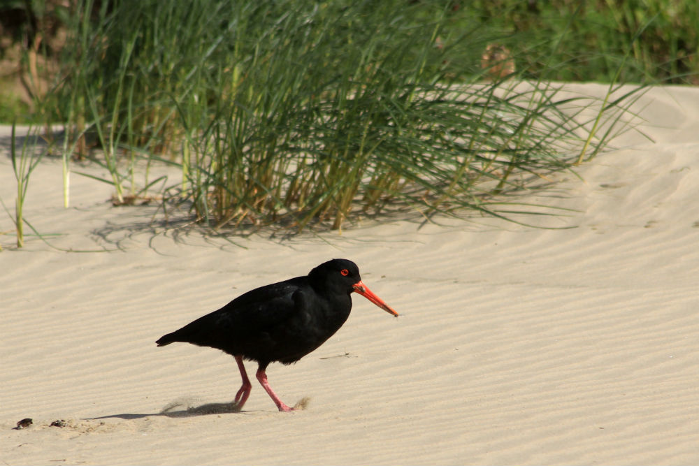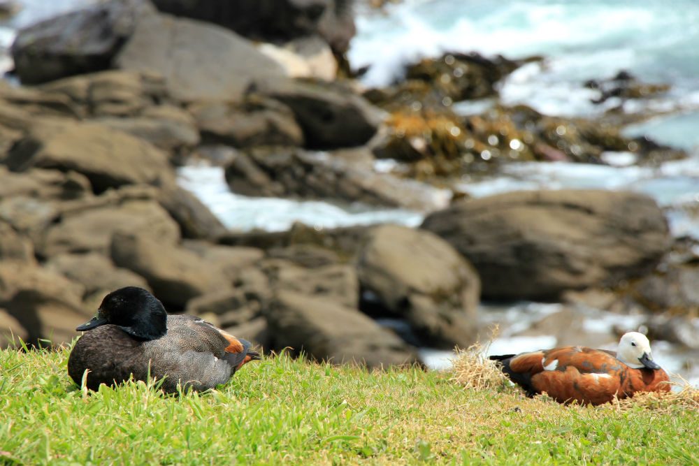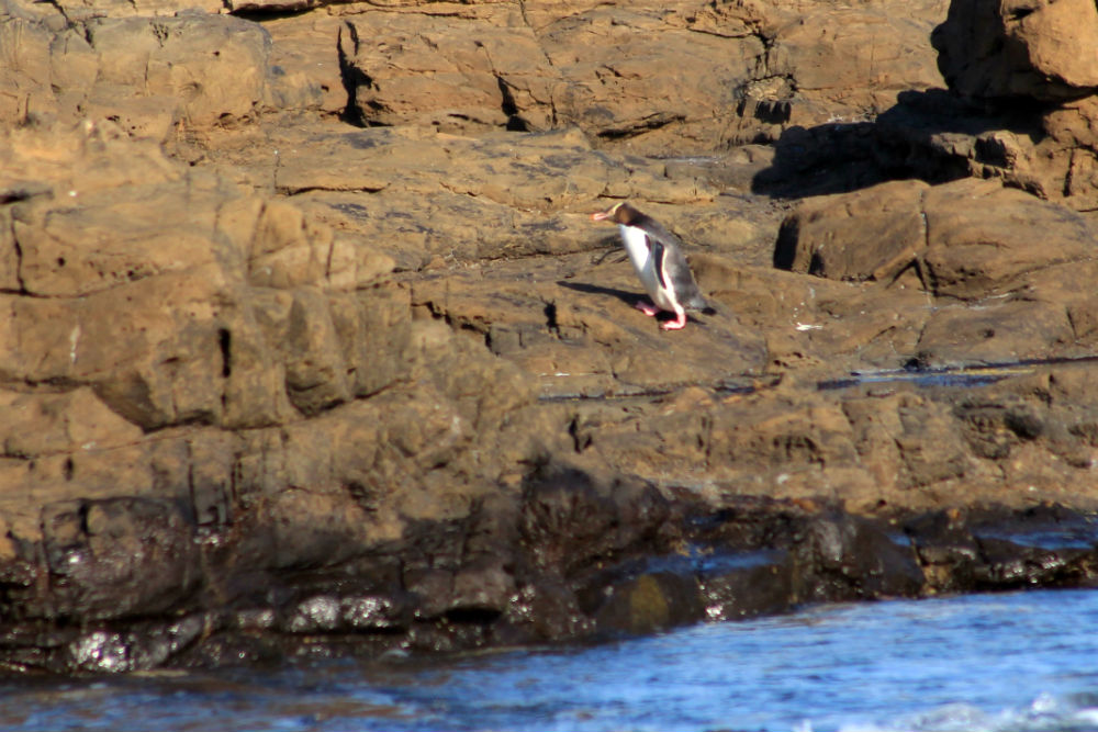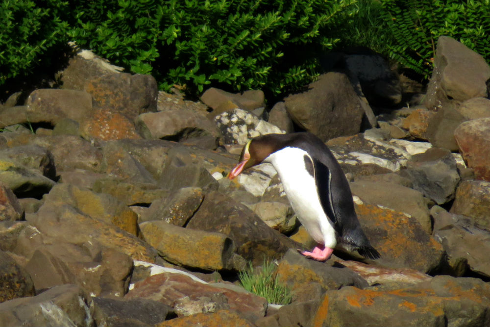 Dolfijnen heb ik niet te bieden maar wel een pinguïn. Het betreft een “Yellow-eyed” pinguïn die enkel in Nieuw Zeeland voorkomt en ondertussen erg zeldzaam is, er zouden er nog maar een 3.000 resteren over heel Nieuw Zeeland. Hier in de buurt zitten een paar koppels, terwijl de ene het nest bewaakt gaat de andere de hele dag op zee om te jagen en komt dan ’s avonds terug. Het is dan zaak om op de juiste moment op de juiste plaats te zijn. De juiste plaats is niet zo moeilijk aangezien dat steeds dezelfde plaats is en dus ook bekend is. De juiste moment, zo werd me gezegd, zou omstreeks half acht zijn maar ik besloot alvast goed op tijd te gaan. Dat was ook best want deze was er een stuk vroeger en ik wachtte daarna nog zowat anderhalf uur op een volgende maar die kwam maar niet dus heb ik het uiteindelijk opgegeven.