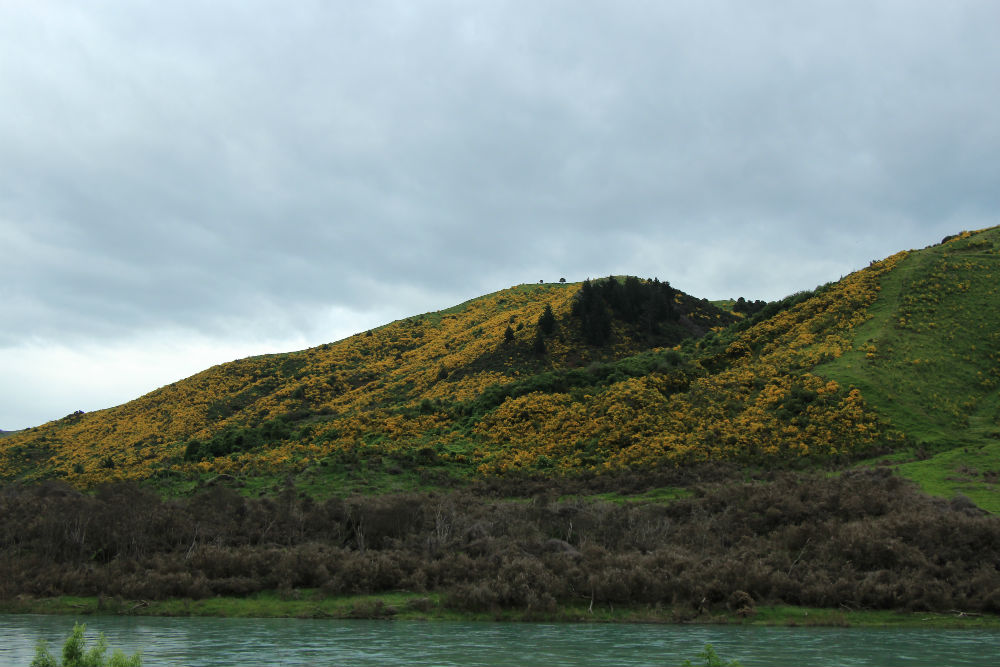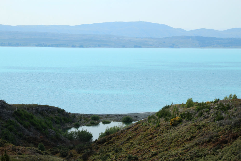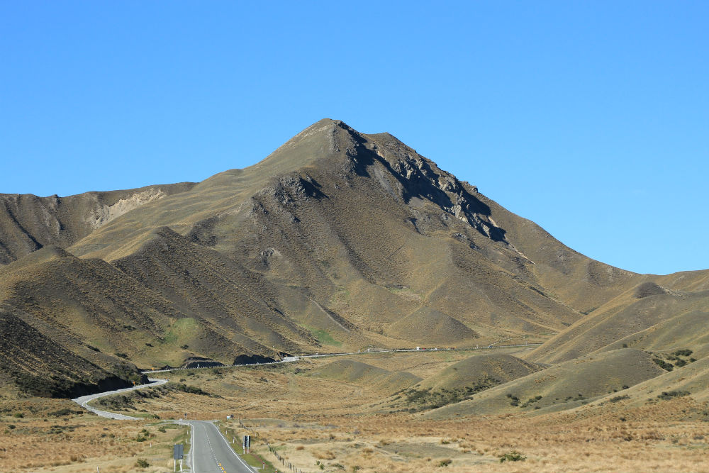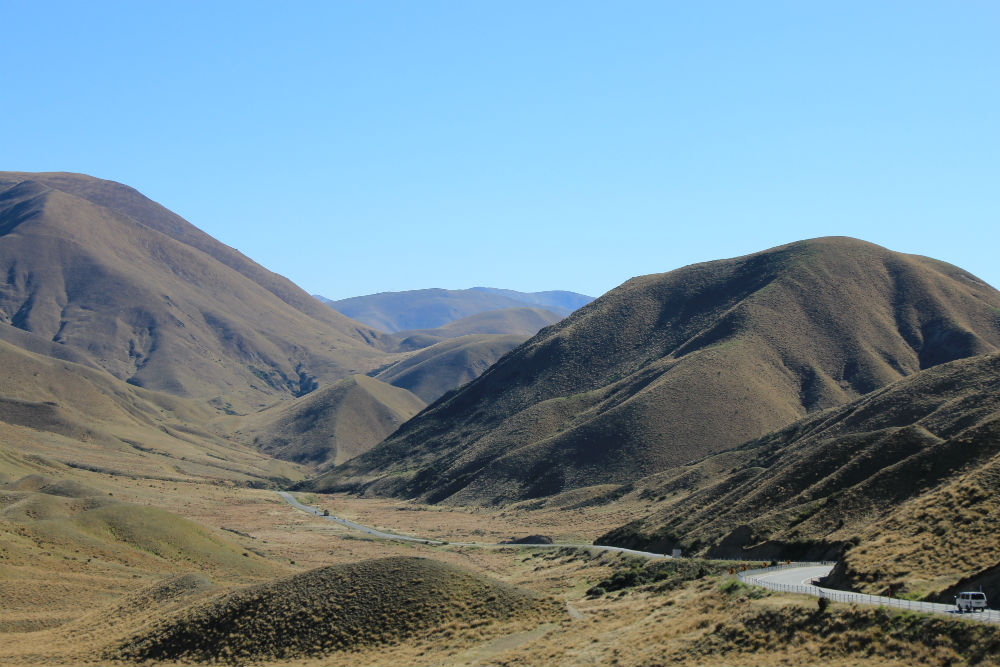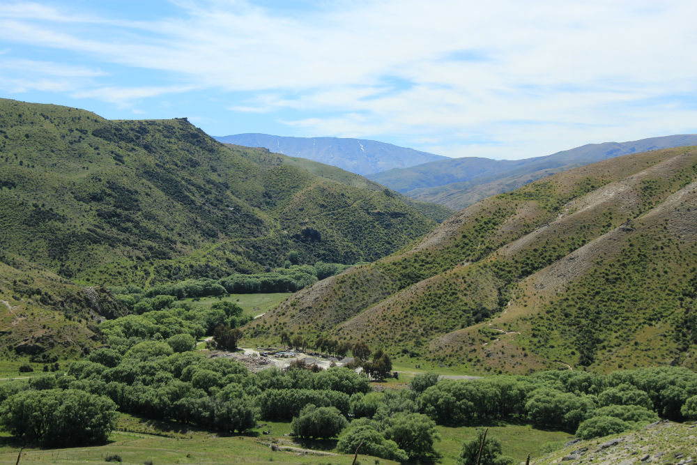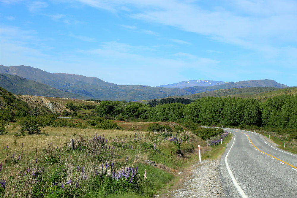 De route ging vandaag gewoon verder over dezelfde weg, Nr 8, door de brede vallei. Dat heeft me tot dusver het meeste verbaasd in Nieuw Zeeland, de uitgestrekte vlaktes hier. Die had ik niet zozeer verwacht, ook al gaan de vlaktes niet altijd helemaal vlak. Soms lijkt het wel wat alsof je door de prairie rijdt.