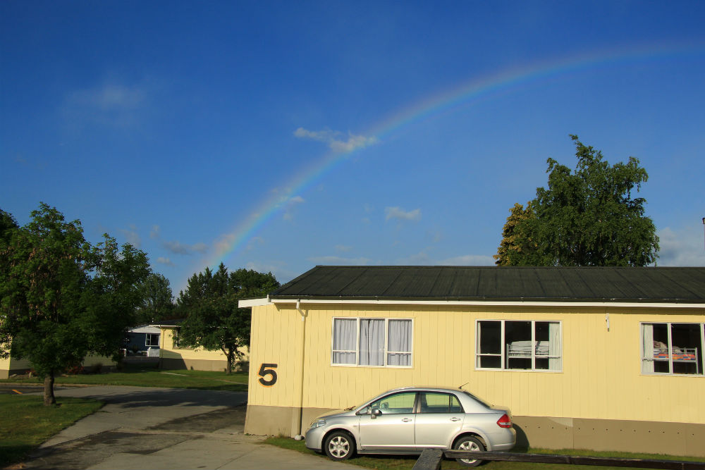 Kort voor de middag kwam inderdaad de beloofde regen, een gezapige regen die wat wisselde in intensiteit maar nooit echt dramatisch werd. Op mijn eindbestemming, Balclutha, was ik origineel van plan van de backpackers op te zoeken maar vanwege de regen besloot ik toch maar de meerkost te doen en naar een motel te gaan, daar heb ik toch wat meer plaats voor wat natte spullen. Bovendien moest ik er niet zo voor zoeken, ze ligt gewoon langs de weg.
