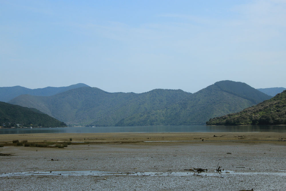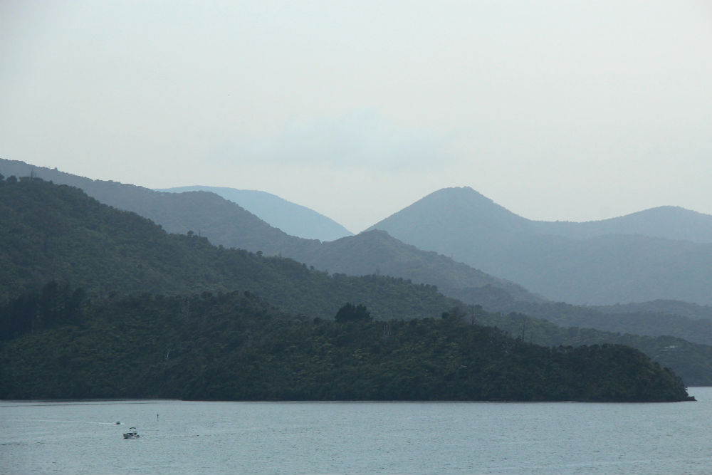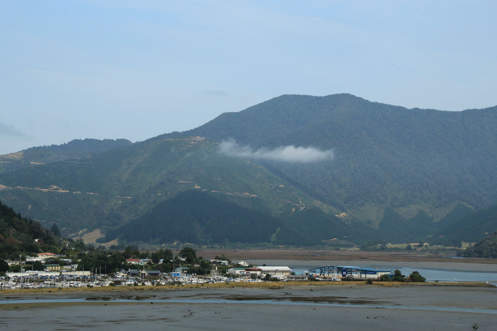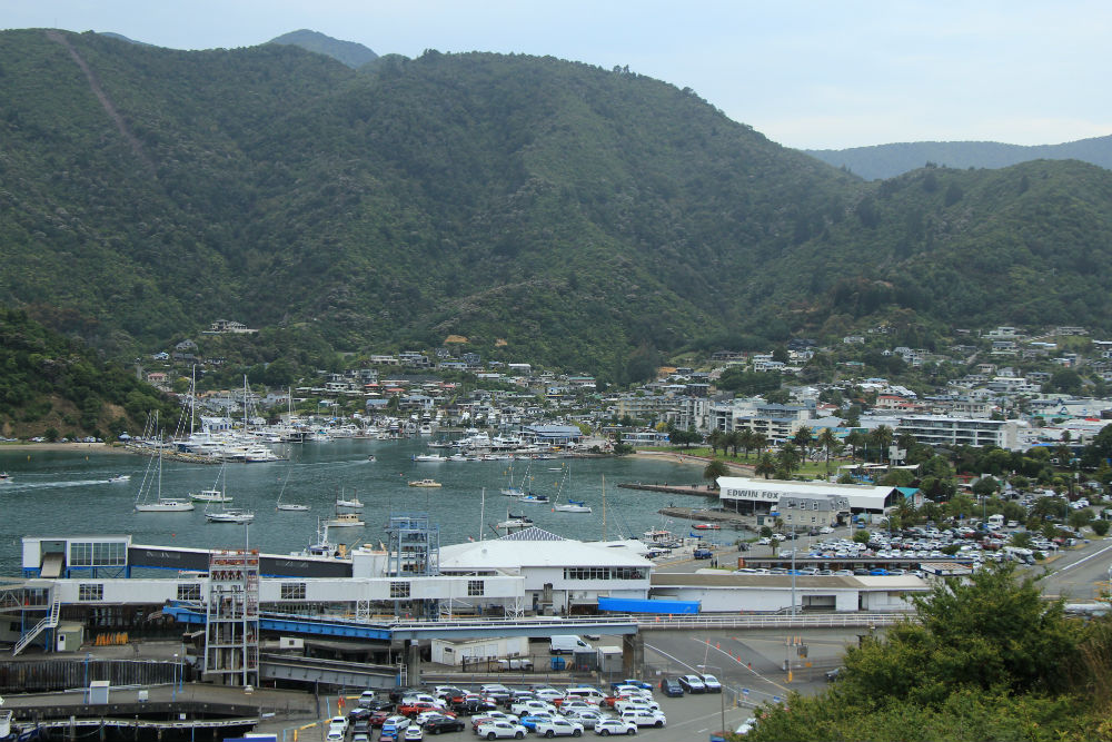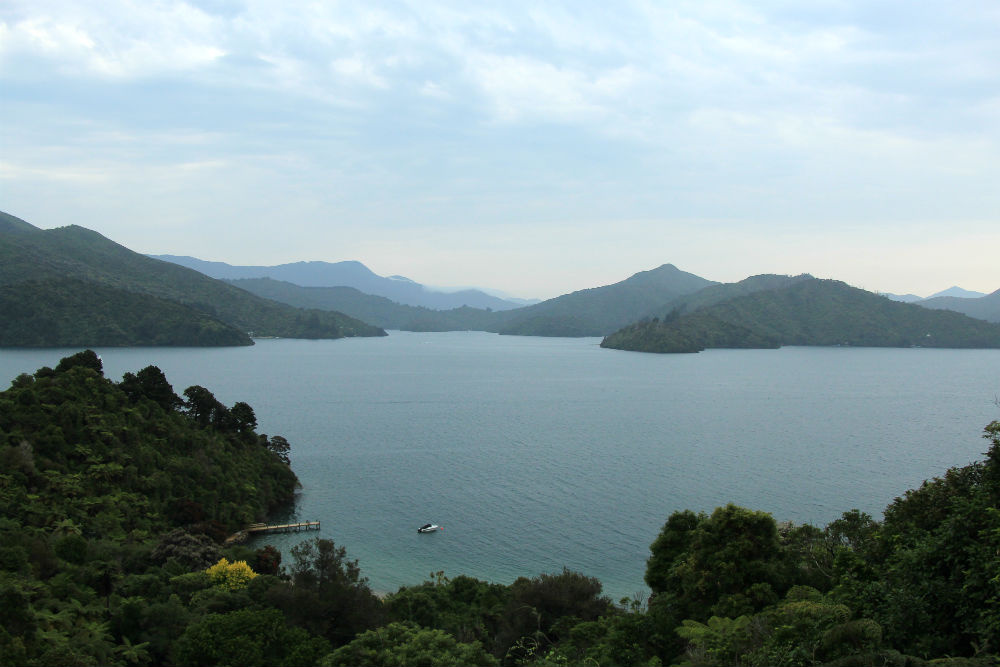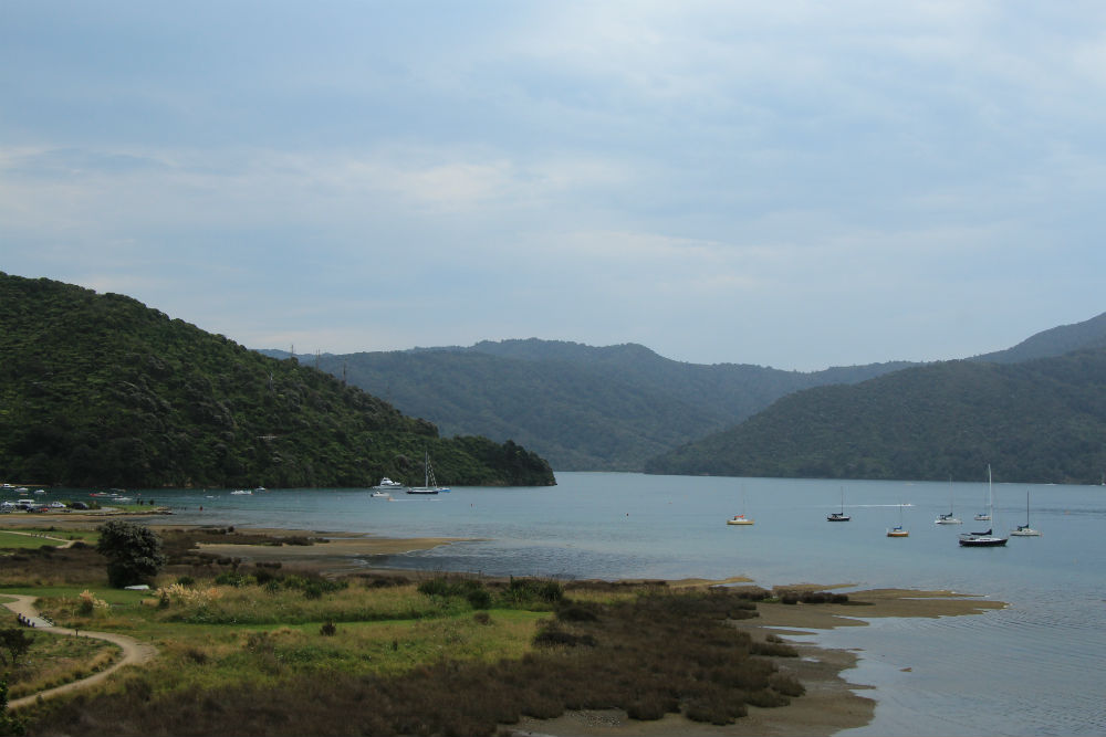 Pas bij het vertrek vandaag, bergop, werd duidelijk hoe mooi de omgeving van Havelock eigenlijk wel is. Boven op het bergje ging ik nog even te voet verder naar een uitkijkpunt. Toen ik terug bij mijn fiets kwam heb ik de “lange laag” toch maar terug uit gedaan, het was toch alweer behoorlijk warm aan het worden. Toch zou het de hele voormiddag overwegend bewolkt blijven en soms toch vrij fris zijn. Na het uitzichtpunt ging het nog even verder langs de fjord om dan over te steken naar een volgende, die ik dan weer zou volgen tot Picton.