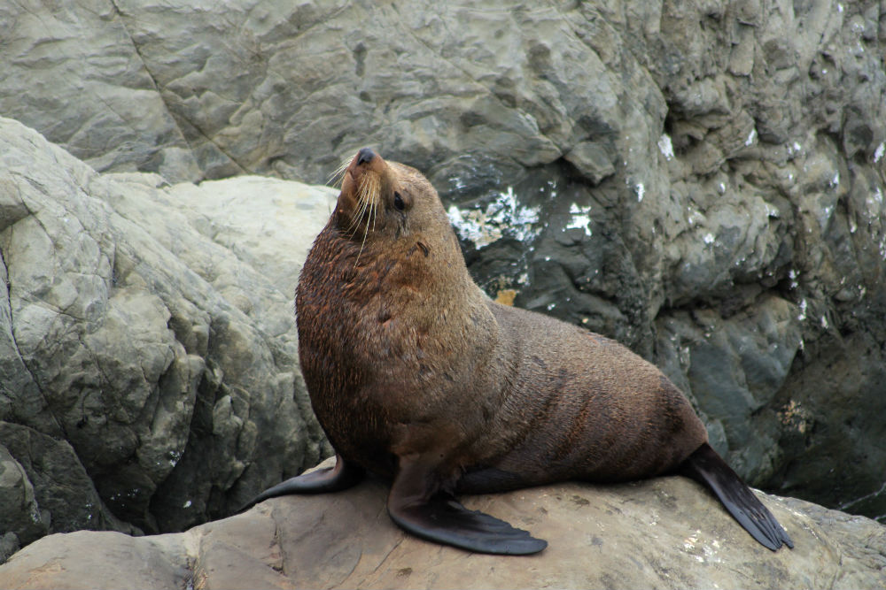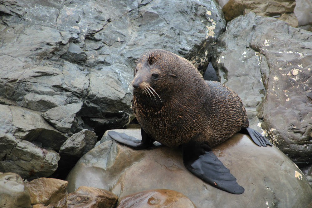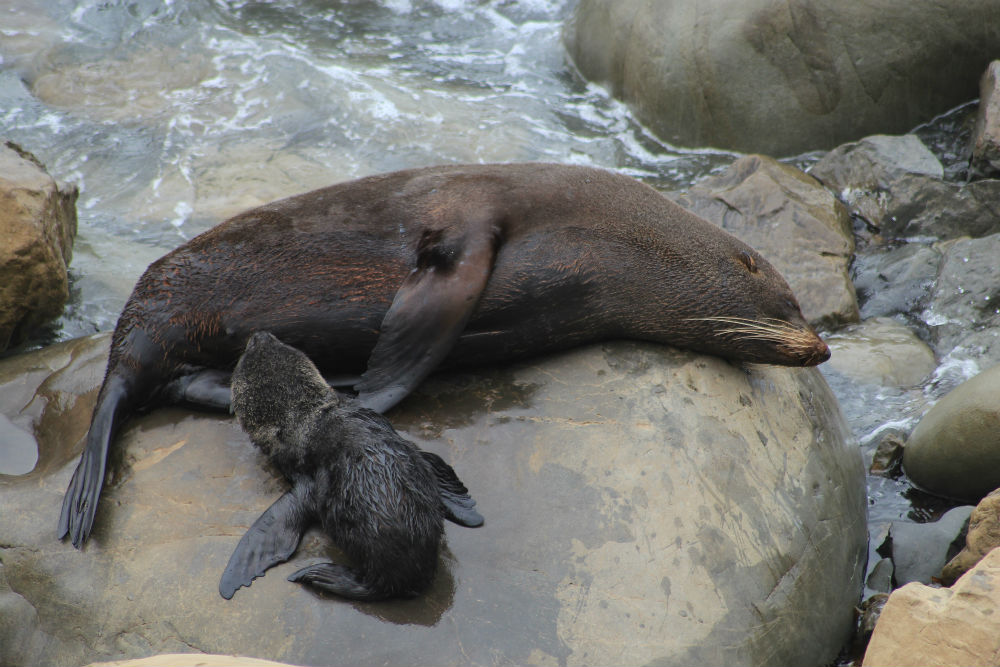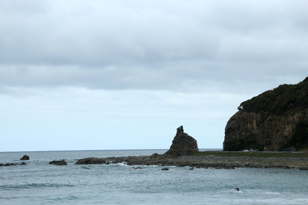 De route ging verder over de SH 1, nog steeds mooi maar ook nog steeds behoorlijk druk. Na 10 Km bereikte ik terug de zee en de rest van de rit zou verder gaan tussen zee en heuvels. Een goede 5 weken geleden was ik blij een paar zeeleeuwen te zien op het strand, nu leken ze onderweg met een paar honderd op de rotsen te liggen maar schijnbaar gaat het hier om zeehonden. Het verschil is niet altijd duidelijk.