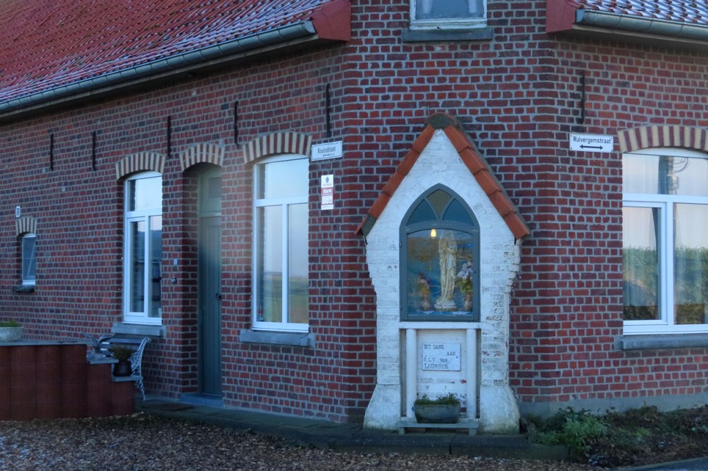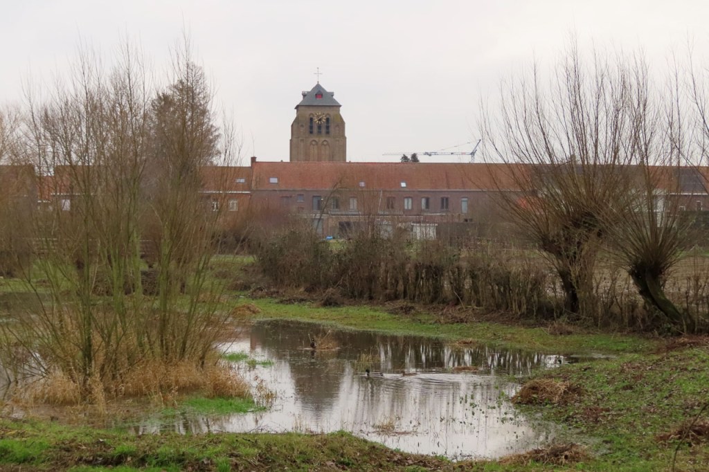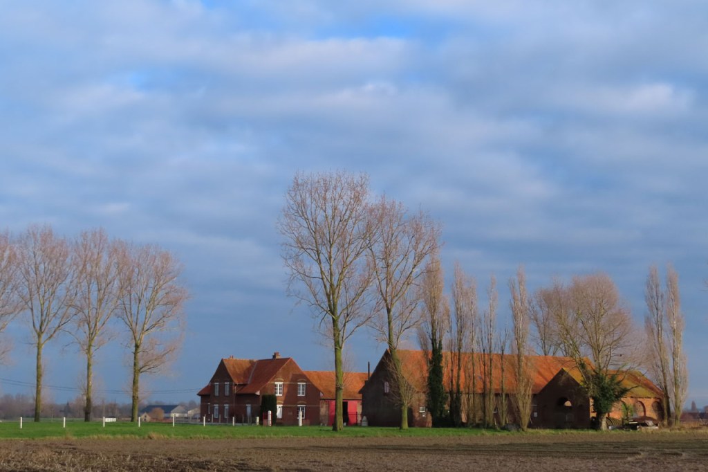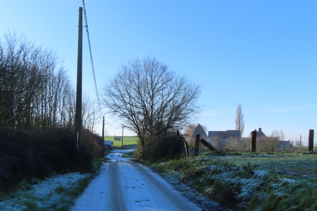 Weer een stevige vriesnacht gehad maar het was vandaag wel erg mooi en dus nam ik deze keer toch terug de fiets. Ik zou me weer laten leiden, ik vertrok naar Voormezele om daar aan te sluiten op de West-Vlaamse Bergen route. Af en toe, in de schaduwzones, bouwde ik wel wat extra voorzichtigheid in. Tegen Kemmel kwam ik dan plots toch in de mist terecht. Ik dacht aanvankelijk dat het maar iets lokaal zou zijn maar hij werd alleen maar dichter en dus verliet ik in Westouter maar de route om rechtstreeks richting Ieper te rijden. Gelukkig heb ik wel licht op deze fiets, ik zag ook nog enkele wielertoeristen zonder en die waren amper zichtbaar. Anderzijds zag ik overigens ook wel enkele auto’s zonder licht.