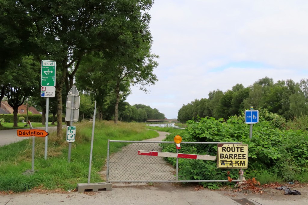 De rit ging veel langs het water. Ik kwam wel een paar keer het typische verschijnsel tegen dat de weg afgesloten was zonder verdere aanwijzingen. De eerste keer kostte het me wat extra kilometers voor ik het spoor terug gevonden had. Een tweede keer bleek er wel een omleiding te zijn al was die niet overal even duidelijk, al zeker niet in het begin. In Doornik was er ook nog een kleine situatie maar die is er al jaren en die kende ik al, ik passeerde er al wel eens meer. Ik moest ook een paar onaangename voetgangers-/fietsbruggen over. Ze waren al even bangelijk om terug naar beneden te komen als lastig om er op te raken. Bij een volle bepakking zou me er niets gerest hebben dan afladen en enkele keren heen en weer te gaan.