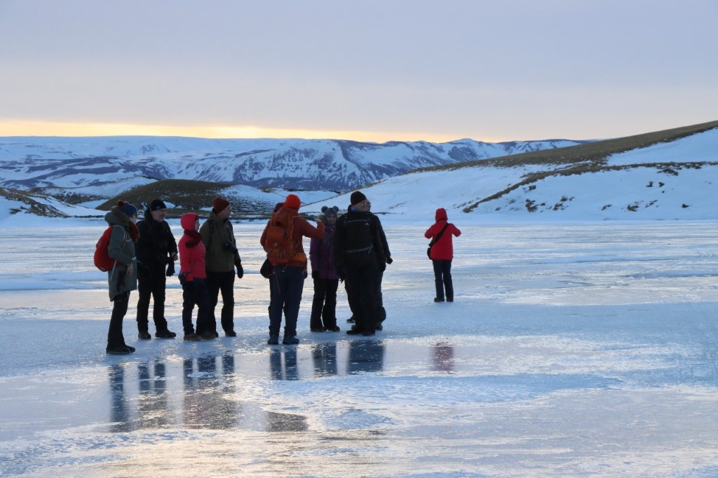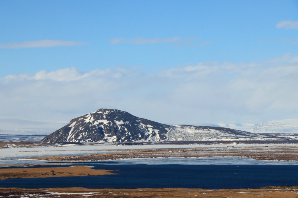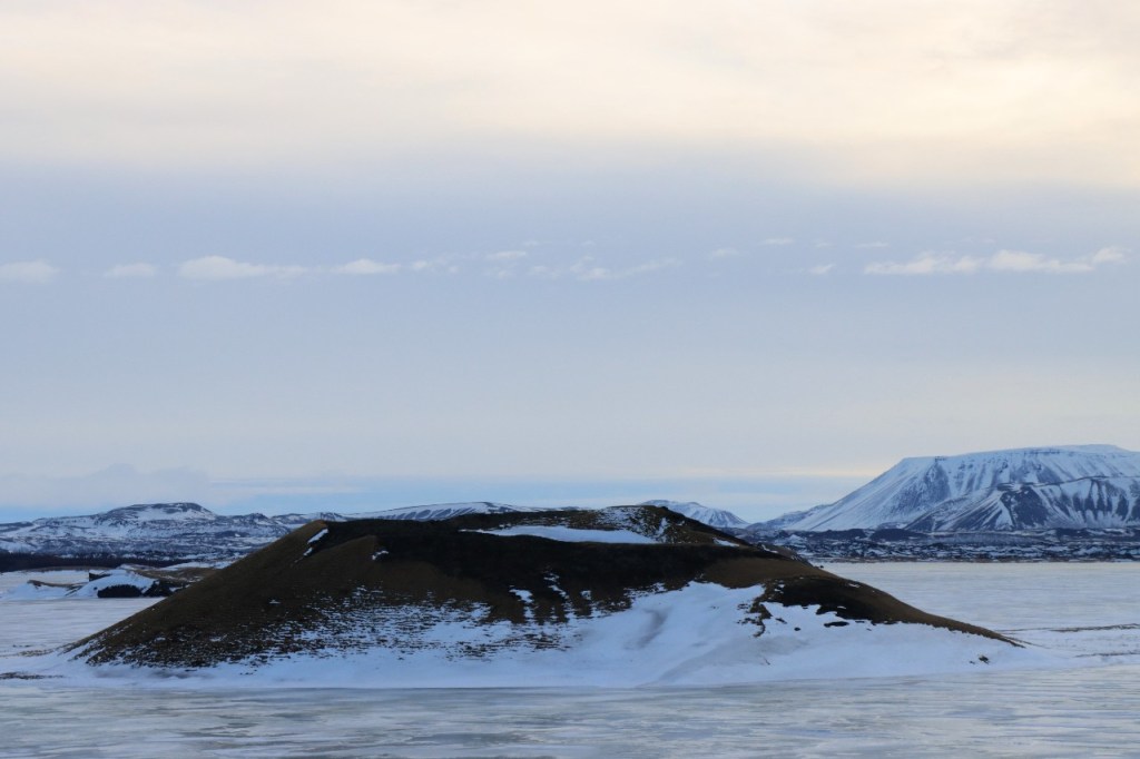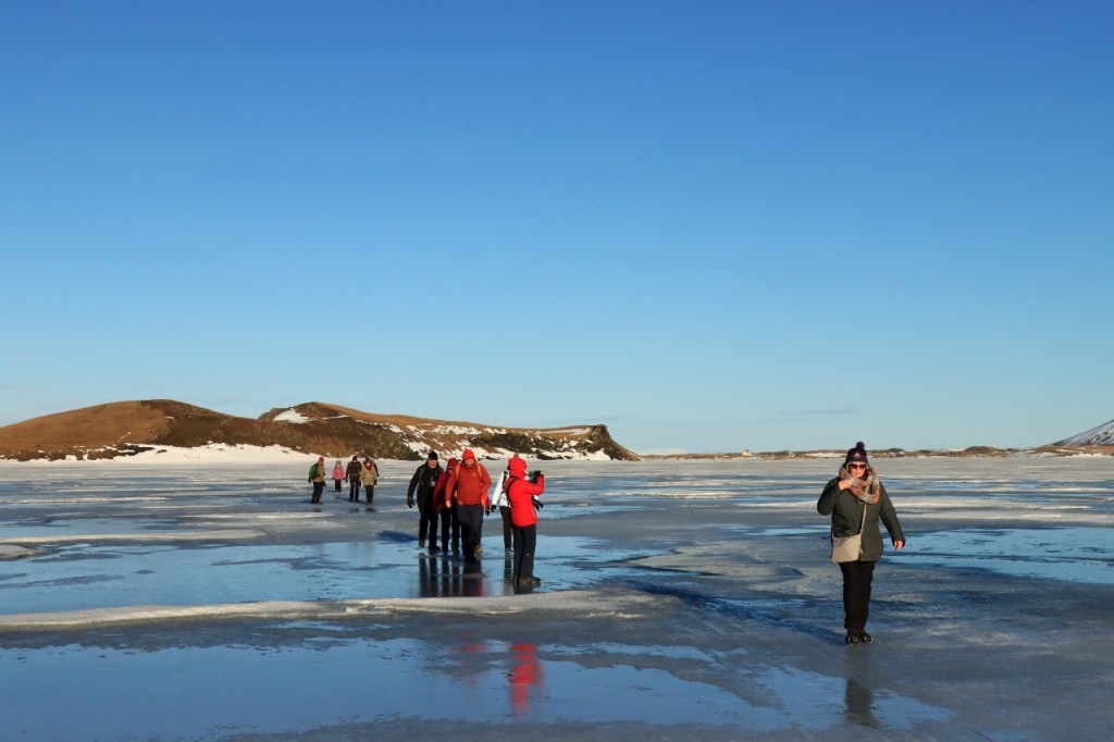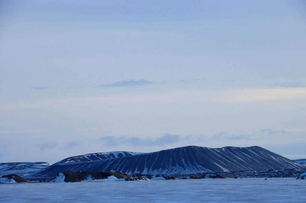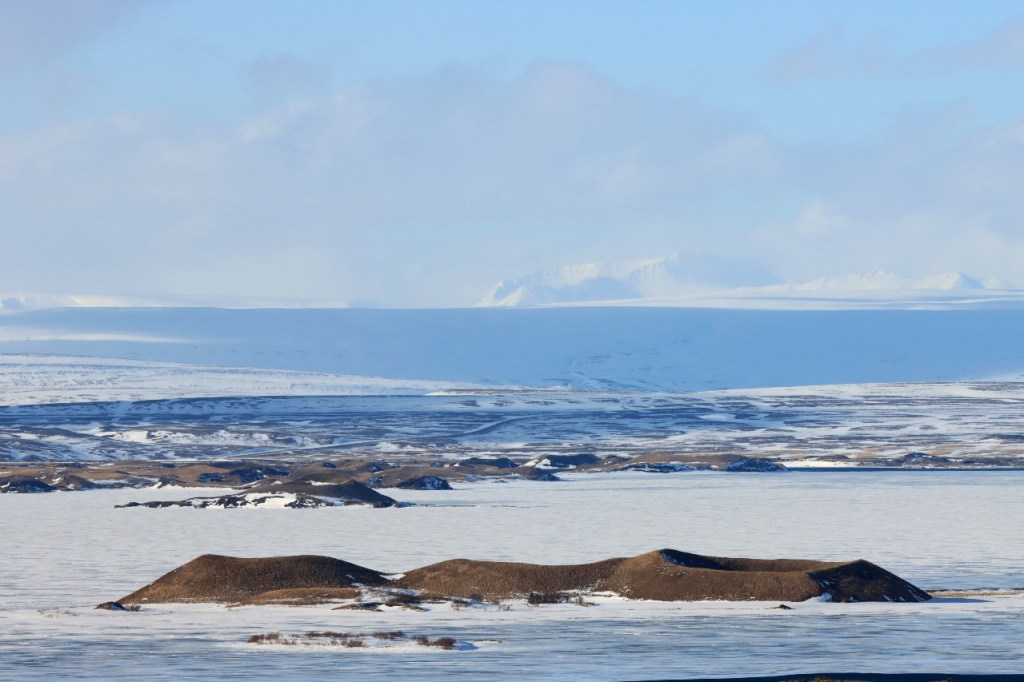 We begonnen de dag met een wandeling op het water 😉 , op het bevroren meer dus. Het voelt een beetje tegen het instinct om te wandelen op smeltend ijs maar onder die wat smeltende bovenlaag zit natuurlijk nog wel ruim een halve meter. Gisteren werden er, terwijl wij weg waren, nog paardenraces gehouden op het ijs. Na het ijs wandelden we voor de middag nog op de vulkaan.