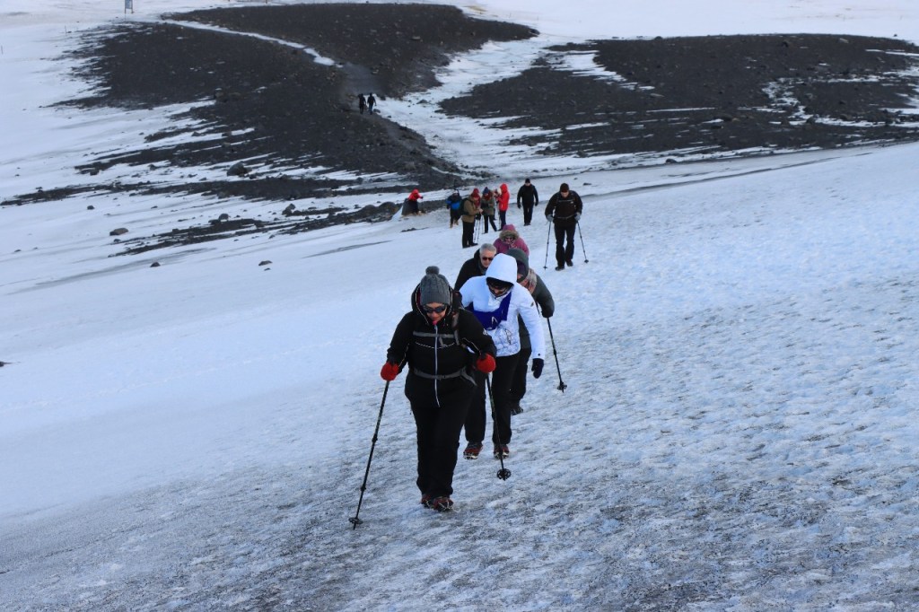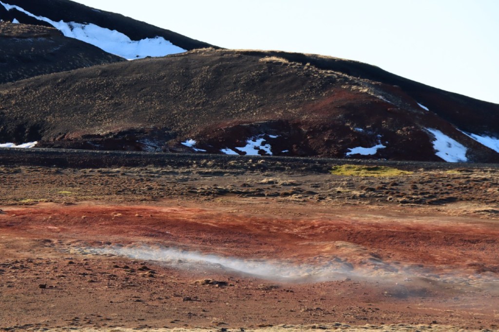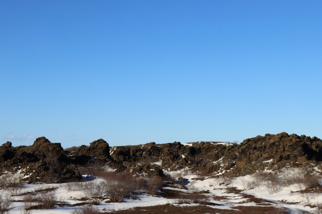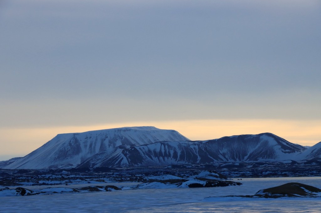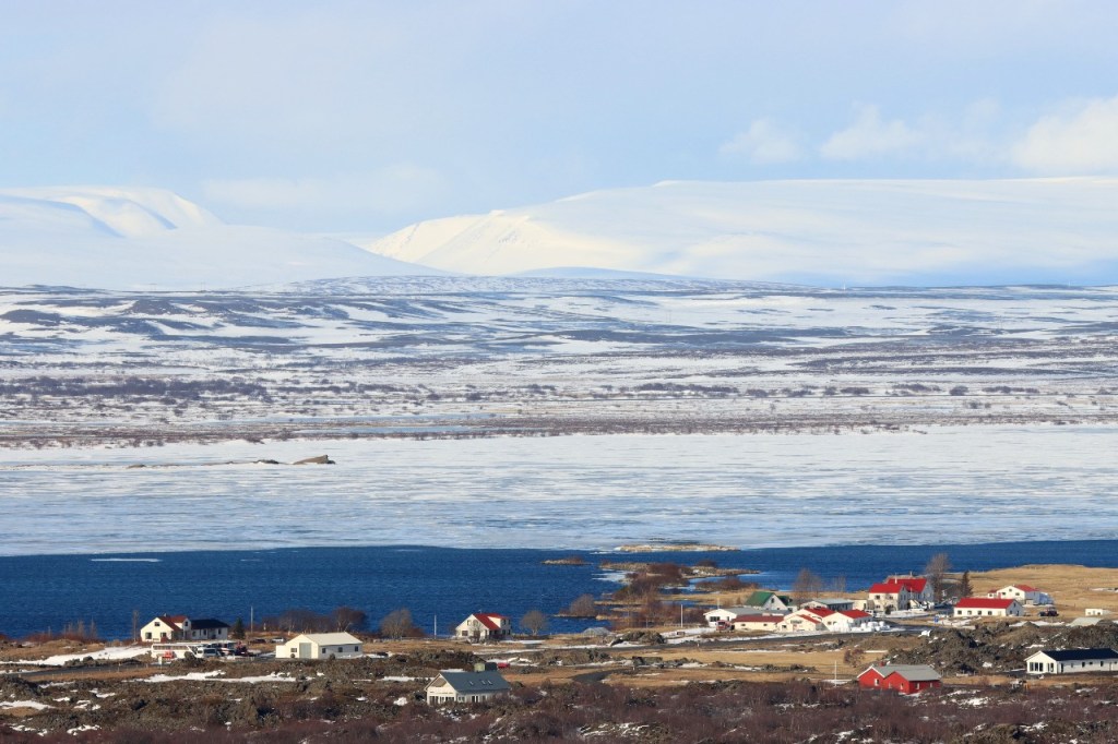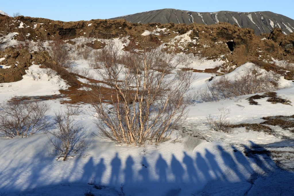 We begonnen de dag met een wandeling op het water 😉 , op het bevroren meer dus. Het voelt een beetje tegen het instinct om te wandelen op smeltend ijs maar onder die wat smeltende bovenlaag zit natuurlijk nog wel ruim een halve meter. Gisteren werden er, terwijl wij weg waren, nog paardenraces gehouden op het ijs. Na het ijs wandelden we voor de middag nog op de vulkaan.
