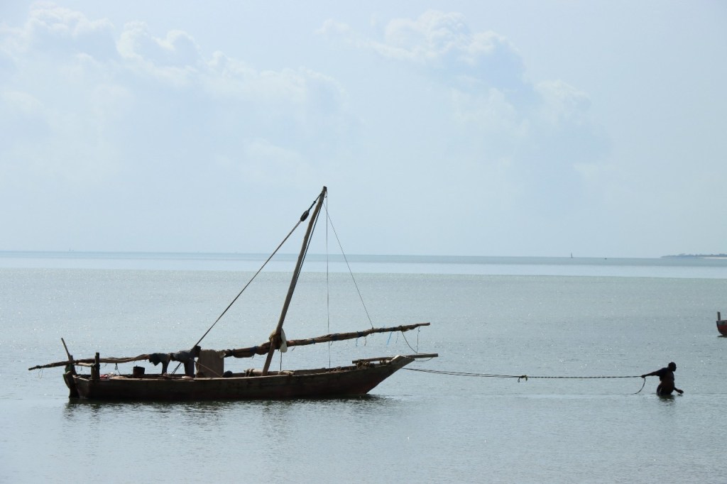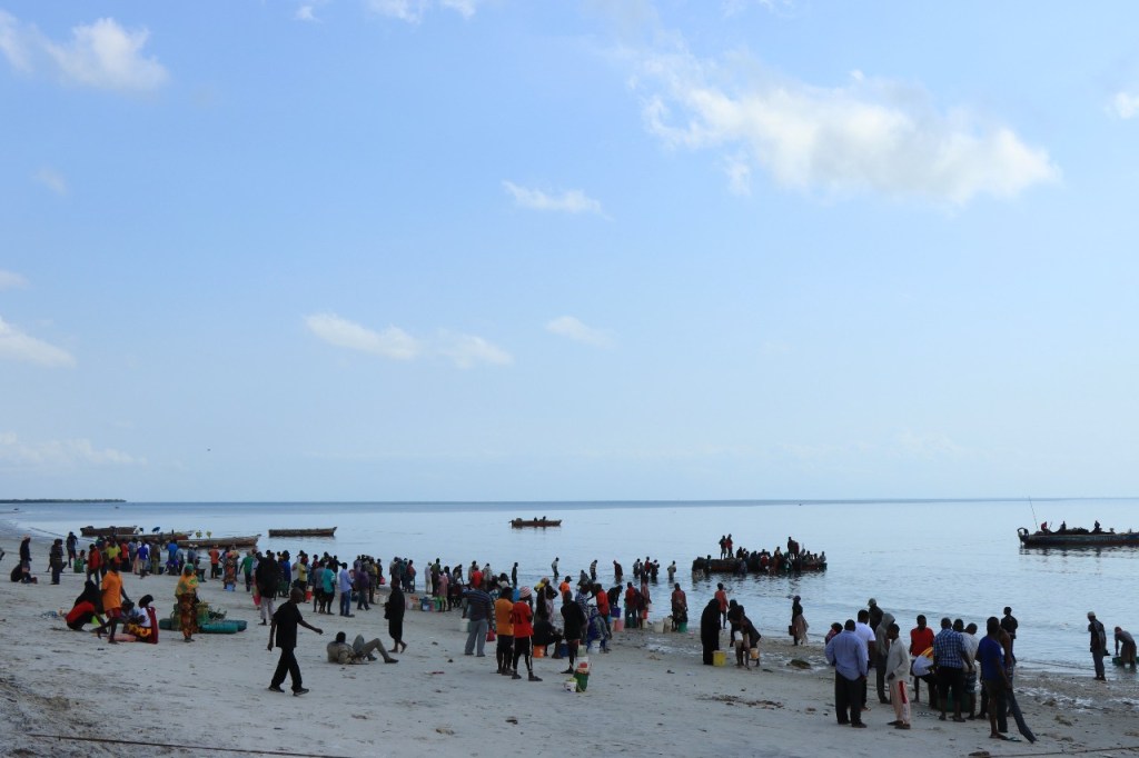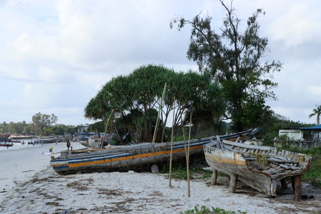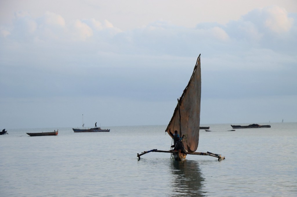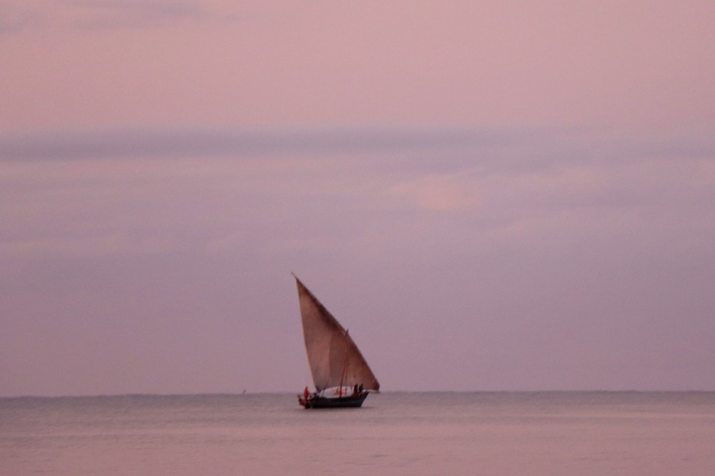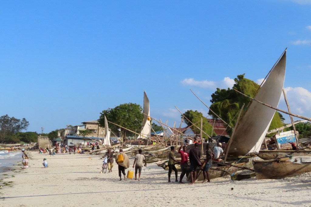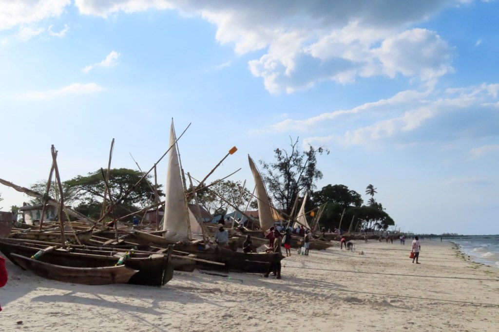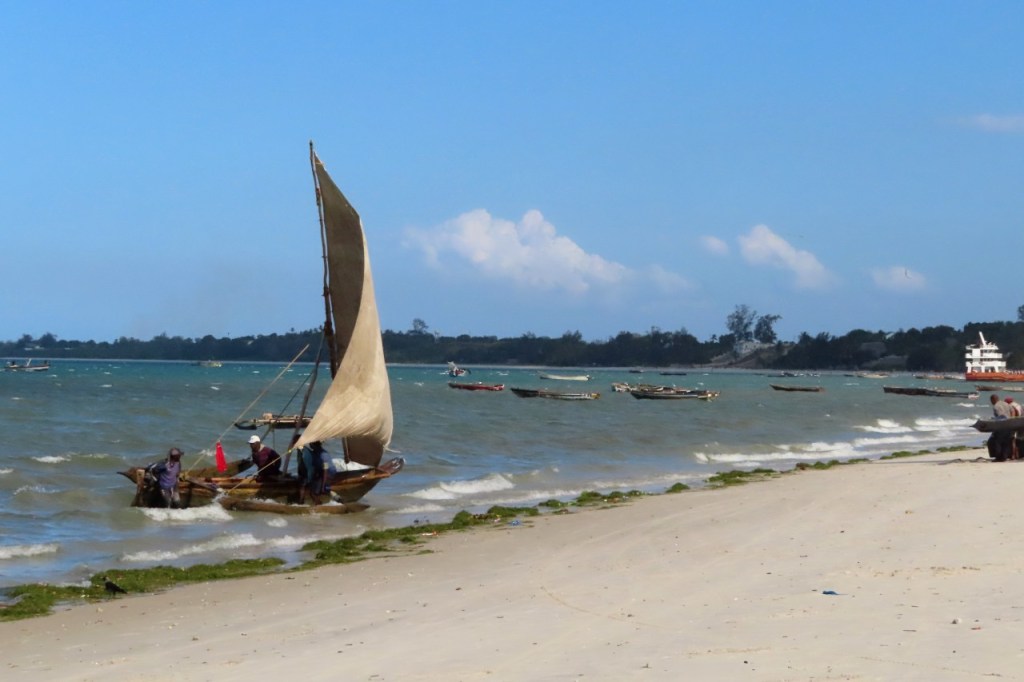 Wat vandaag nog betreft, die begon al vroeg met, samen met enkele anderen, een wandeling over het strand naar de vismarkt. Na het afscheid van de groep deed ik die wandeling nog eens over en ging dan verder door het oude Bagamoyo, een best interessante plaats. Het kruis merkt het einde van de slavenroute vanuit het binnenland. Van Bagamoyo werden ze overgebracht naar Zanzibar, vanwaar ze dan weer verscheept werden naar de Arabische wereld. De hitte van de dag liet ik passeren in de schaduw van de lounge, ondertussen mijn achterstand in posts wegwerkend. In de latere namiddag, er stond ondertussen een stevige zeebries, ging nog een derde keer richting vismarkt. De boten begonnen nu terug te keren.