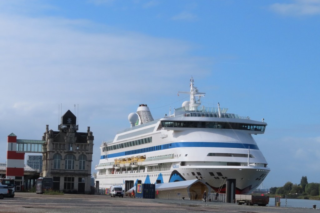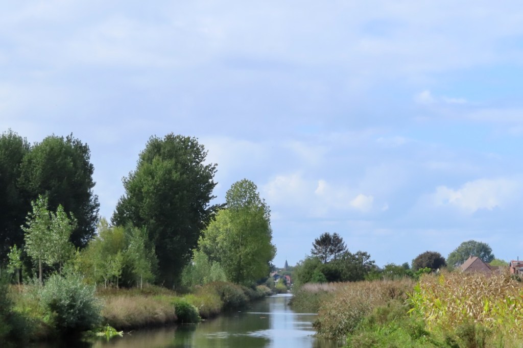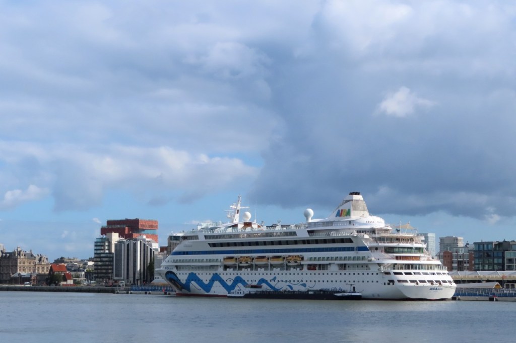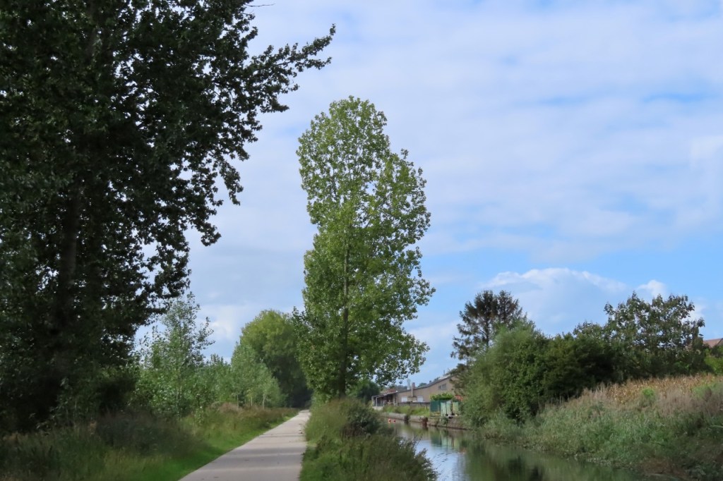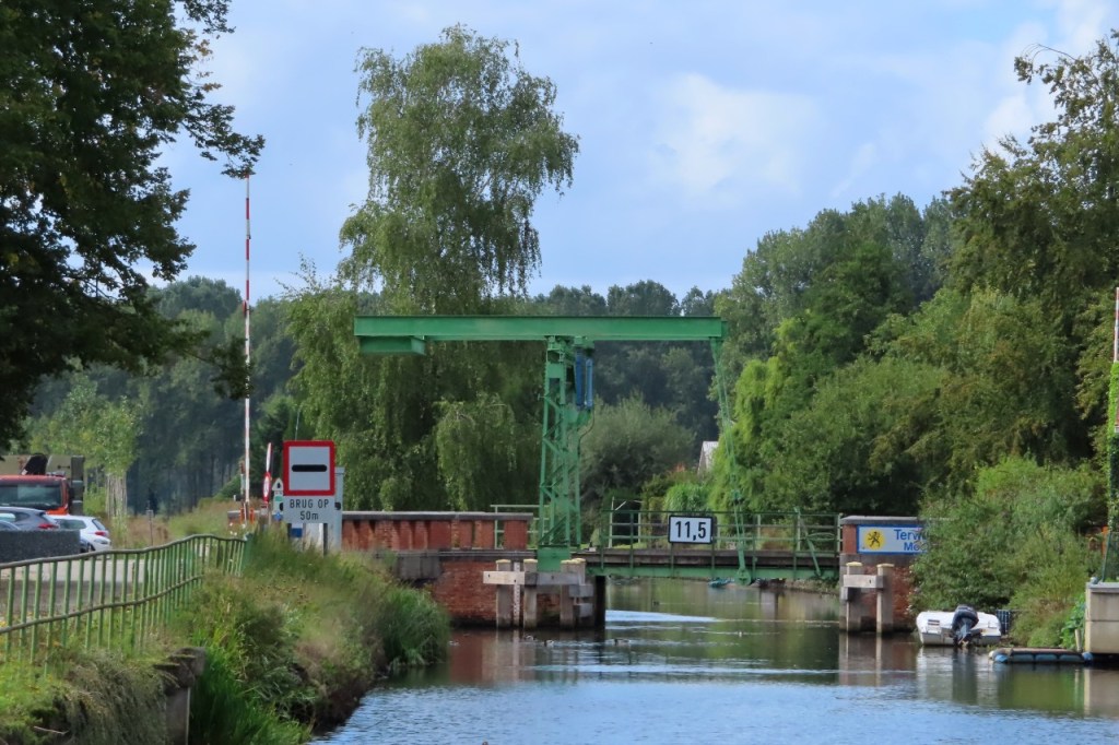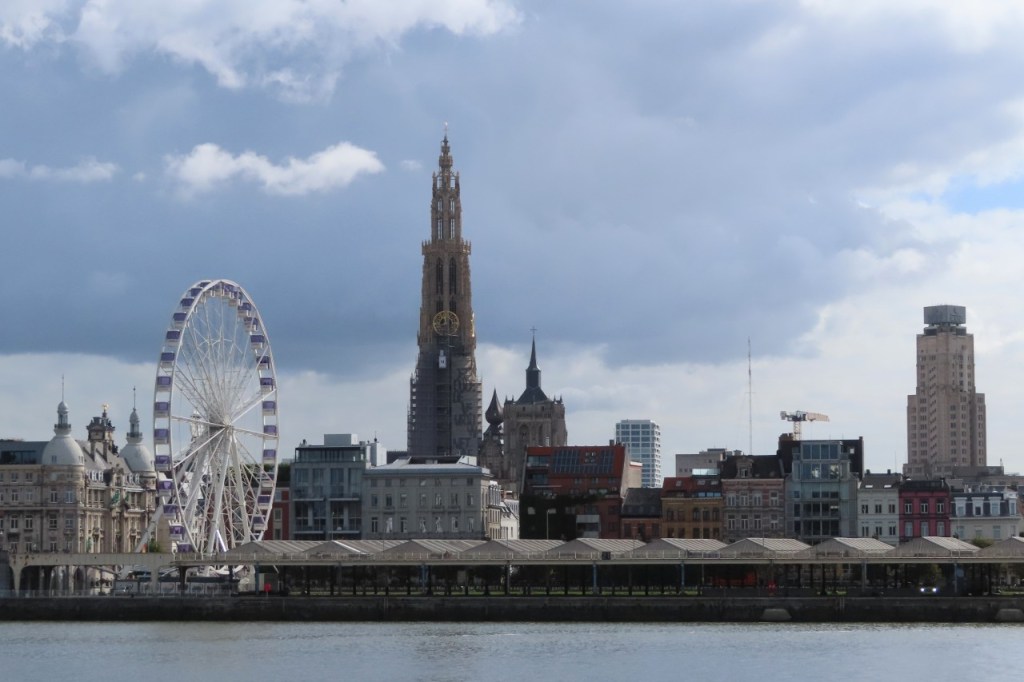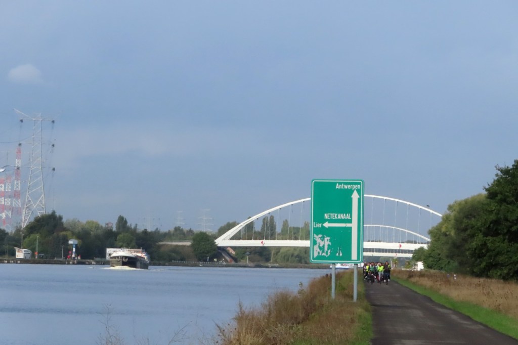 De randen van mijn fietsschoenen waren nog niet helemaal droog van zaterdag, toen ik ze vanmorgen aandeed. Vandaag schoven er al eens donkere wolken over maar ik zou het wel droog houden. De wind is niet gedraaid dit weekend en stond nu dus in het nadeel. In het begin viel dat nog redelijk mee, hij was niet zo krachtig als op de heenweg, maar naargelang de rit vorderde ging ik hem beter voelen en tegen dat ik de Moervaart bereikte vond ik hem al best vrij stevig. Dat ik de Moervaart bereikte betekent dus dat ik weer mijn oude route nam om weer te keren. De lift aan de Sint-Annatunnel is nog steeds in renovatie maar de trappen waren wel al terug operationeel en dus deed ik die oude route nog eens helemaal als vroeger, over Linkeroever. Aan de kant van Linkeroever werkte de lift ook al terug trouwens.