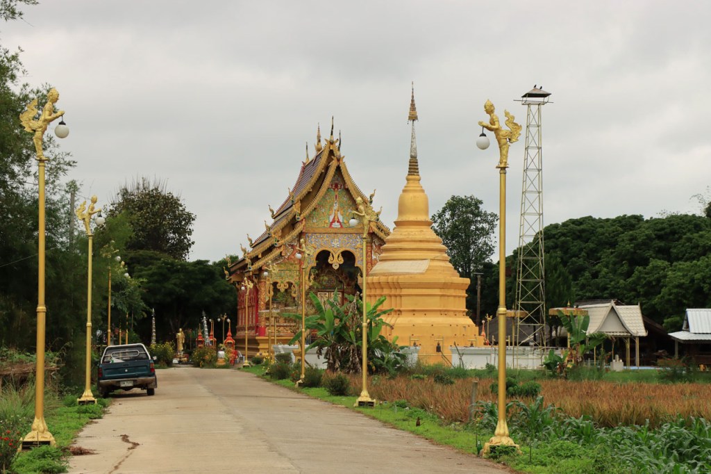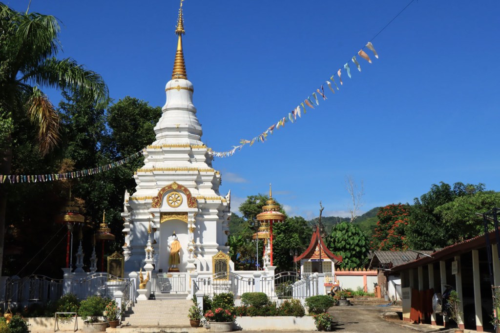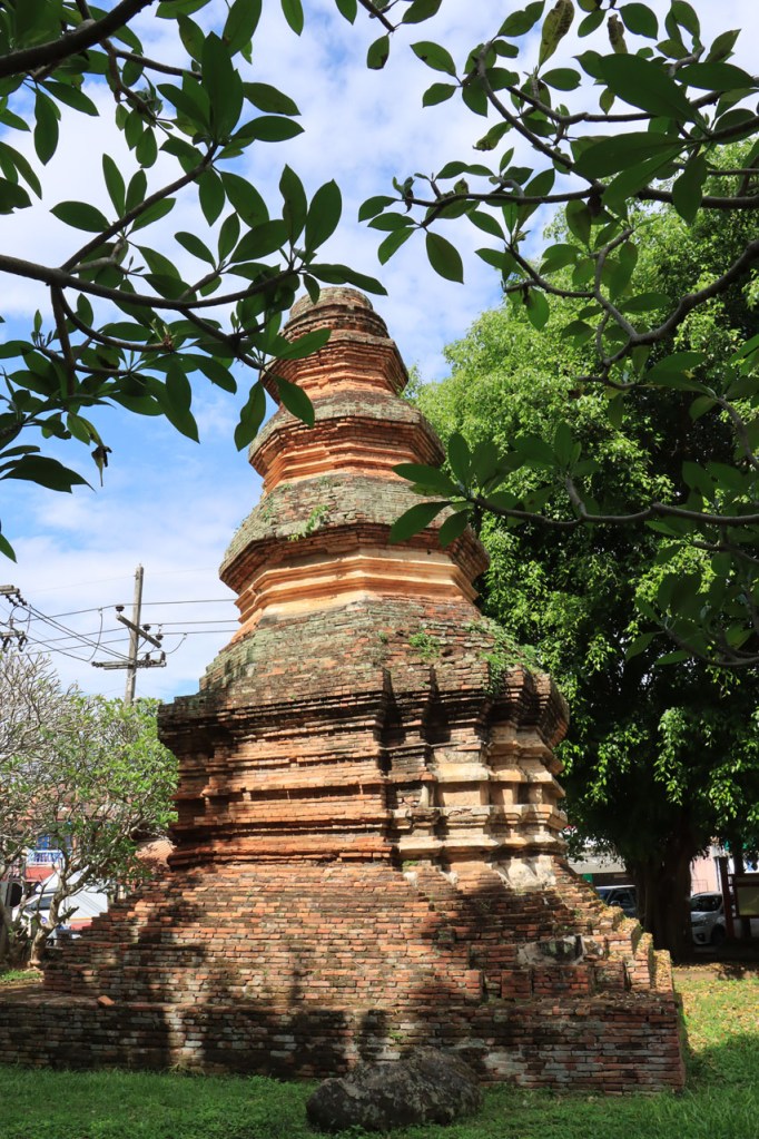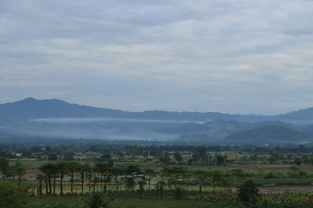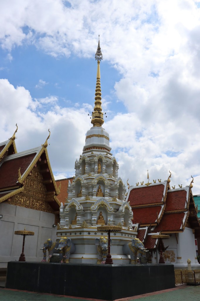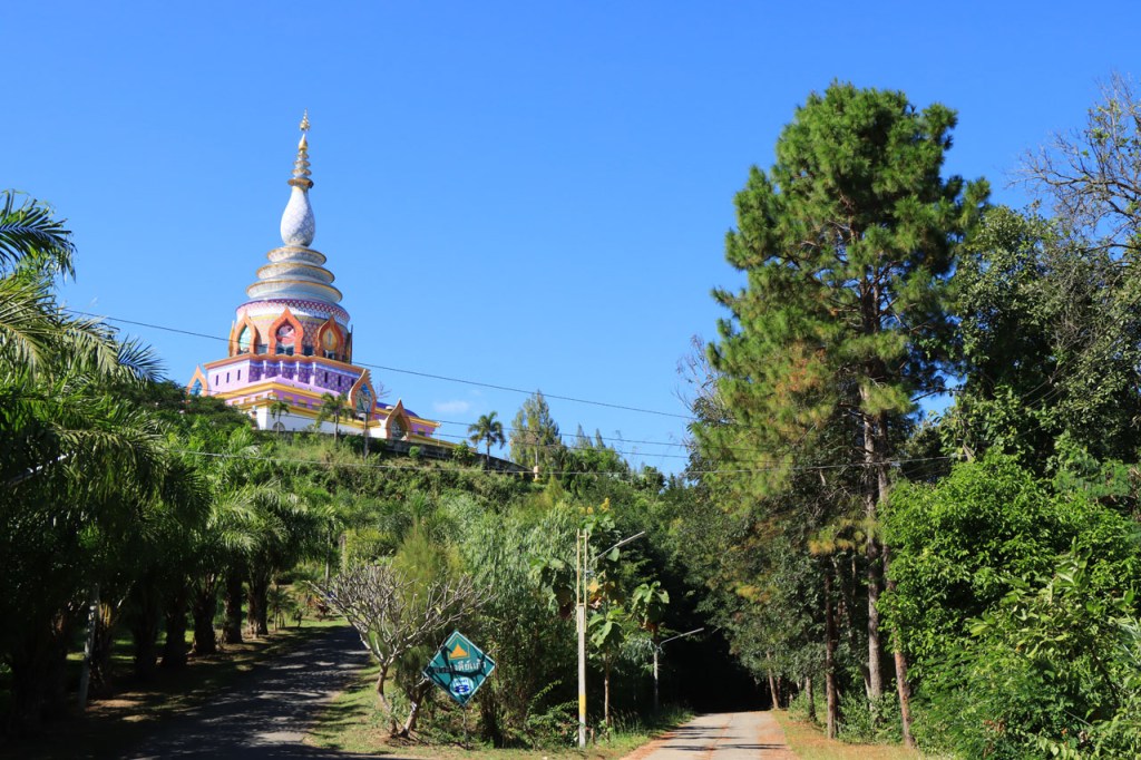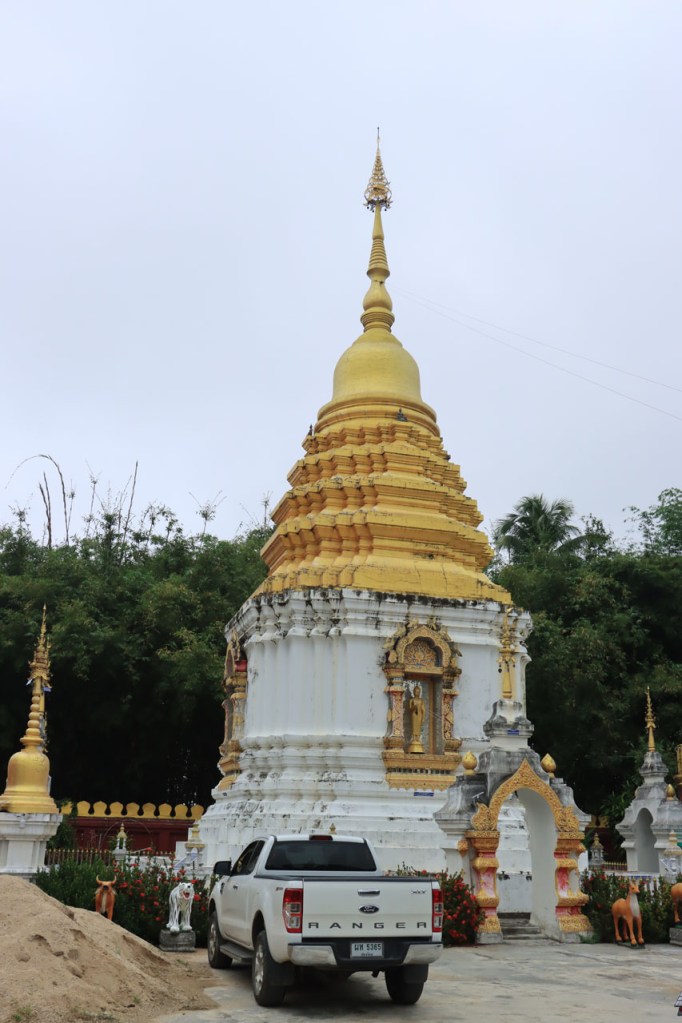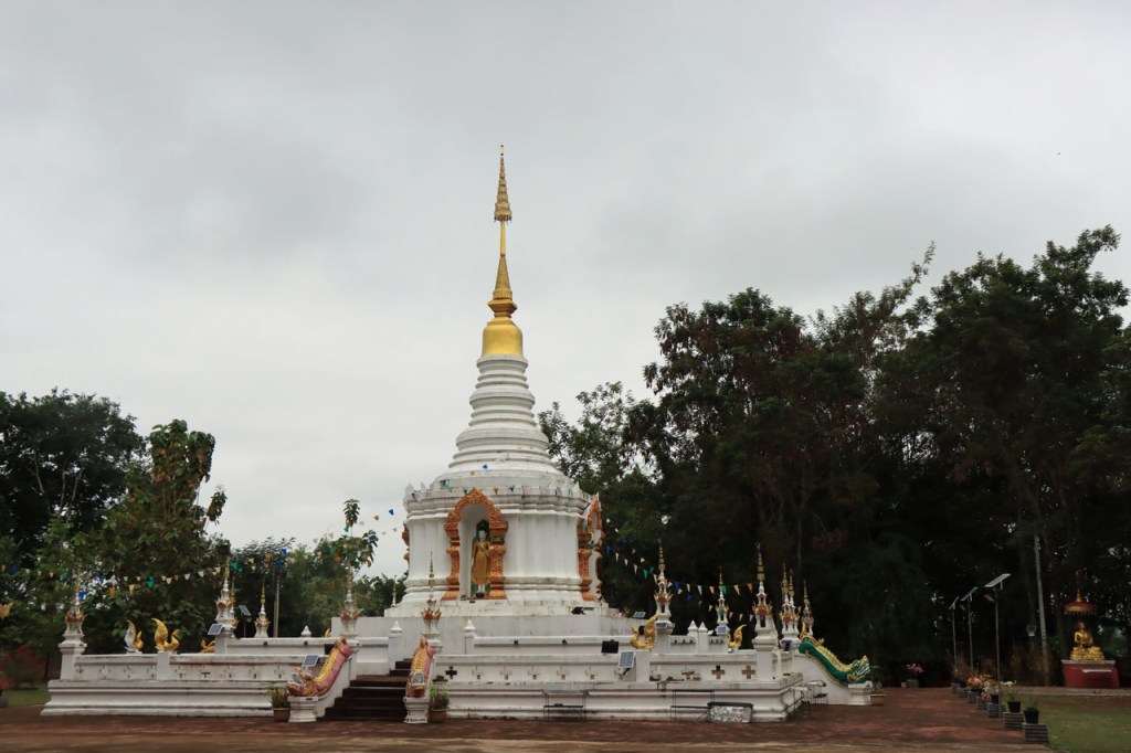 De start was vanmorgen nog wat frisser dan gisteren, 22° met een briesje voelt hier echt wel frisjes 🙂 . De zon kwam er wel wat vlugger door en na de middag was het wel weer echt warm. De rit van vandaag was ook nog minder dan gisteren, een vlak ritje van goed 30 Km. Met zo’n kort ritje was ik natuurlijk weer veel te vroeg op bestemming, ik had nochtans mijn best gedaan om wat later te vertrekken, ik reed dus eerst nog even mijn hotel voorbij naar het stadje om wat later terug te keren. Nadat ik gesetteld was keerde ik nog eens terug naar het stadje om Wat Thaton Chedi te bezoeken. Wat Thaton Chedi is een vrij groot tempelcomplex op een heuvel bij het stadje, ik had mijn portie tempels voor vandaag dus nog niet helemaal gehad 🙂 . Het is ook wel een behoorlijk indrukwekkend complex, verspreid over de heuvel, en schijnbaar vrij belangrijk, er waren dan ook nogal wat monniken in de buurt. Ik logeer hier in het Thaton Hill Resort en dat ligt even buiten het stadje maar dat zou geen probleem zijn, alles is ter plaatse voorhanden. Alleen … het toerisme in Thailand heeft schijnbaar toch nogal wat klappen gekregen door covid. Het is hier hetzelfde als in het Chai Prakan Resort: veel goede wil en mooie nette kamers, en in dit geval met een prachtig uitzicht, maar alle personeel en dus ook alle extra diensten zoals het restaurant geschrapt. Ik zal vanavond dus toch nog eens terug naar het stadje moeten om te eten. Voor het ontbijt heb ik me op de terugweg van de Chedi al voorzien, bij de 7 Eleven. Ik blijf hier overigens 2 nachten, morgen maak ik een uitstapje.