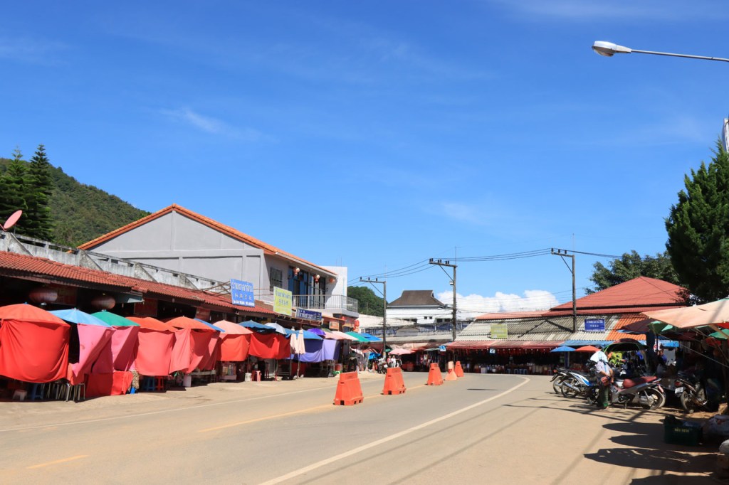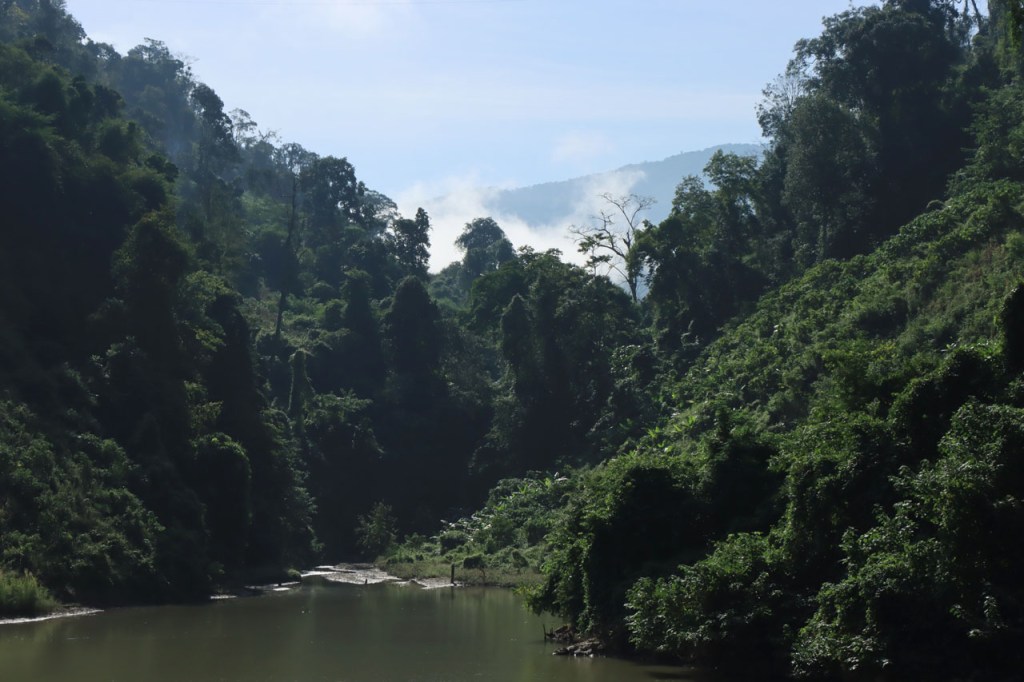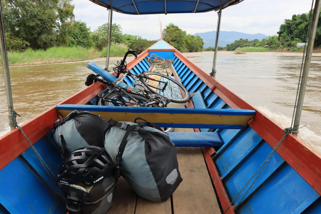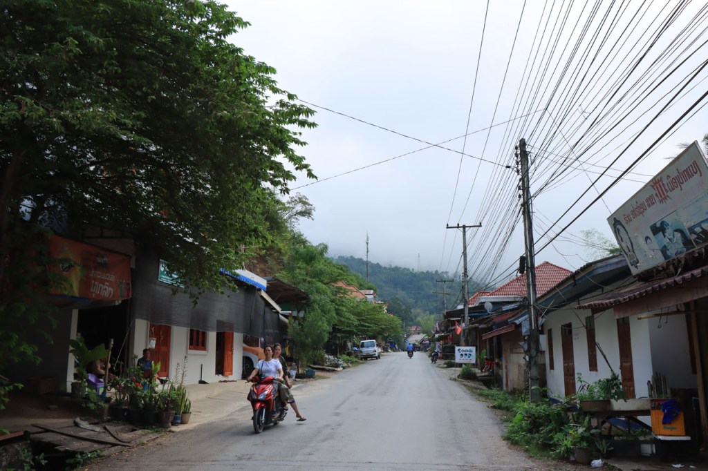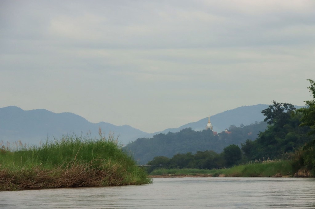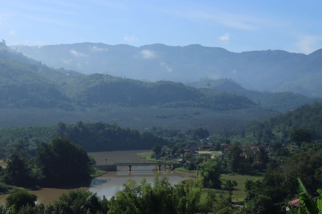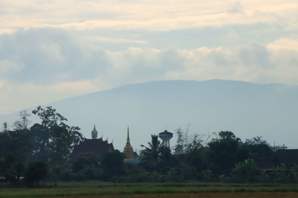 Vandaag moet ik beginnen met broer, de oudere, een gelukkige verjaardag te wensen: Gelukkige verjaardag broer. Het was vanmorgen nog eens een mistig begin. Op het programma stond een wat langere rit met grensovergang, mijn eerste solo “ver weg” grenspassage. Ik passeerde al wel meer grenzen maar dat was met begeleiding die zei wat je waar moet doen. Ook deze grens stak ik als eens over, bij mijn eerste bezoek aan Laos in 2004. Dat was toen een groepsreis die begon in Chiang Rai omdat dat nu eenmaal het makkelijkste startpunt was om met Noord Laos te beginnen. Toen was dat nog met overzetjes over de Mekong. Nu ligt er de Friendshipbridge IV, wat betekent in principe dat er nog tenminste 3 andere zijn dus. Die brug mag je wel niet met de fiets over, die neem je mee met de voetgangers in de bus om de oversteek te maken. Thailand uit geraken was makkelijk maar om in Laos te komen was er nog eens wat goeie ouwe bureaucratie nodig, dat is nog niet verandert. Na de grens ging het nog een 10 Km verder tot Houayxay. Voorlopig is er nog weinig verschil te merken met Thailand, al is het wel weer even wennen om terug rechts te rijden. Laos is ook zo’n land waar je in één slag miljonair kan zijn, 100 € wisselen volstaat al ruim 🙂 .