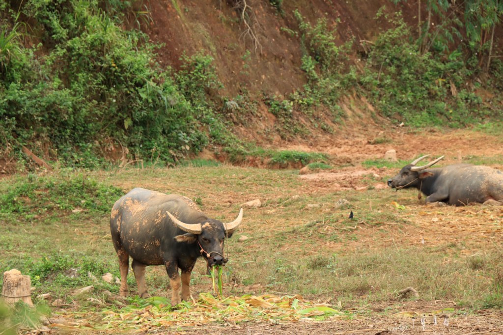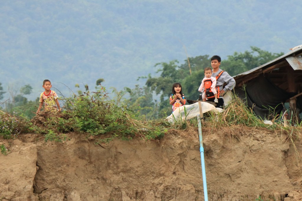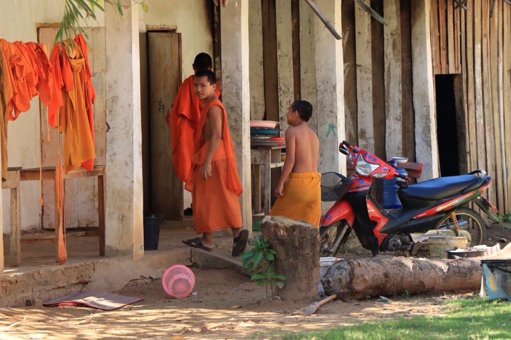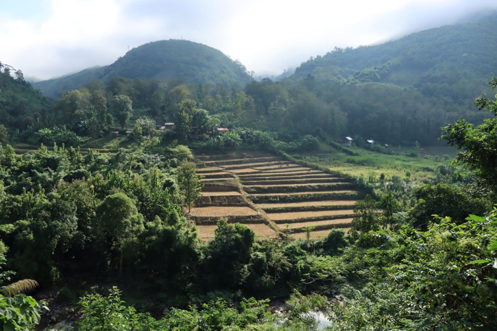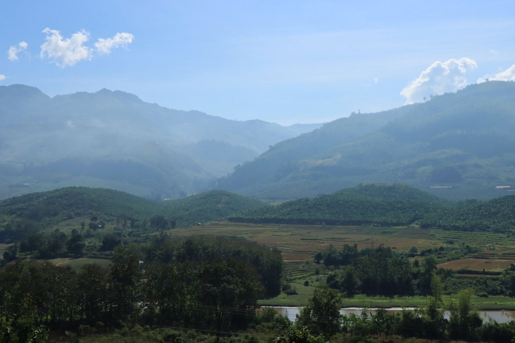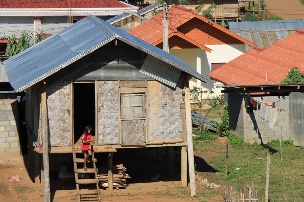 Ook na deze “rustdag” weer herbegonnen met een kleiner ritje maar kleiner wilde deze keer niet ook zeggen gemakkelijk. Het ging de hele tijd op en neer en daarbij ging het, aangezien ik een zijriviertje van de Mekong volgde en dus stroomopwaarts reed, vaker op dan neer. Als je eindelijk echt in Laos onderweg bent dan merk je als snel dat je een duidelijke stap terug gezet hebt op de economische schaal. Wel supervriendelijke mensen en ze zien hier voldoende weinig westerlingen om het opmerkelijk te vinden als ze er eentje zien maar anderzijds ook wel genoeg om er niet verstomd van te staan, de “hello’s” en “Sabaidee’s” vliegen je om de oren 🙂 . Als je dan net na schooltijd door één van de dorpjes passeert wordt het wel heel bijzonder 🙂 .
