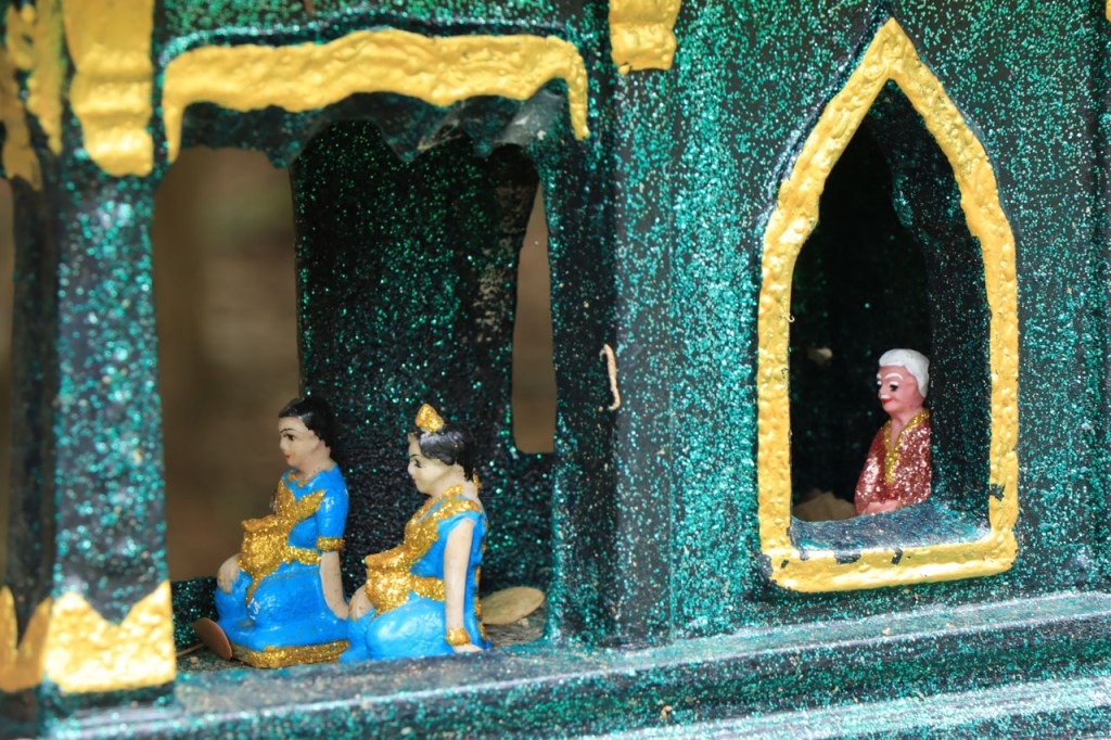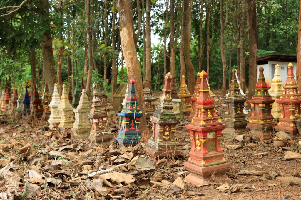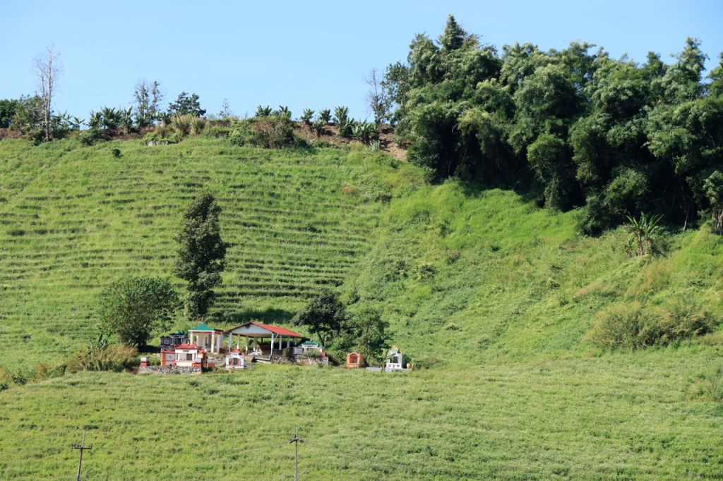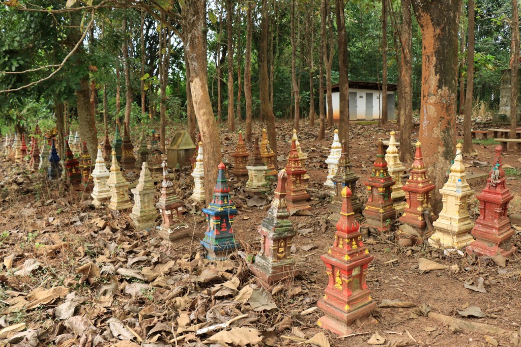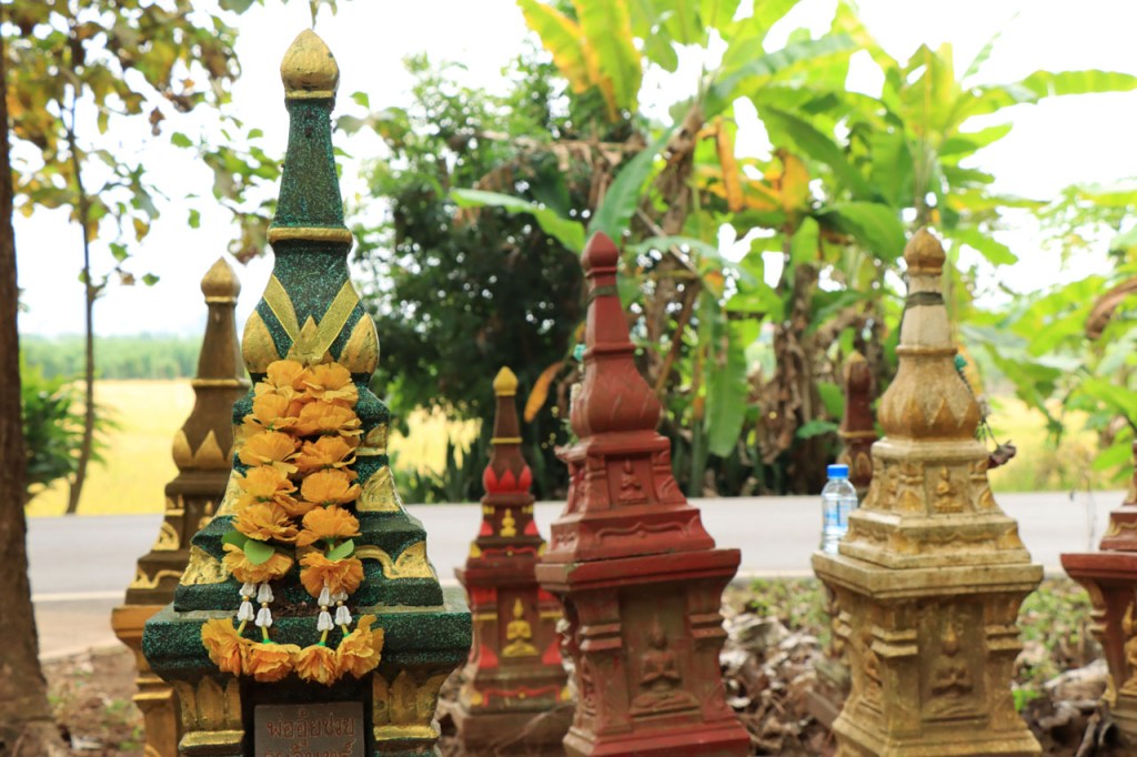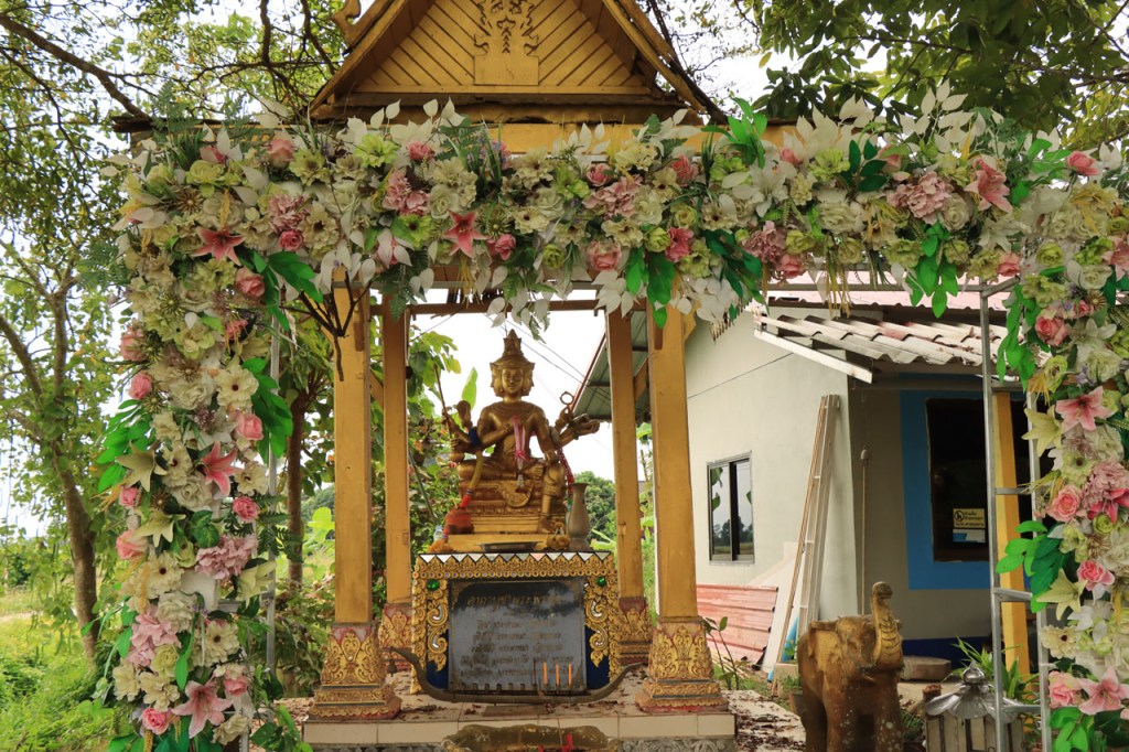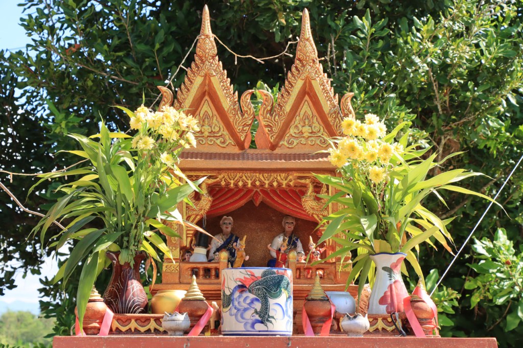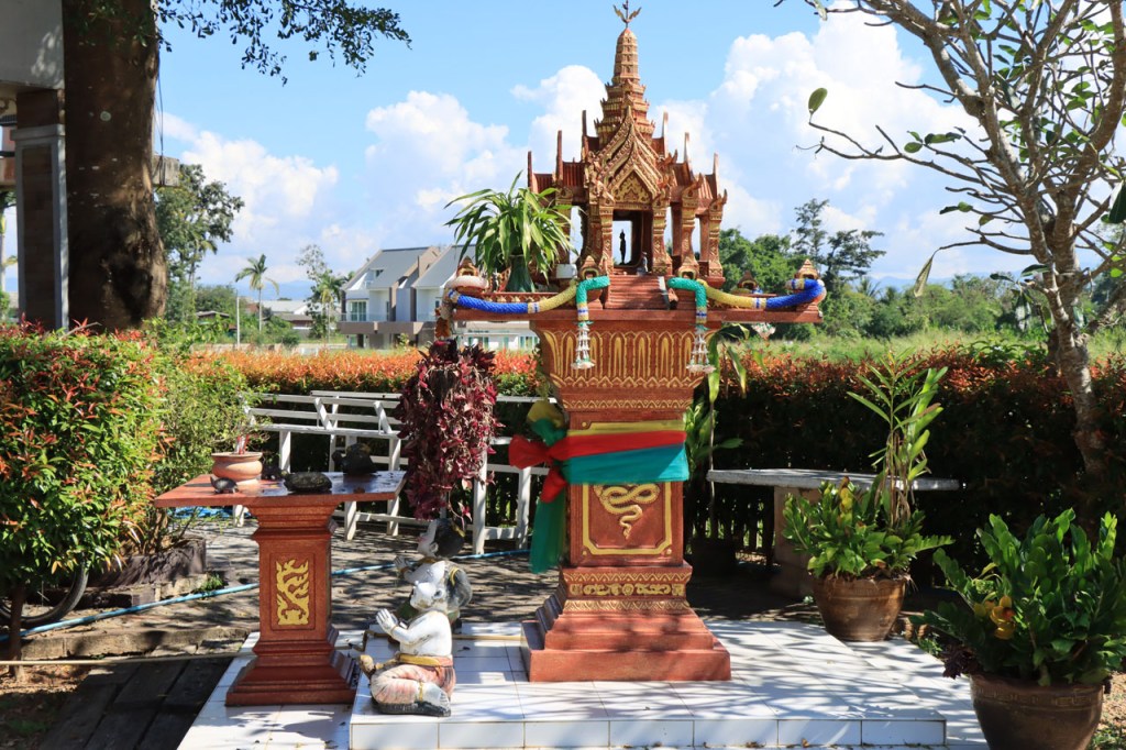 Ik geloof dat het Chai Prakan Resort een beetje aan het afzakken is. De kamer was wel nog steeds mooi, netjes en proper, dik in orde dus maar extra service was er niet meer, geen restaurant en geen ontbijt mogelijkheid. Ik moest dus een beetje improviseren. Gisteravond met een bezoek aan de lokale winkel, ik had wel een waterkoker op de kamer, en voor het ontbijt van vanmorgen kon ik terecht bij de 7 Eleven, 7 Eleven’s zijn hier heel populair, 2 Km verderop. Ik begon de dag echter met een bezoek aan de tempel natuurlijk 🙂 , eentje net voor het ontbijt en eentje net erna. Ik kwam tot de constatatie dat de witte “tempels” met precies een schoorsteen ook effectief een schoorsteen hebben, het blijken namelijk crematie ovens te zijn. Ik was al enkele keren in Thailand, ook in deze regio, maar ze waren me nog nooit dusdanig opgevallen. De kleine puntige “zerkjes” zijn dat ook, grafzerken, maar dat wist ik wel al eerder. De “kapelletjes” zijn geestenhuisjes. Wanneer ze bij een woning staan zijn er gewoonlijk 2, een groter en een kleiner, eentje voor de gemeenschap en eentje voor de familieleden. Ze moeten ervoor zorgen dat de geesten niet in de woning zelf gaan huizen, ze worden dan ook geregeld voorzien van vers eten en drinken. Bij hotels durven ze al eens “supersized” te zijn, die willen waarschijnlijk helemaal op zeker spelen 😉 . Het was een grijze start vanmorgen en ook best frisjes met maar 24° 🙂 . Omstreeks 11 uur brak dan toch de zon door en warmde het weer snel op. Na 2 stevige ritten, en een ook best stevige proloog in Chiang Mai, mocht het vandaag wat minder zijn, een kort rustig ritje met wel weer enkele bultjes maar een overwegend dalende lijn. Ik eindigde vandaag in Fang. Een stadje met terug alle faciliteiten maar nog altijd puur lokaal. Na me te settelen in mijn hotel wandelde ik even door het stadje maar het was me te warm en te weinig interessant om daar lang mee bezig te zijn. Ik passeerde nog wel eens bij Amazon, goeie koffie. Ik was daar eerder ook al, om tenminste niet voor de middag bij mijn hotel aan te komen. Gelukkig kon ik daar direct na de middag al wel inchecken.