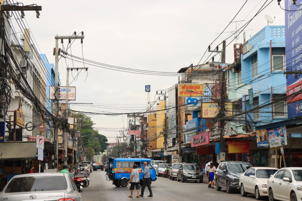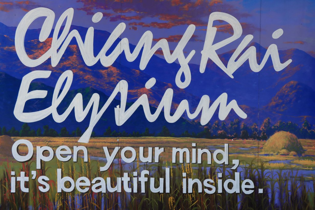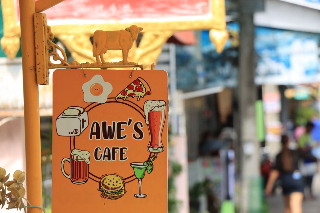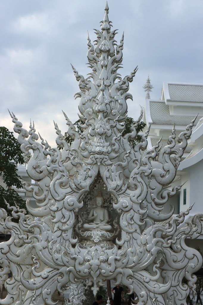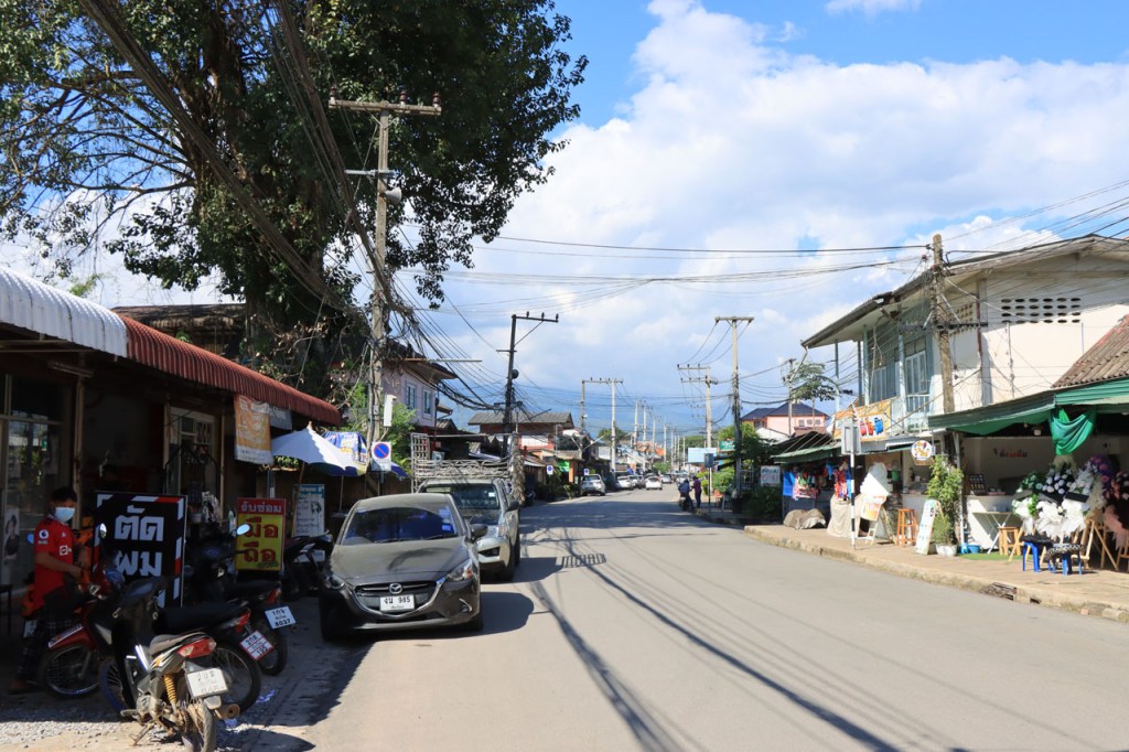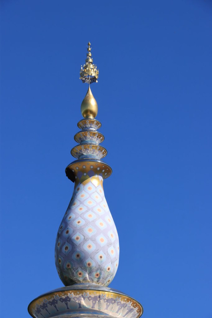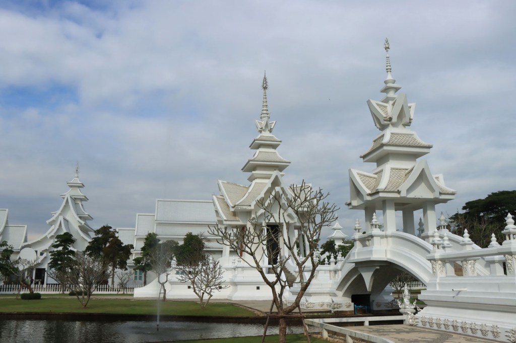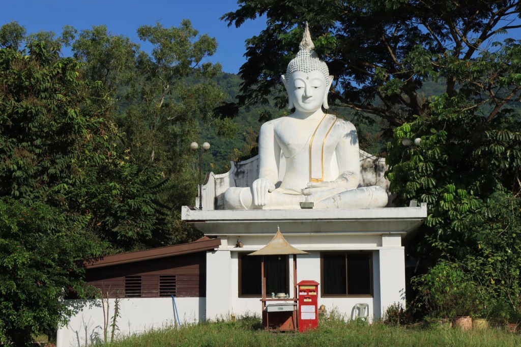 Awe’s Café, dat me uit de nood hielp met de wifi, is geen café zoals wij dat kennen. In dit geval is het echt slechts een hoekje dat dienst doet als koffiehuis/café/restaurant/… Haar maaltijden geeft ze door met haar smartphone en worden daarna aangedragen van een beetje verderop. Ik heb wel het idee dat het vanuit haar eigen keuken komt, en niet vanuit een andere eetgelegenheid, maar dat ze op haar hoekje gewoon geen plaats heeft voor een keukentje. Hoe dan ook is dit het soort kleine zaak waar ik wel graag mijn geld uitgeef en bovendien vind ik dat ze het wel verdiend heeft door me in de namiddag uit de nood te helpen. Overigens lijkt het erop dat de problemen van de wifi in het hotel een gevolg waren van overbelasting van het net, ’s avonds kon ik er gewoon op. Tot dusver bestond het menu, in het beste geval, uit een beschrijving van wat er op je bord kwam. Bij Awe stonden er ook enkele gerechten met naam op. Zo kon ik de menu van Yathida, mijn favoriete Ieperse Thais restaurant, eens testen 😉 . Ik kan nu bevestigen dat een Massaman Curry in Ieper hetzelfde is als in Chiang Rai 🙂 . Na de rustdag van gisteren herbegon ik vandaag met een rustig ritje, ik fietste naar de Witte en de Blauwe Tempel. Beiden zijn behoorlijk recent en modernistisch en hebben weinig religieuze betekenis, ze zijn meer ter ere van de architect dan van Boeddha. Aan de Witte hangt bovendien een, naar plaatselijke normen, best prijzig inkomticket vast. Ik moet wel toegeven dat het, ondanks zijn betrekkelijke betekenis, een behoorlijk indrukwekkend complex is. De Blauwe heeft ook zijn extravagantie maar is toch een stuk bescheidener en serener. Mijn SIM-kaart heeft de afgelopen dagen zijn waarde weer goed bewezen. Gisteren loodste ze mij naar mijn hotel en vandaag ook naar de tempels. Na de middag wandelde ik nog wat, een beetje verder dan gisteren.