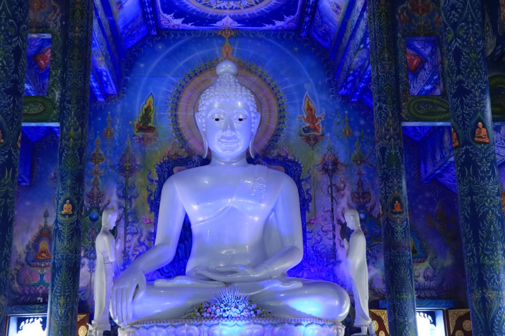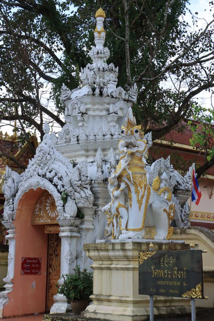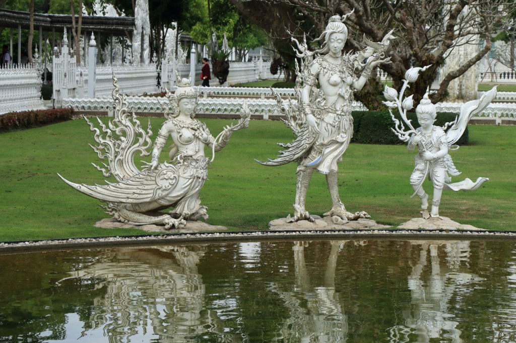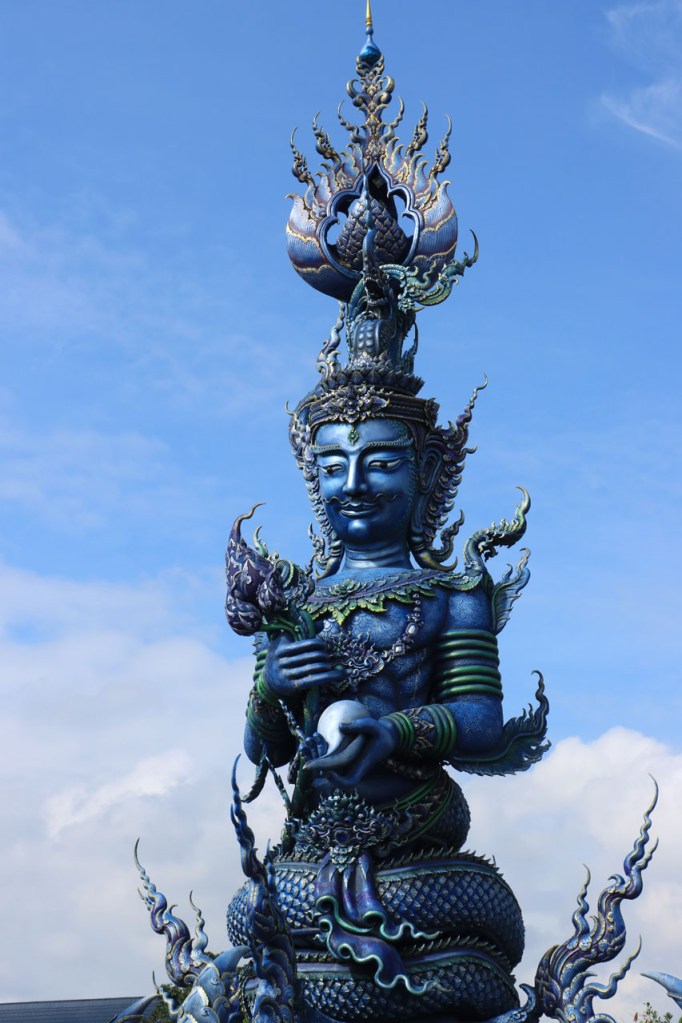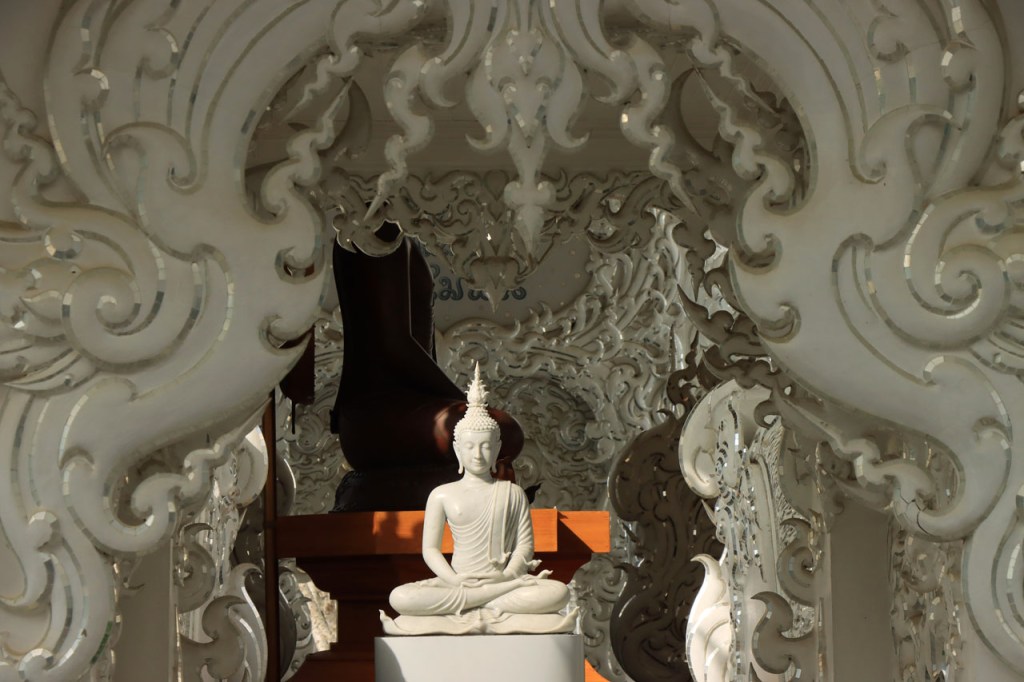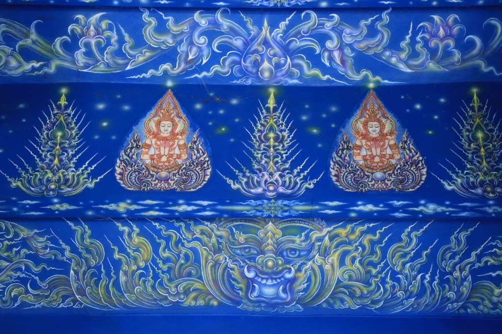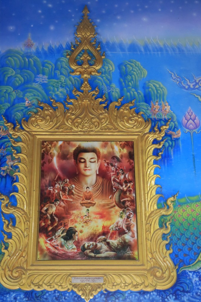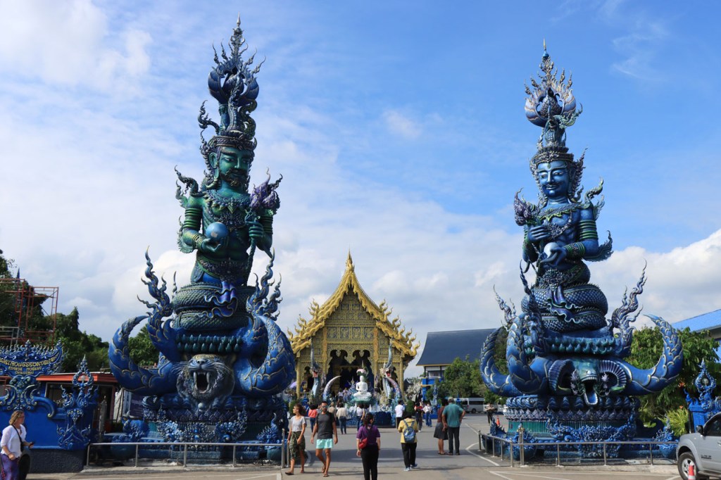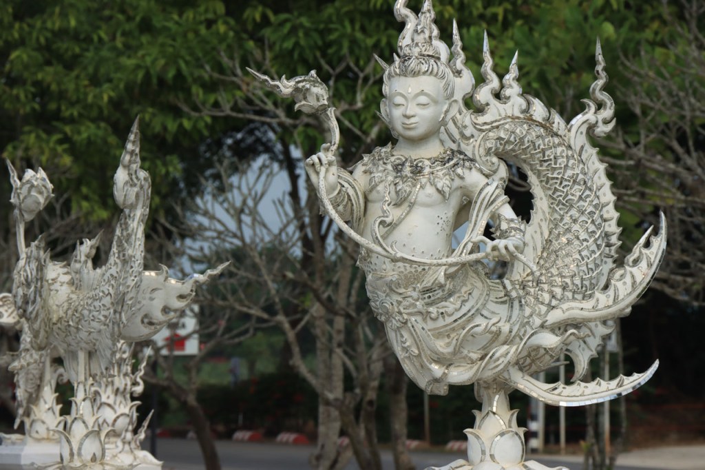Awe’s Café, dat me uit de nood hielp met de wifi, is geen café zoals wij dat kennen. In dit geval is het echt slechts een hoekje dat dienst doet als koffiehuis/café/restaurant/… Haar maaltijden geeft ze door met haar smartphone en worden daarna aangedragen van een beetje verderop. Ik heb wel het idee dat het vanuit haar eigen keuken komt, en niet vanuit een andere eetgelegenheid, maar dat ze op haar hoekje gewoon geen plaats heeft voor een keukentje. Hoe dan ook is dit het soort kleine zaak waar ik wel graag mijn geld uitgeef en bovendien vind ik dat ze het wel verdiend heeft door me in de namiddag uit de nood te helpen. Overigens lijkt het erop dat de problemen van de wifi in het hotel een gevolg waren van overbelasting van het net, ’s avonds kon ik er gewoon op. Tot dusver bestond het menu, in het beste geval, uit een beschrijving van wat er op je bord kwam. Bij Awe stonden er ook enkele gerechten met naam op. Zo kon ik de menu van Yathida, mijn favoriete Ieperse Thais restaurant, eens testen 😉 . Ik kan nu bevestigen dat een Massaman Curry in Ieper hetzelfde is als in Chiang Rai 🙂 . Na de rustdag van gisteren herbegon ik vandaag met een rustig ritje, ik fietste naar de Witte en de Blauwe Tempel. Beiden zijn behoorlijk recent en modernistisch en hebben weinig religieuze betekenis, ze zijn meer ter ere van de architect dan van Boeddha. Aan de Witte hangt bovendien een, naar plaatselijke normen, best prijzig inkomticket vast. Ik moet wel toegeven dat het, ondanks zijn betrekkelijke betekenis, een behoorlijk indrukwekkend complex is. De Blauwe heeft ook zijn extravagantie maar is toch een stuk bescheidener en serener. Mijn SIM-kaart heeft de afgelopen dagen zijn waarde weer goed bewezen. Gisteren loodste ze mij naar mijn hotel en vandaag ook naar de tempels. Na de middag wandelde ik nog wat, een beetje verder dan gisteren.