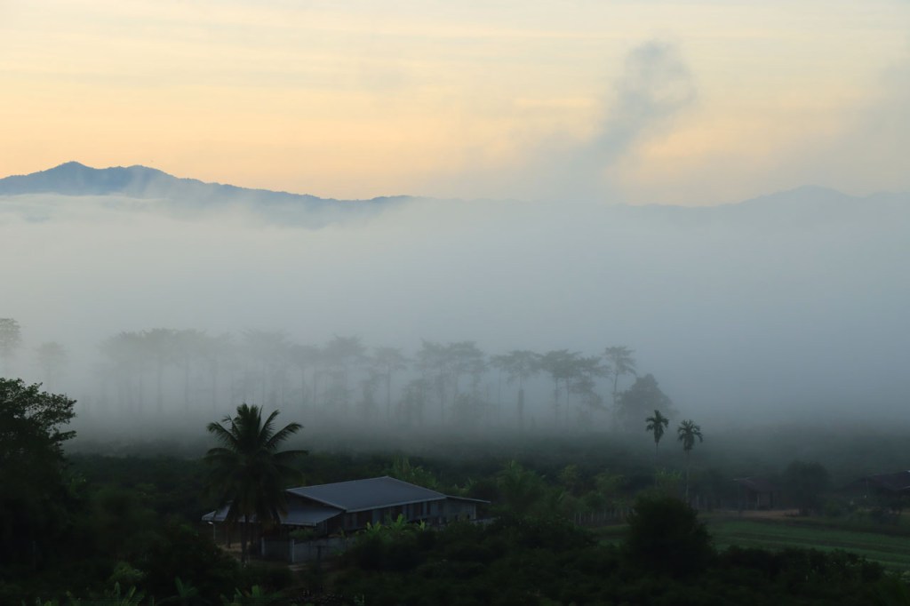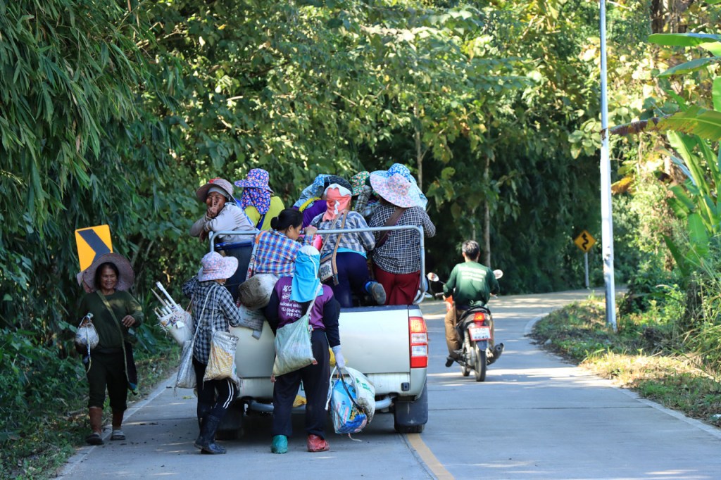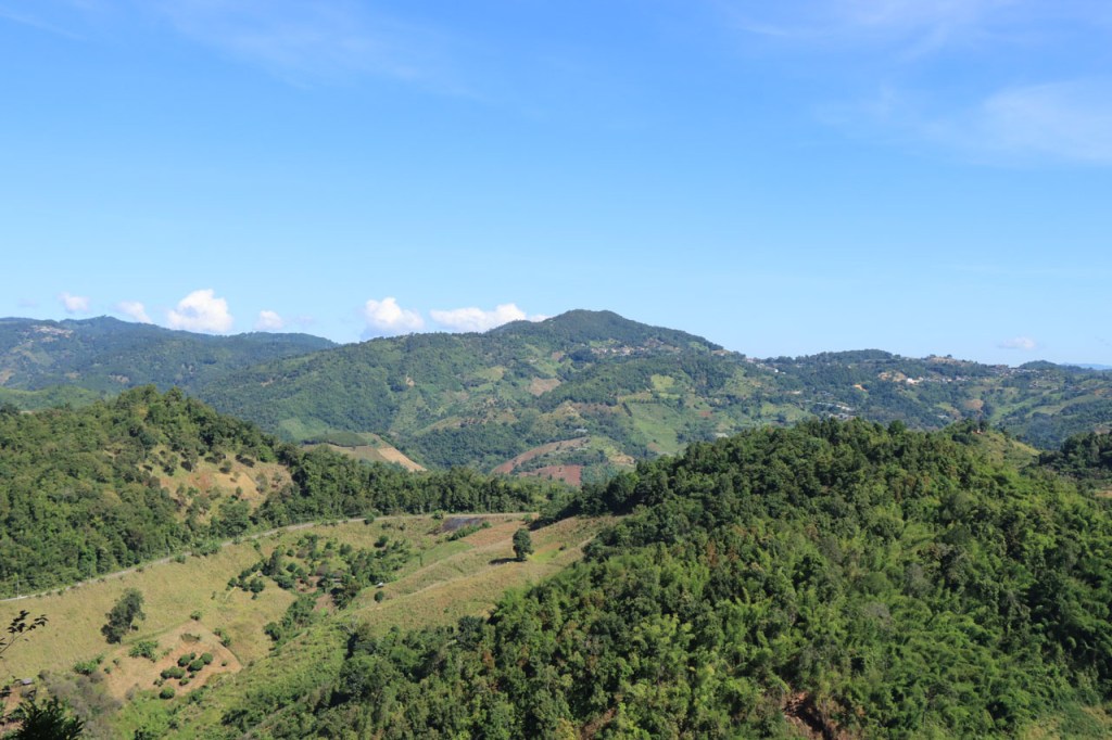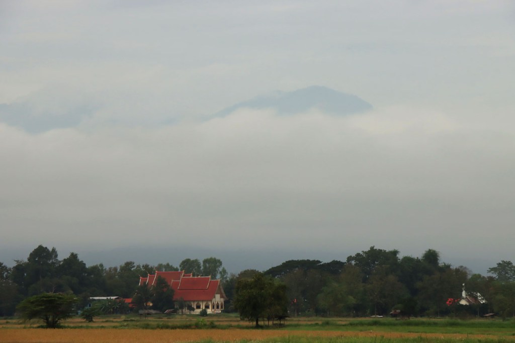 Ik heb er wat moeite voor moeten doen, nog eens terugkeren naar het stadje, maar ik heb uiteindelijk toch lekker gegeten. Ik was overigens niet de enige westerling in het stadje, ik zag er nog 3. De eerste leek me mogelijk een lokale expat maar het koppel waren duidelijk ook toeristen. Verder heb ik gisteren nog lang genoten van het uitzicht vanop mijn kamer en nog meer vanmorgen, tot het uiteindelijk verdween 🙂 . Vandaag maakte ik dus een “uitstapje”, ik fietste naar Doi Mae Salong en terug. Doi Mae Salong is een bergdorpje met een grote etnisch Chinese bevolkingsgroep, iets wat schijnbaar teruggaat tot begin jaren 60. Later is de omgeving uitgegroeid tot het centrum van de Oolongthee, een van origine Chinese variëteit, in Thailand. Na goed 4 Km merkte ik dat ik mijn drinkbussen vergeten was. Zonder drinken kon ik er zeker niet aan beginnen, even een retourtje terug naar het hotel dus. Gelukkig merkte ik het nog redelijk vroeg. Ik ontmoette onderweg een heel pelotonnetje met koersfietsen, schijnbaar allemaal Duitstalig. Ze waren onderweg met een organisatie van Siam Bike Tours. Bij hun drinkstop, bovenaan een klim, praatte ik even met de oprichter/eigenaar van de organisatie, ook Duitstalig maar ik heb niet gevraagd of hij Duitser dan wel mogelijk Oostenrijker was. In Mae Salong was het weer wijzen om lunch te bestellen maar ze hanteerden er wel zware toeristenprijzen. Er komen dan ook behoorlijk wat daguitstappers uit Chiang Rai. Dat de klim naar Mae Salong een echte col was wist ik deze keer wel al, als ik me niet vergis was ik er 15 jaar geleden al eens met een groepsfietsreis. Dat was toen wel met mountainbikes en een stuk eenvoudiger, die hebben een veel kleinere versnelling beschikbaar. Op mijn crossfiets heb ik die niet en de laatste paar kilometers heb ik toch enkele keren voet aan grond moeten zetten en duwen. Naast die kleinere versnelling was ik ook wel nog 15 jaar jonger natuurlijk 🙂 . Ik houd dus van klimmen maar vandaag heb ik het toch, mogelijk voor het eerst in mijn leven, wel eens vervloekt. Dit was eigenlijk echt wel wat te zwaar in deze configuratie. Eerlijkheidshalve moet ik daarbij wel toegeven dat mijn gids me daarvoor waarschuwde, zij raadden aan om een georganiseerd uitstapje te boeken vanwege de zwaarte van de rit. Ik heb in de namiddag ook wel verlangd naar die mist van vanmorgen. Op de terugweg kwam ik nog een merkwaardige groep tegen, ik kan alleen maar denken dat het een soort kloosterbedevaart was. De meesten overigens op blote voeten.