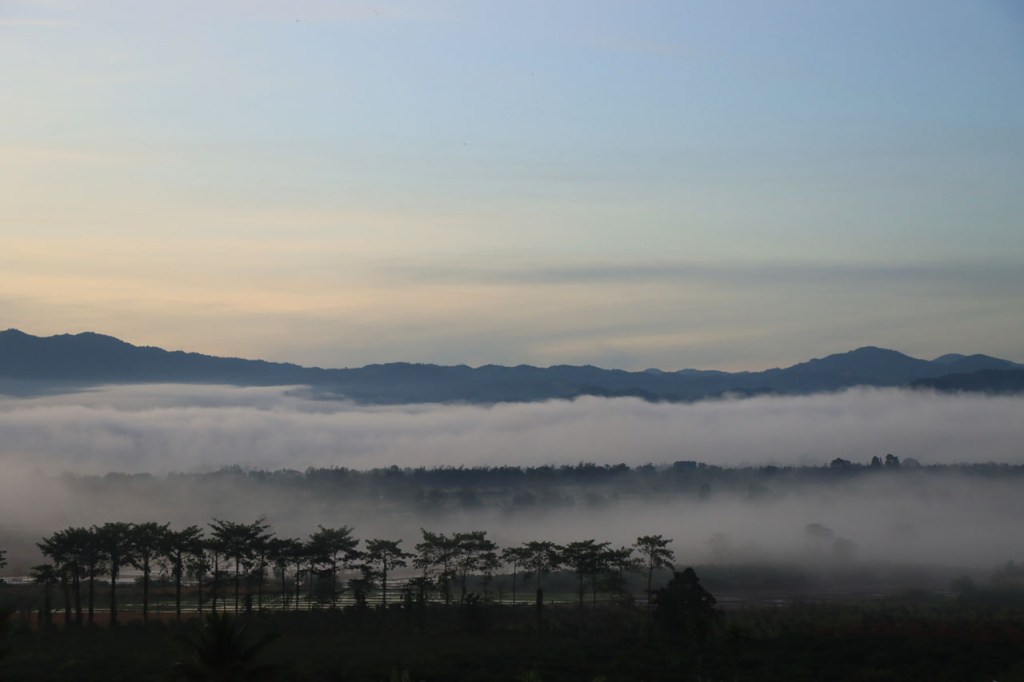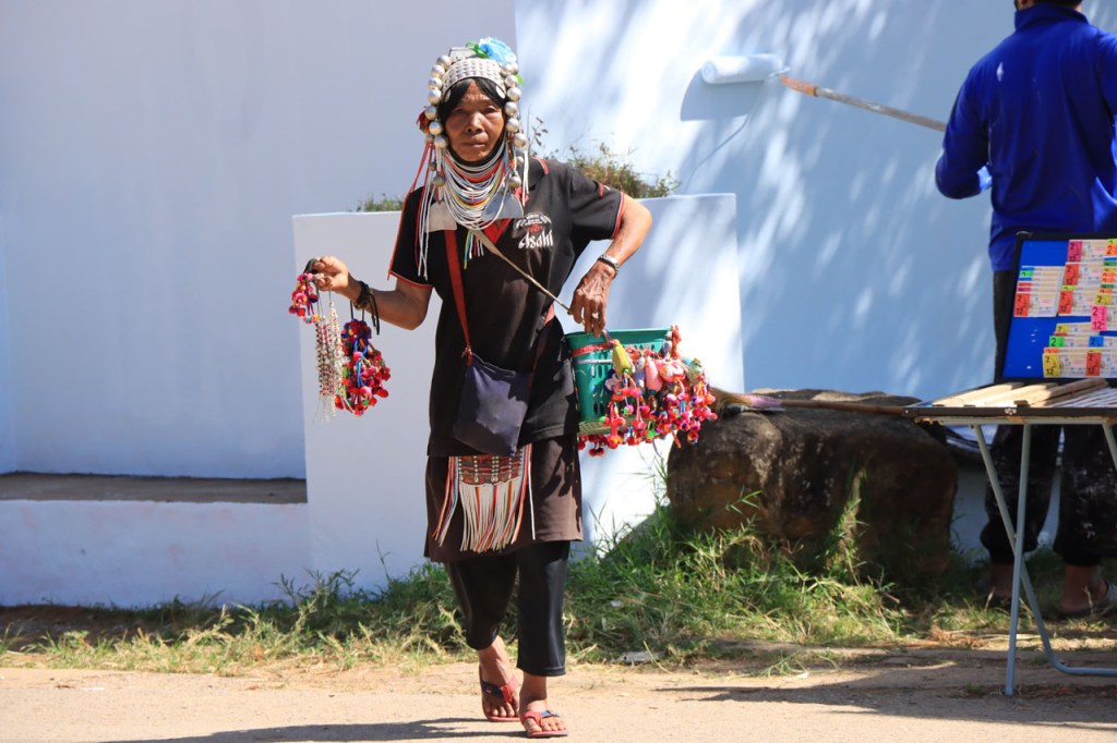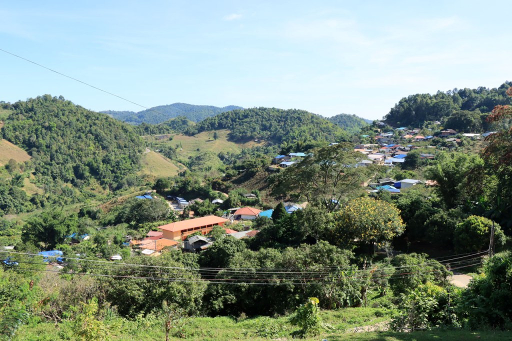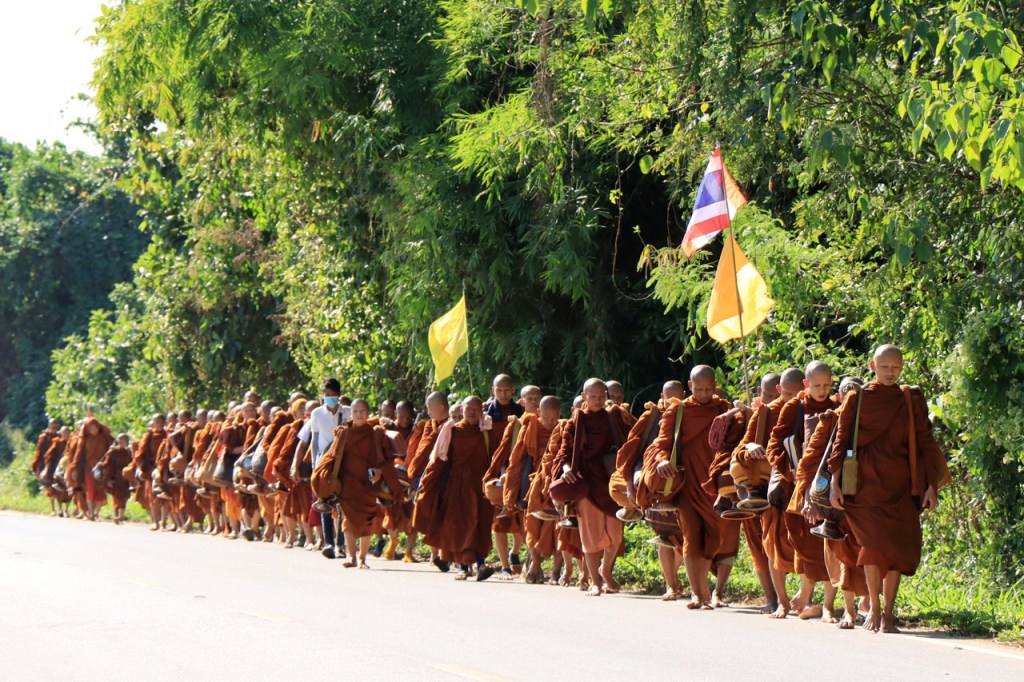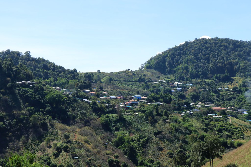 Ik heb er wat moeite voor moeten doen, nog eens terugkeren naar het stadje, maar ik heb uiteindelijk toch lekker gegeten. Ik was overigens niet de enige westerling in het stadje, ik zag er nog 3. De eerste leek me mogelijk een lokale expat maar het koppel waren duidelijk ook toeristen. Verder heb ik gisteren nog lang genoten van het uitzicht vanop mijn kamer en nog meer vanmorgen, tot het uiteindelijk verdween 🙂 . Vandaag maakte ik dus een “uitstapje”, ik fietste naar Doi Mae Salong en terug. Doi Mae Salong is een bergdorpje met een grote etnisch Chinese bevolkingsgroep, iets wat schijnbaar teruggaat tot begin jaren 60. Later is de omgeving uitgegroeid tot het centrum van de Oolongthee, een van origine Chinese variëteit, in Thailand. Na goed 4 Km merkte ik dat ik mijn drinkbussen vergeten was. Zonder drinken kon ik er zeker niet aan beginnen, even een retourtje terug naar het hotel dus. Gelukkig merkte ik het nog redelijk vroeg. Ik ontmoette onderweg een heel pelotonnetje met koersfietsen, schijnbaar allemaal Duitstalig. Ze waren onderweg met een organisatie van Siam Bike Tours. Bij hun drinkstop, bovenaan een klim, praatte ik even met de oprichter/eigenaar van de organisatie, ook Duitstalig maar ik heb niet gevraagd of hij Duitser dan wel mogelijk Oostenrijker was. In Mae Salong was het weer wijzen om lunch te bestellen maar ze hanteerden er wel zware toeristenprijzen. Er komen dan ook behoorlijk wat daguitstappers uit Chiang Rai. Dat de klim naar Mae Salong een echte col was wist ik deze keer wel al, als ik me niet vergis was ik er 15 jaar geleden al eens met een groepsfietsreis. Dat was toen wel met mountainbikes en een stuk eenvoudiger, die hebben een veel kleinere versnelling beschikbaar. Op mijn crossfiets heb ik die niet en de laatste paar kilometers heb ik toch enkele keren voet aan grond moeten zetten en duwen. Naast die kleinere versnelling was ik ook wel nog 15 jaar jonger natuurlijk 🙂 . Ik houd dus van klimmen maar vandaag heb ik het toch, mogelijk voor het eerst in mijn leven, wel eens vervloekt. Dit was eigenlijk echt wel wat te zwaar in deze configuratie. Eerlijkheidshalve moet ik daarbij wel toegeven dat mijn gids me daarvoor waarschuwde, zij raadden aan om een georganiseerd uitstapje te boeken vanwege de zwaarte van de rit. Ik heb in de namiddag ook wel verlangd naar die mist van vanmorgen. Op de terugweg kwam ik nog een merkwaardige groep tegen, ik kan alleen maar denken dat het een soort kloosterbedevaart was. De meesten overigens op blote voeten.