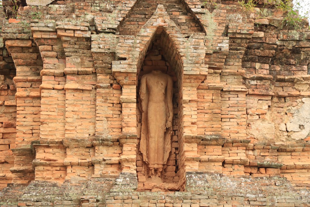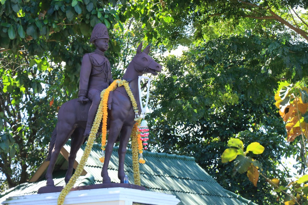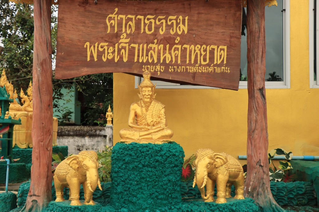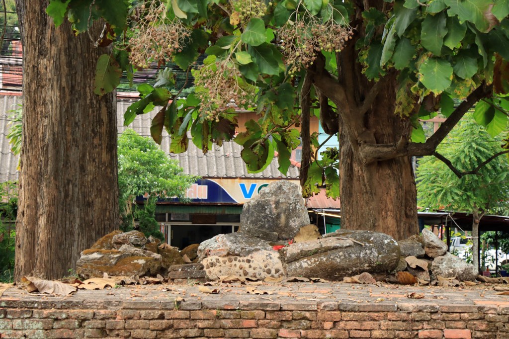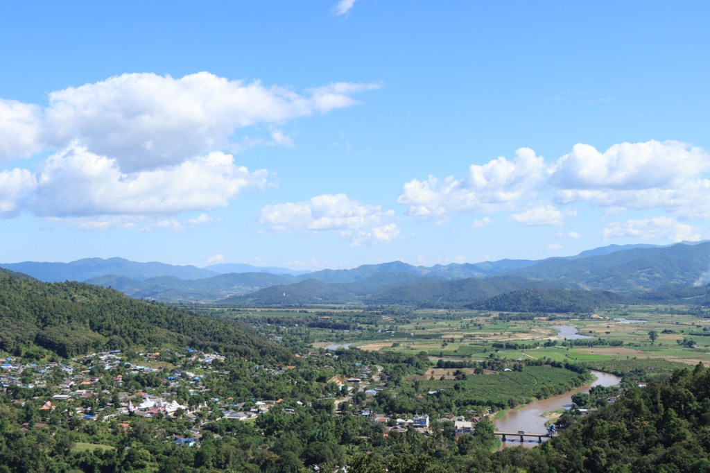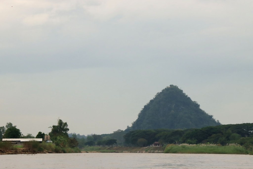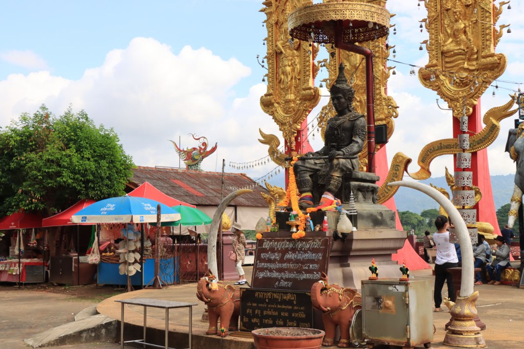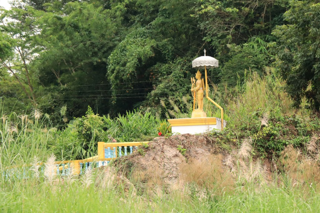Voor een grijs stadje had Mae Chan ’s avonds wel een erg kleurrijk en levendig centraal plein, vol met eet, drank en zoetigheid standjes. Vandaag een korter ritje, erg rustig ook maar met wel één nijdige puist in de weg. Na 46 Km kwam ik aan de “Golden Triangle” of zoals wij zouden zeggen “het drielandenpunt”, al heeft de Golden Triangle natuurlijk nog wel een wat ruimere betekenis dan gewoon drielandenpunt. Verder lijkt het misschien nog het meest op de Zwarte Berg in het weekend, het punt waar iedereen naar toe schijnt te moeten komen 🙂 . Bij de Golden Triangle bereikte ik ook meteen de Mekong. Na de Triangle ging het nog een 10 Km verder tot Chiang Saen, eveneens langs de Mekong. Chiang Saen was ooit, in vervlogen tijden, een onafhankelijk koninkrijkje en dat is in het stadje nog op verscheidene plaatsen te merken.