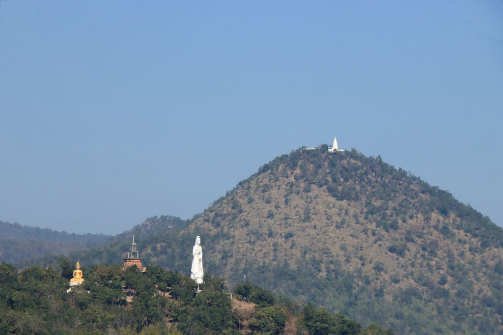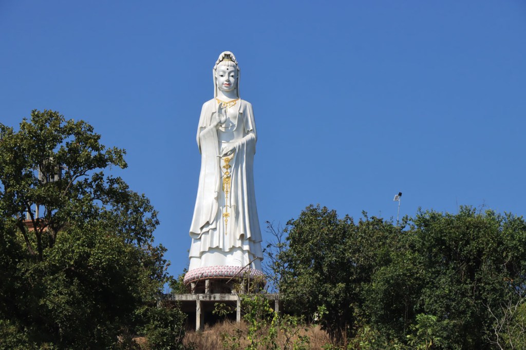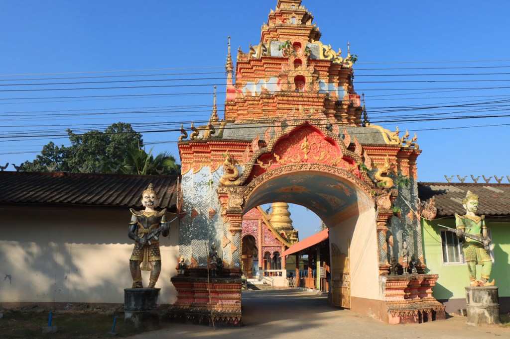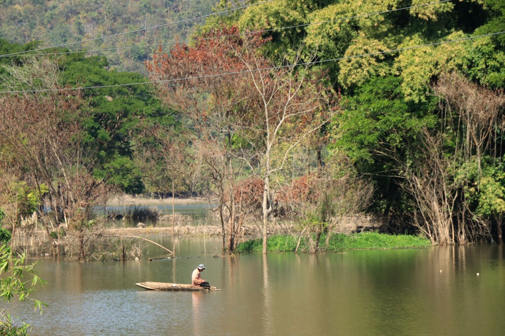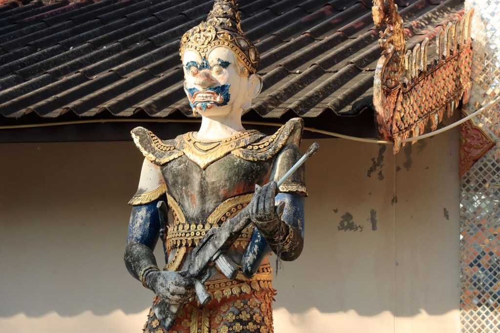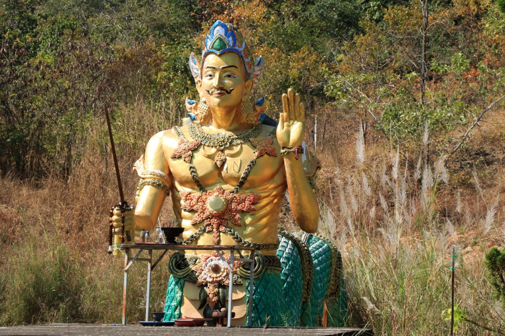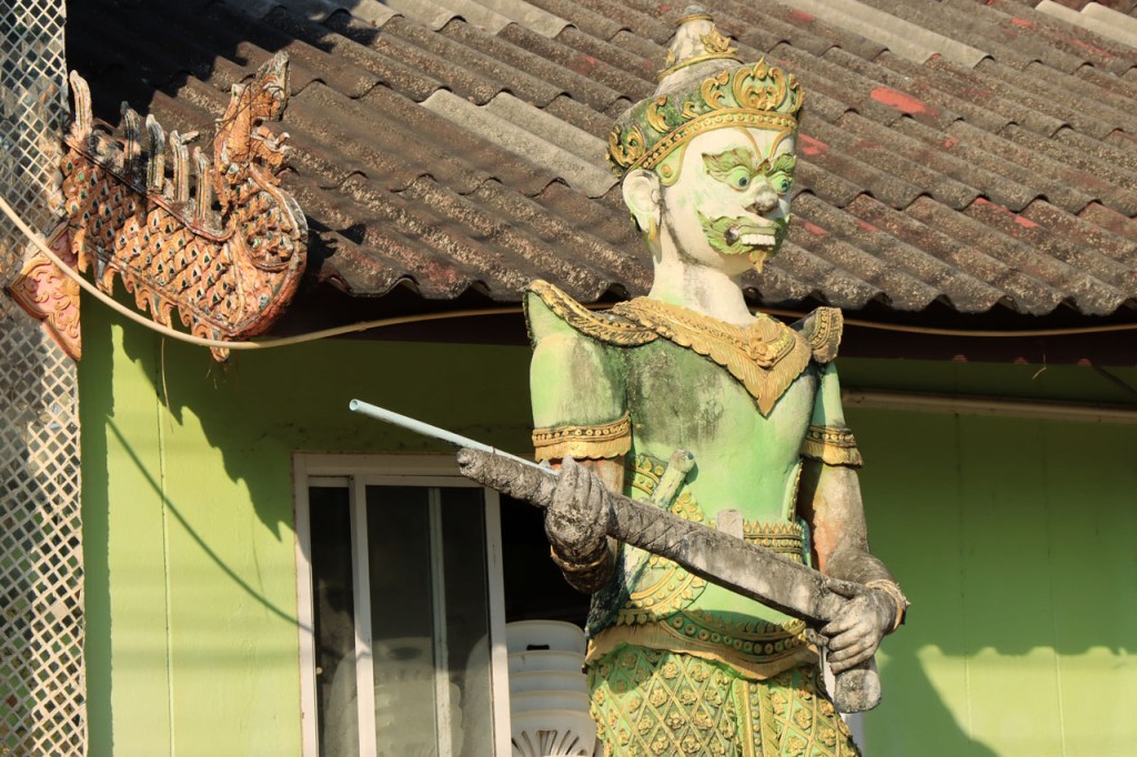 Het was vanmorgen best koud, ik had 15° bij het vertrek en toen was het toch al 9 uur. Omdat ik gisteren al zowat de helft van de voor vandaag voorziene rit deed, deed ik het vanmorgen allemaal rustig aan. Vanwege dat kortere ritje begon ik ook met een stukje terug te rijden, naar een paar figuren die ik gisteren al merkte maar toen niet bij stopte. Je ziet aan de ingang van een tempel wel eens meer een paar vervaarlijk uitziende figuren met zwaard of zware knuppel, die kan je dan wegzetten als mythologische figuren maar hoe je geweren met de boeddhistische filosofie rijmt dat weet ik niet 🙂 . Ik moest vandaag ook een overzetbootje nemen omdat de omgeving overstroomd is. Je vraagt je af hoe dat kan, het heeft al weken niet meer geregend 🙂 . Er vaart dus wel een bootje maar je moet er een paar natte voeten voor over hebben om aan boord te geraken. Er is wel aan beide kanten assistentie voorzien om de scooters te laden.