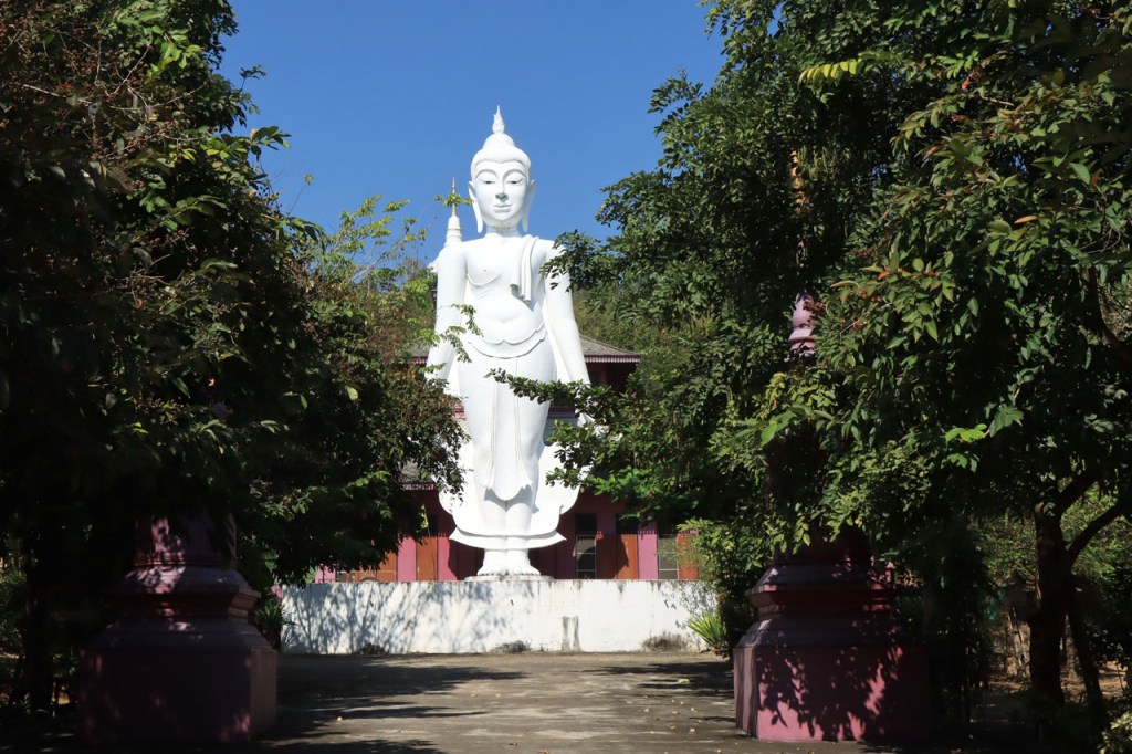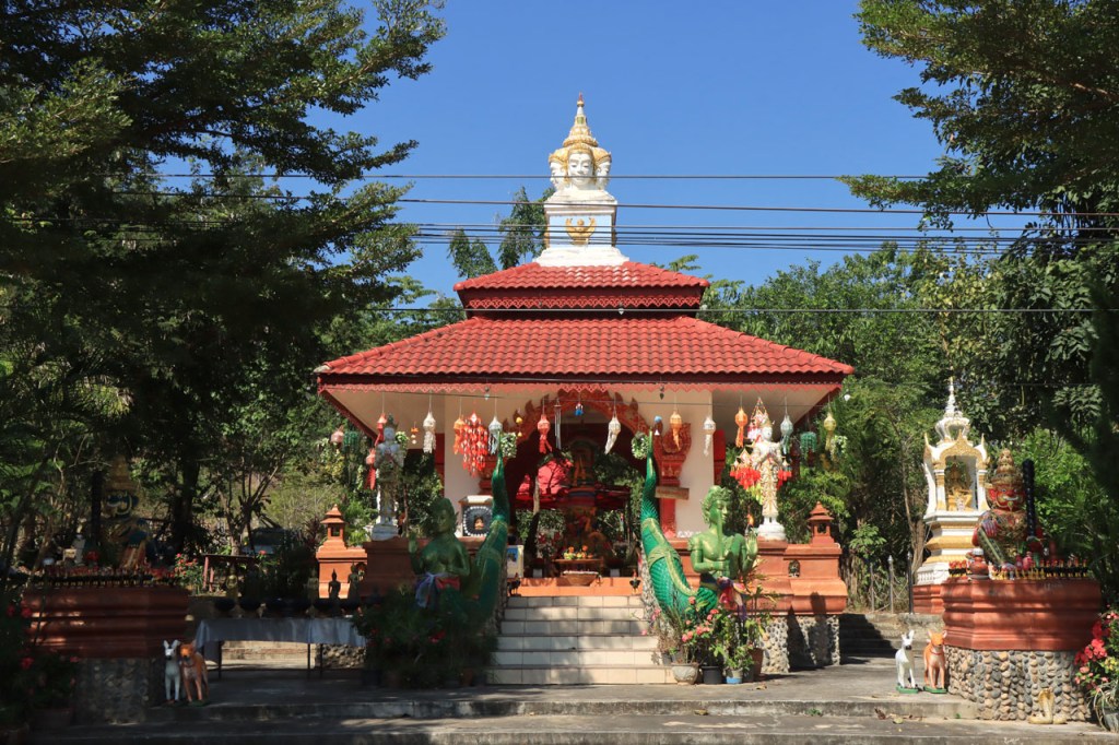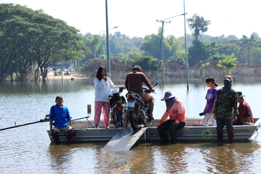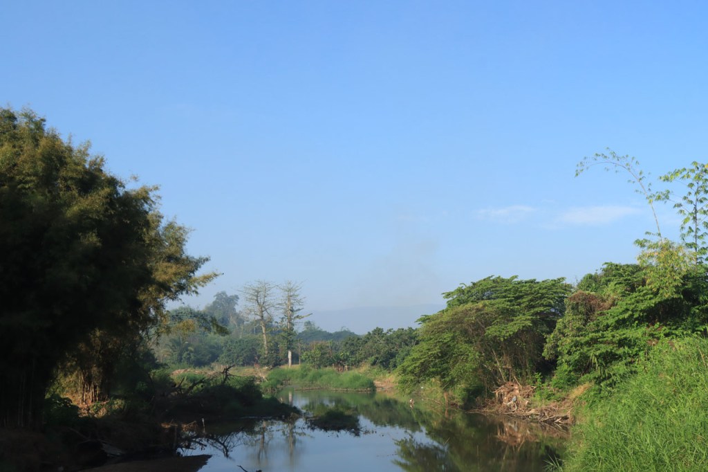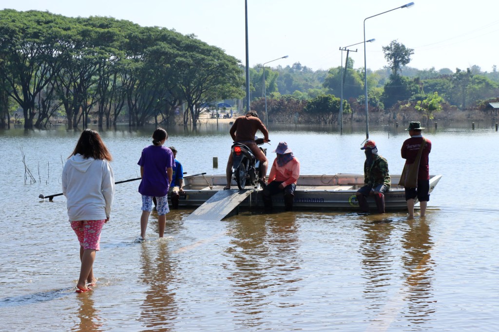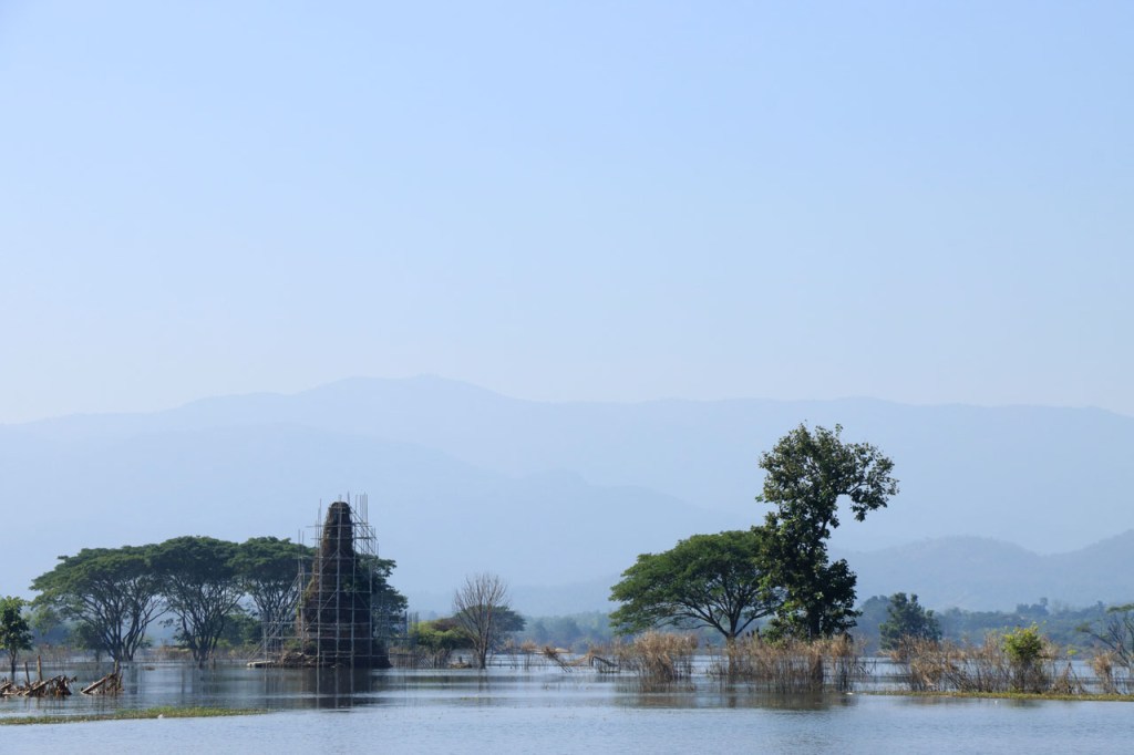 Het was vanmorgen best koud, ik had 15° bij het vertrek en toen was het toch al 9 uur. Omdat ik gisteren al zowat de helft van de voor vandaag voorziene rit deed, deed ik het vanmorgen allemaal rustig aan. Vanwege dat kortere ritje begon ik ook met een stukje terug te rijden, naar een paar figuren die ik gisteren al merkte maar toen niet bij stopte. Je ziet aan de ingang van een tempel wel eens meer een paar vervaarlijk uitziende figuren met zwaard of zware knuppel, die kan je dan wegzetten als mythologische figuren maar hoe je geweren met de boeddhistische filosofie rijmt dat weet ik niet 🙂 . Ik moest vandaag ook een overzetbootje nemen omdat de omgeving overstroomd is. Je vraagt je af hoe dat kan, het heeft al weken niet meer geregend 🙂 . Er vaart dus wel een bootje maar je moet er een paar natte voeten voor over hebben om aan boord te geraken. Er is wel aan beide kanten assistentie voorzien om de scooters te laden.