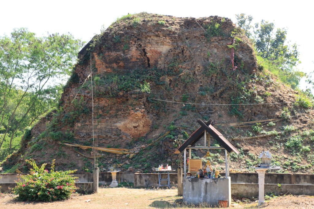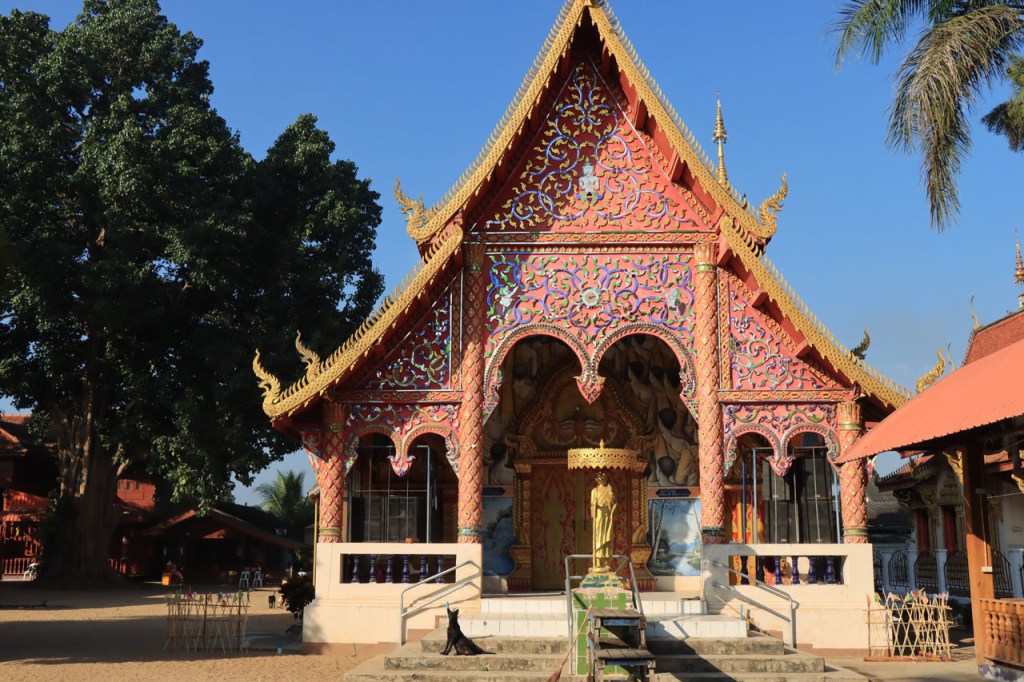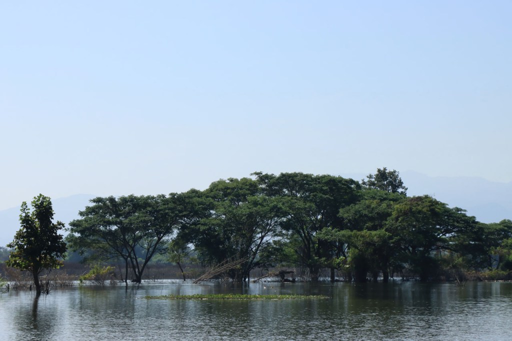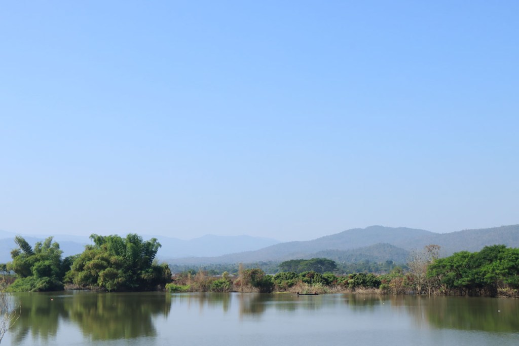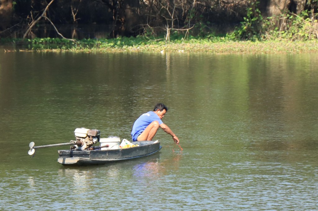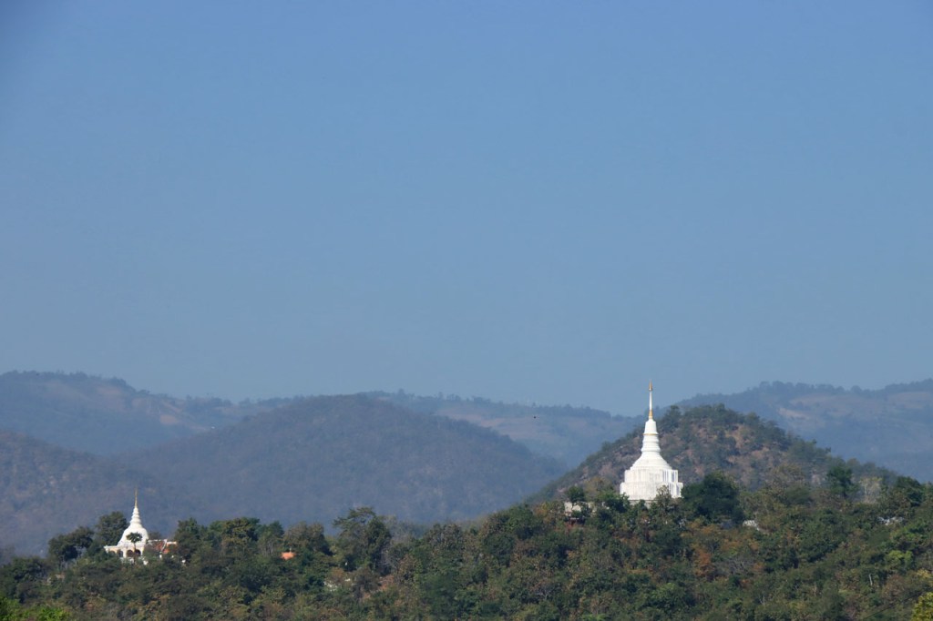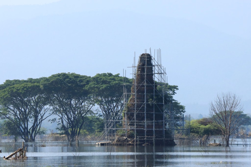 Het was vanmorgen best koud, ik had 15° bij het vertrek en toen was het toch al 9 uur. Omdat ik gisteren al zowat de helft van de voor vandaag voorziene rit deed, deed ik het vanmorgen allemaal rustig aan. Vanwege dat kortere ritje begon ik ook met een stukje terug te rijden, naar een paar figuren die ik gisteren al merkte maar toen niet bij stopte. Je ziet aan de ingang van een tempel wel eens meer een paar vervaarlijk uitziende figuren met zwaard of zware knuppel, die kan je dan wegzetten als mythologische figuren maar hoe je geweren met de boeddhistische filosofie rijmt dat weet ik niet 🙂 . Ik moest vandaag ook een overzetbootje nemen omdat de omgeving overstroomd is. Je vraagt je af hoe dat kan, het heeft al weken niet meer geregend 🙂 . Er vaart dus wel een bootje maar je moet er een paar natte voeten voor over hebben om aan boord te geraken. Er is wel aan beide kanten assistentie voorzien om de scooters te laden.