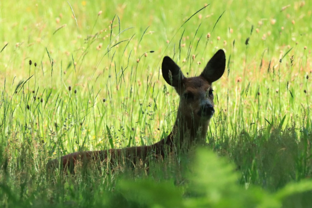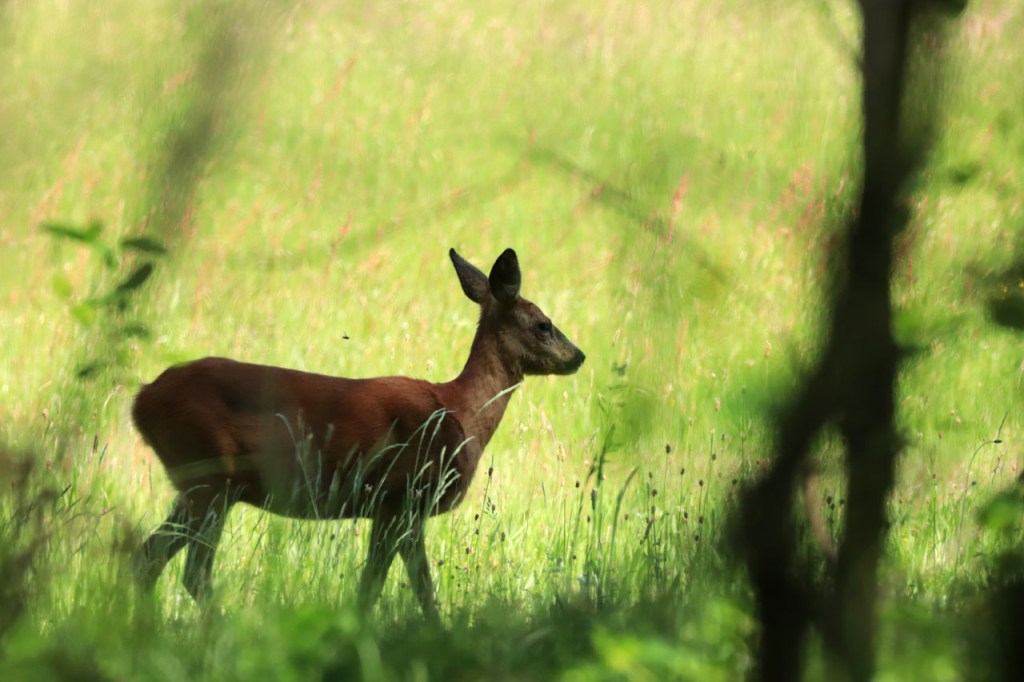 Na 10 dagen fietsen werd er vandaag nog eens gewandeld. Niet dat ik het fietsen beu was, de wind wel maar ook dat speelde geen rol in de beslissing, maar omdat ik de verplaatsing naar de Kempen met de trein maakte en daar hoort dan een wandeling bij. Het werd een mooie wandeling vandaag; enkele leuke insecten, wat vogeltjes, de eerste libellen van het jaar, een prachtige roofvogel … en dan de ree. Ze stond op pakweg een 30 meter, met tussen ons wat bomen en struiken. Nadat ik al even stond te kijken, vlijde ze zich rustig neer in het gras. Ze keek daarbij wel eens naar mij maar schijnbaar verontruste ik ze niet. Ik ben dan maar nog even rustig blijven staan kijken om uiteindelijk stilletjes te verdwijnen, de ree nog steeds rustig in haar positie achterlatend.