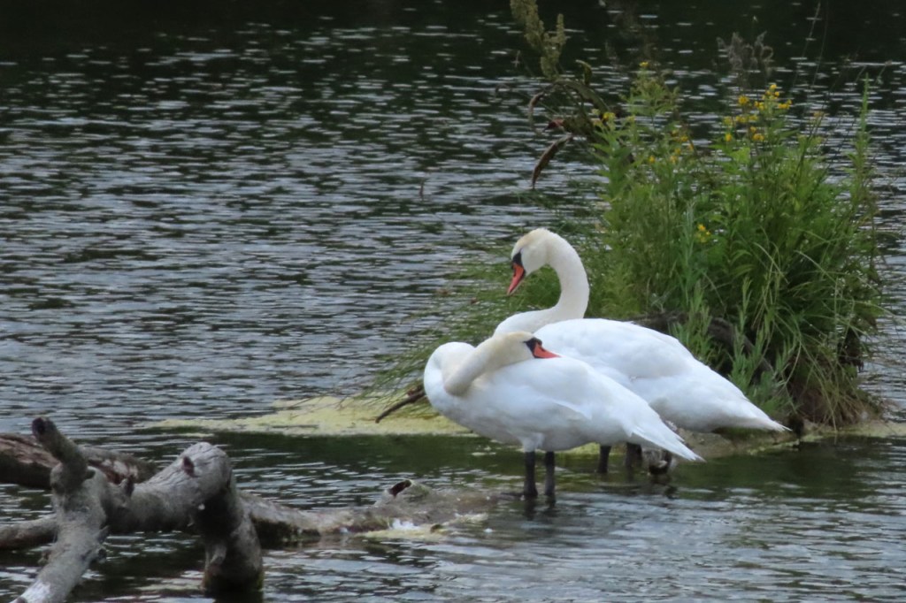 Het was vandaag weer “oren in het graan” dag. Ze bleven deze keer wel weer gewoon ter plaatse. Verder had ik deze namiddag een beeld waar ik enorm veel spijt van heb. Er stond een ree, een mannetje, even onder mij in wat water, mij over zijn rechter schouder aankijkend. Hij bleef zo nog best rustig staan maar niet lang genoeg om mijn camera te nemen, aan te zetten, te richten, in te zoomen, focussen en afdrukken. Daartegen was hij toch weg. Het was echt een droomplaatje, dat ik dus net niet gescoord heb 😦 .