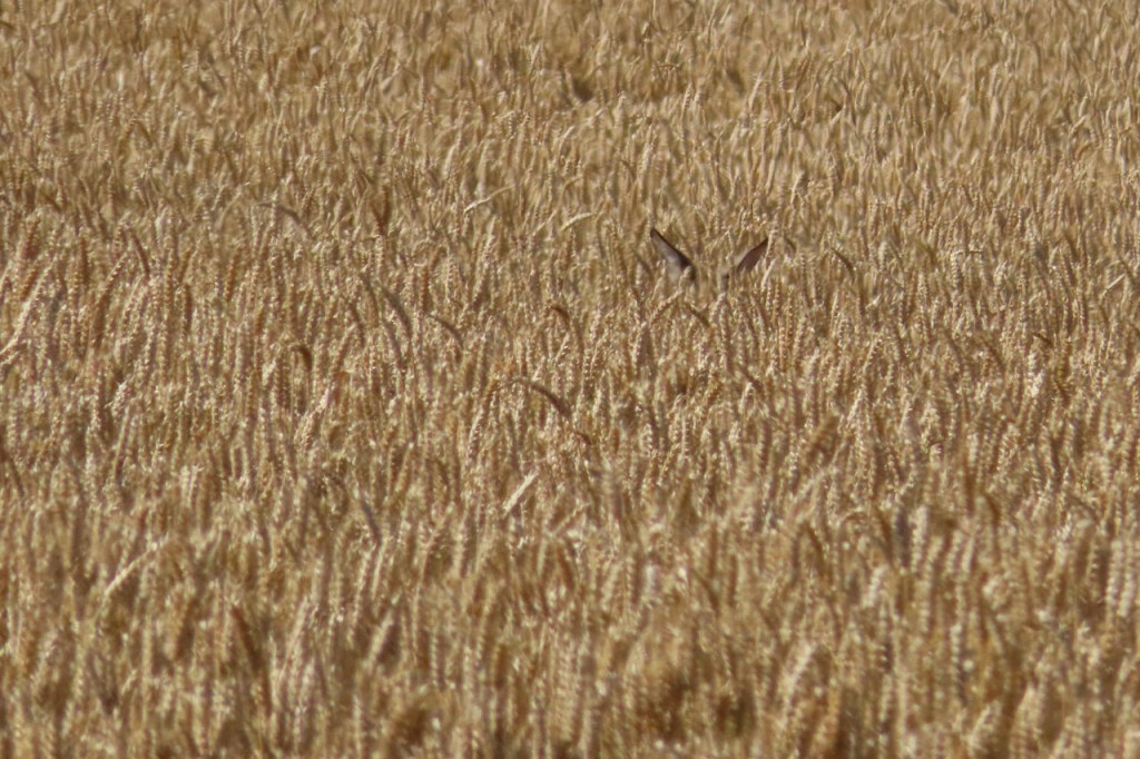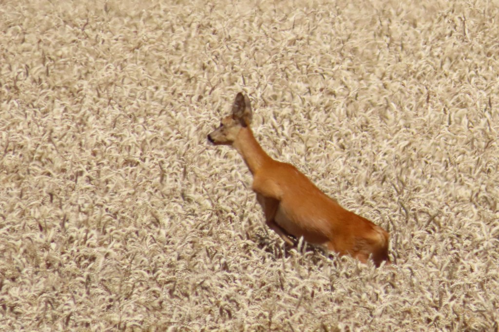 Het was vandaag weer “oren in het graan” dag. Ze bleven deze keer wel weer gewoon ter plaatse. Verder had ik deze namiddag een beeld waar ik enorm veel spijt van heb. Er stond een ree, een mannetje, even onder mij in wat water, mij over zijn rechter schouder aankijkend. Hij bleef zo nog best rustig staan maar niet lang genoeg om mijn camera te nemen, aan te zetten, te richten, in te zoomen, focussen en afdrukken. Daartegen was hij toch weg. Het was echt een droomplaatje, dat ik dus net niet gescoord heb 😦 .