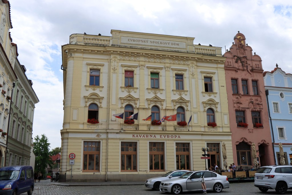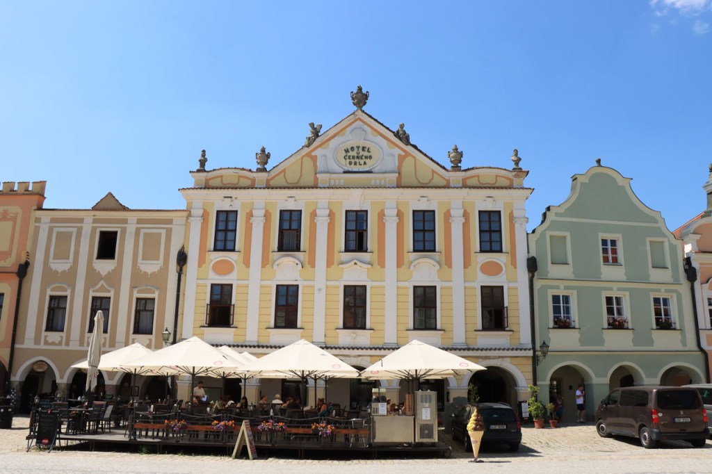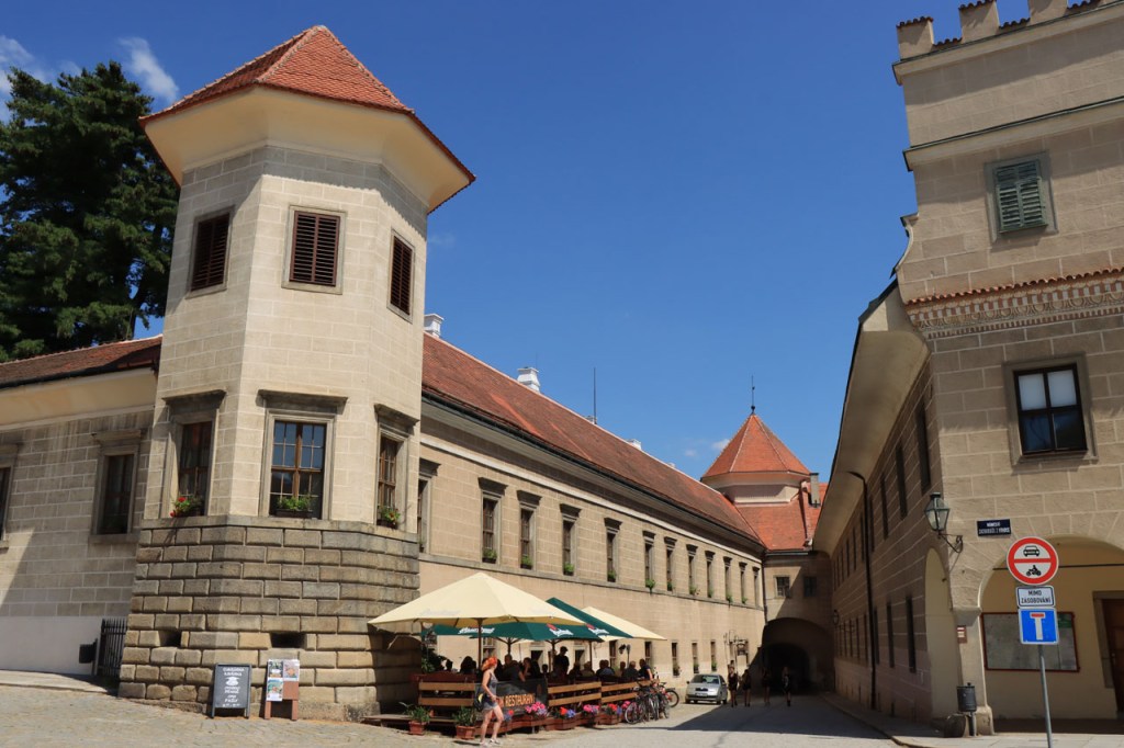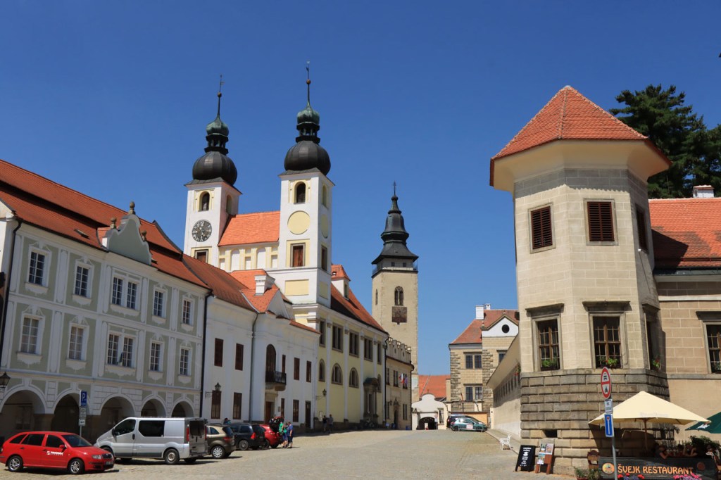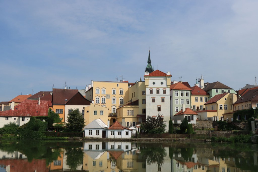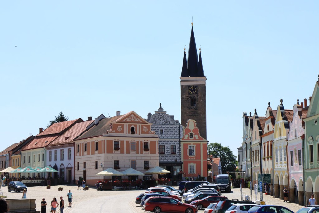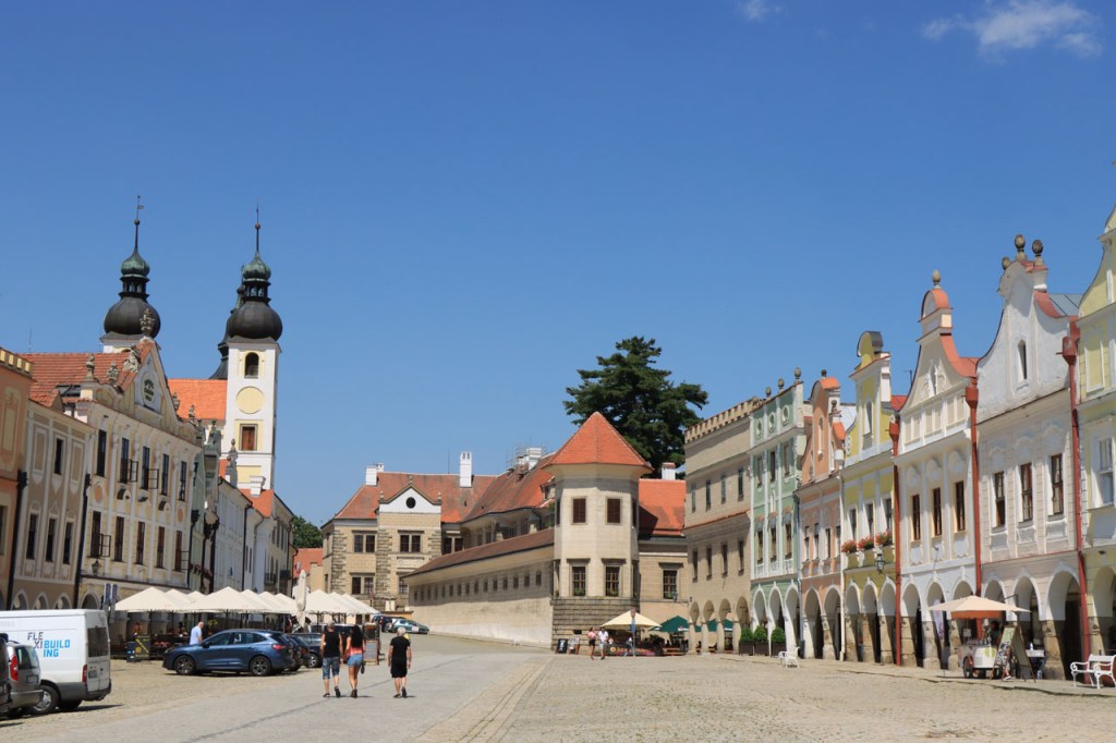 Het blijft tropisch. Na 30 kilometer bereikte ik Telc, de reden om deze richting uit te komen. Hier in de buurt had ik ook eventueel een camping moeten vinden, en zou ik ook gevonden hebben. Het zou dus toch weer nog een heel eind bovenop de rit van gisteren geweest, Jihlava was dus een goed idee. Ik moet eerlijk zeggen dat het Grand Hotel ook wel een leuke afwisseling was op het kamperen, de dag ervoor was ook wel binnen maar dan toch eerder nog kamperen 🙂 . Je kon in het hotel ook nog wel zien dat het ooit wel Grand geweest is, alleen is het wat blijven hangen in die tijd. Ik zou er vandaag een keer wat vroeger een einde aan maken, daarvoor zou ik in Strmilov een camping vinden. Alleen was er in Strmilov geen spoor van een camping. Ik was dan ook in het centrum naar aanwijzingen gaan zoeken. Uiteindelijk kon ik op enkele kaarten op het plein, waaronder bijvoorbeeld eentje met de fietsroutes van de streek, inderdaad wel zien waar de campings zich bevonden, in tweevoud. Toen ik terug uit het centrum op de grote weg kwam zag ik ook meteen een wegwijzer naar één van hen, als ik op de grote weg was gebleven had ik dus geen problemen gehad. Ik was nu dus wel goed op tijd en best nog fit om een blog te maken maar er is hier geen wifi, toch weer uitstel dus.