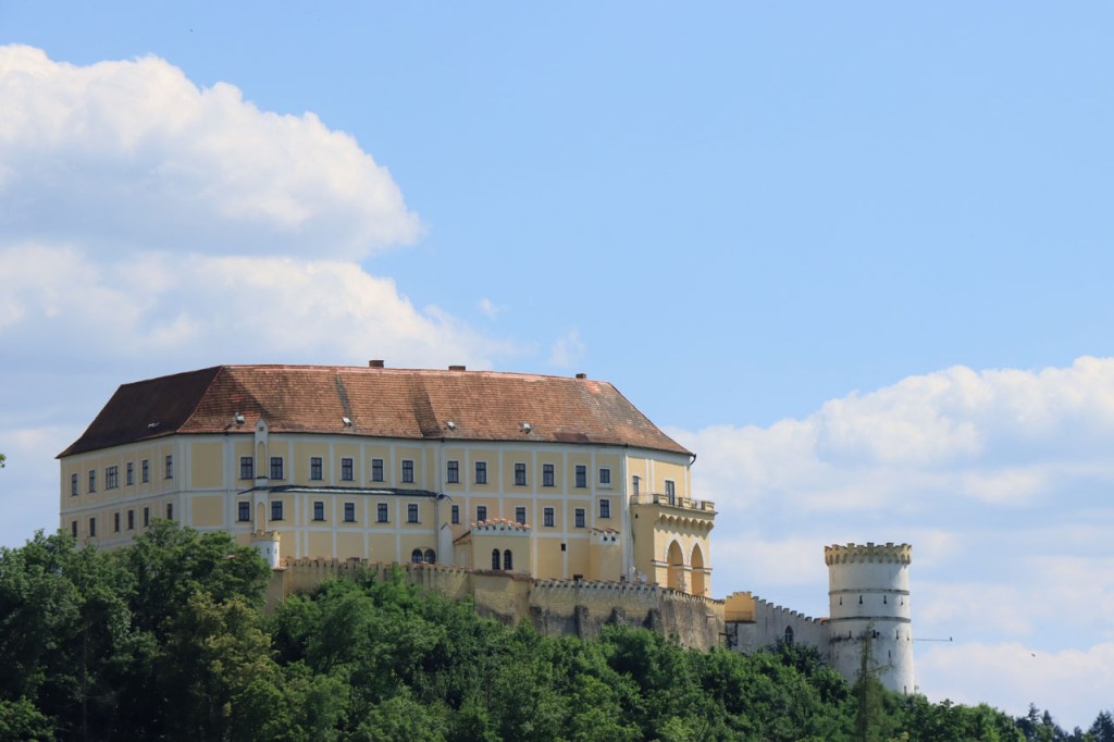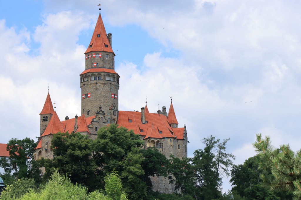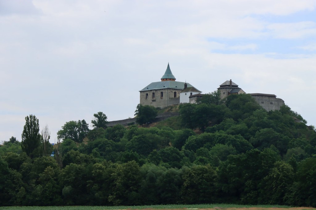 Om 7 uur was het nog overwegend grijs maar tegen 9 uur was het alweer bakken in de zon. Toch leek het wat beter mee te vallen dan de voorbije dagen, de wind leek wat frisser. In de schaduw van de bossen was het zelfs wel eens aangenaam om te fietsen maar bergop rijden tussen de open velden bleef zwaar, zeker toen in de namiddag de wind leek weg te vallen. De wegen lijken hier wat meer glooiend in plaats van bergachtig maar het valt dikwijls toch fel tegen. Ik maakte vandaag nog eens een ommetje voor een “must see” kasteel. Toen ik enkele dagen geleden het kasteel van Sternberk ging bekijken bleek dat eigenlijk een vergissing, hoewel het best het zien waard was. Het must see kasteel was echter dat van Cesky Sternberk. Inderdaad een indrukwekkend bouwsel maar zodanig groot dat het moeilijk in beeld te brengen is. Aanvankelijk was het de bedoeling om nog door te gaan richting Praag maar toen ik hier was vond ik het eigenlijk al wel genoeg. Gelukkig vond ik op een kaart op het pleintje enkele campings in de buurt, ik koos voor de eerste die ik zag. Het is een beetje een alternatieve camping met enkel tenten. Het liep ondertussen wel goed vol, vooral met groepen kanoërs en rafters die de Sasava afvaren, het ziet er ondertussen behoorlijk als een festivalcamping uit. Het nadeel van groepen is dat die gezellig samen gaan zitten praten en daarbij al vlug wat luider worden. Vanaf de bar klinkt ondertussen de schlagermuziek. Mijn fiets is het enige voertuig op de camping 🙂 , de boten liggen aan de kant en eventuele voertuigen blijven op de parking aan de rand. Engels is op de camping erg beperkt, ik heb geen moeite gedaan om te vragen of er zelfs maar wifi beschikbaar is.