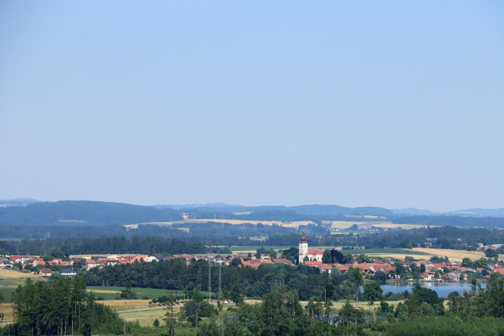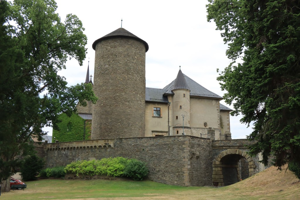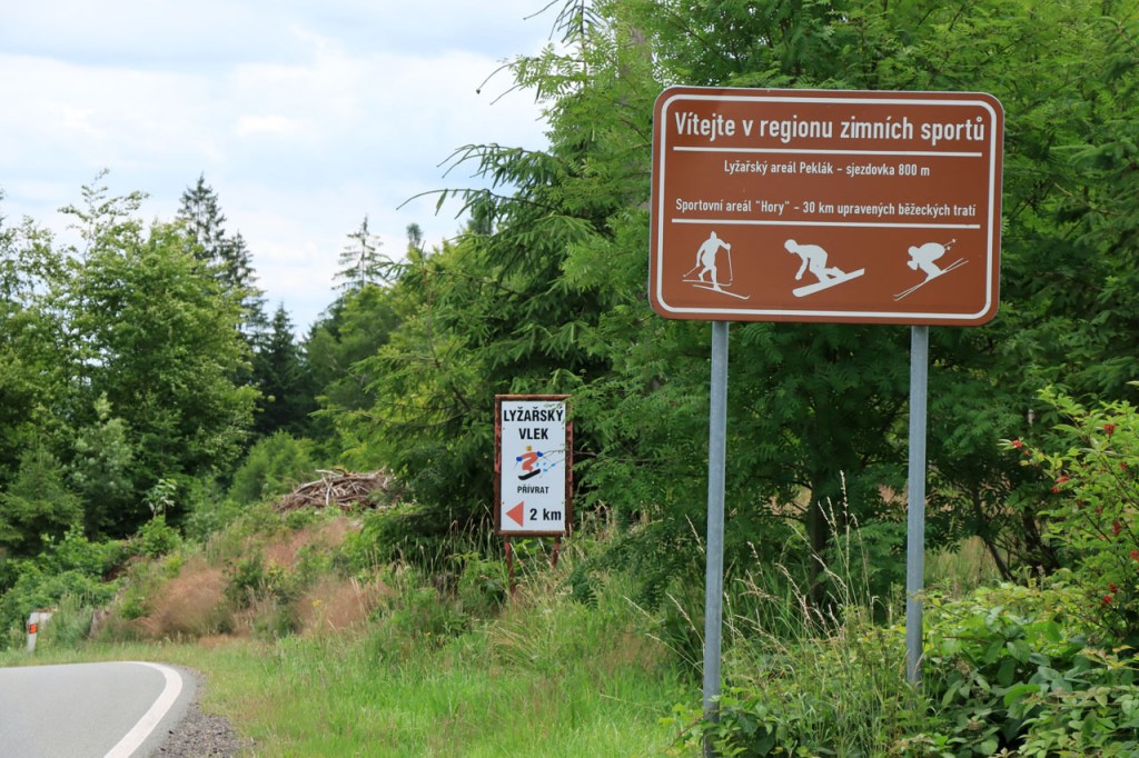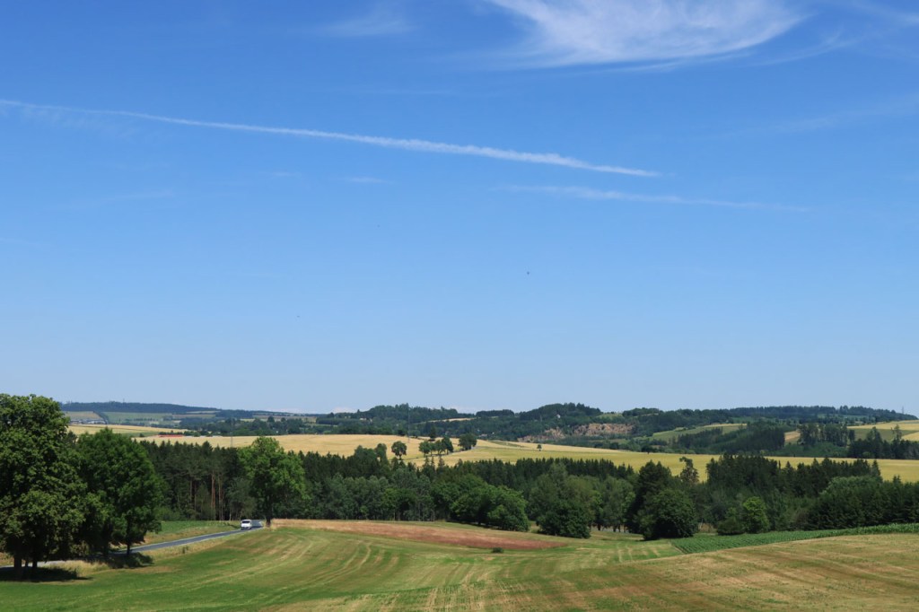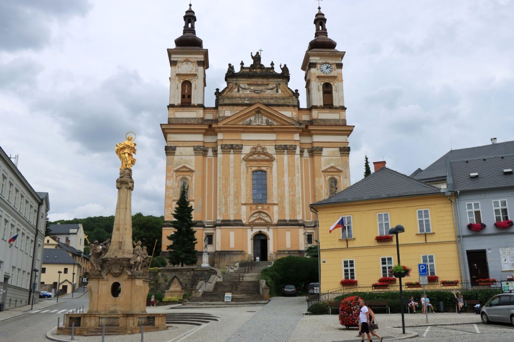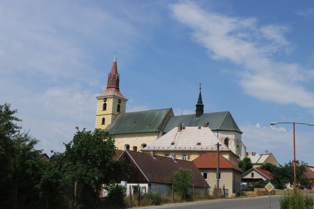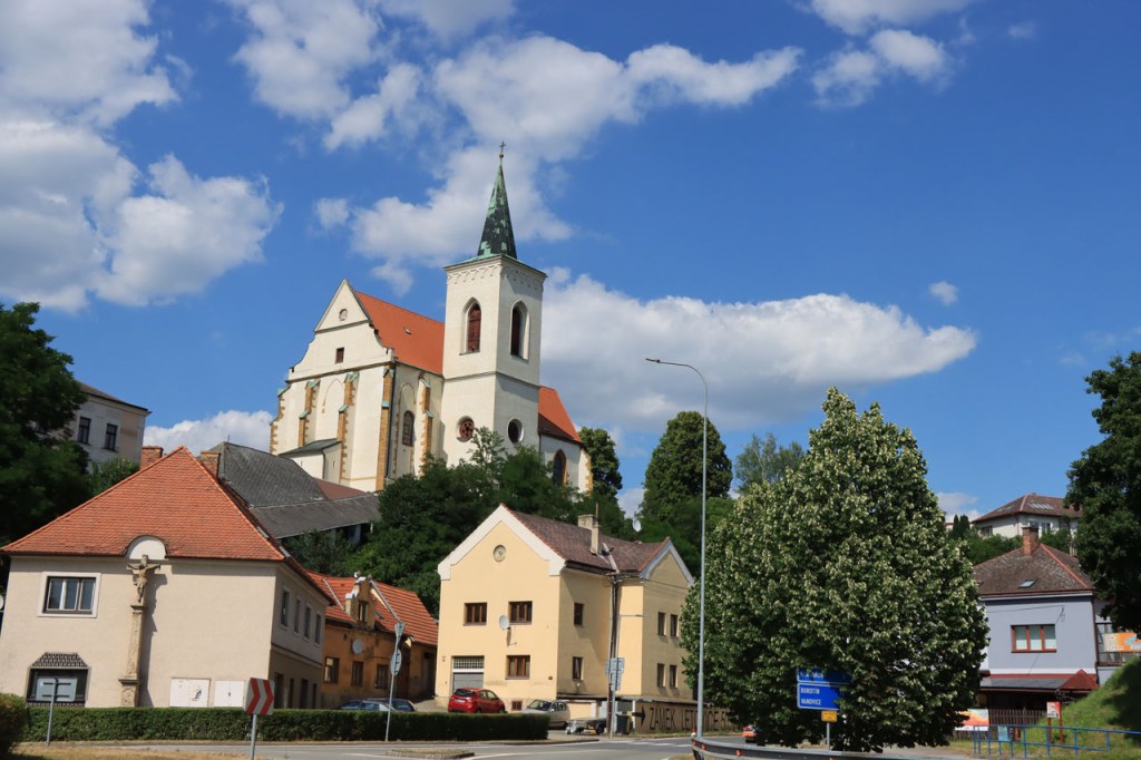Vandaag weer tropisch. Omdat ik niet langs dezelfde weg wilde vertrekken als dat ik gekomen was, nam ik de ietwat langere route langs de andere kant. Natuurlijk moest ook langs hier weer geklommen worden natuurlijk, stevig geklommen zou blijken. Het kabbelende riviertje voor de deur zou iets verder een stevig stuwmeer blijken te zijn. Ik passeerde vandaag langs Nove Mesto. Nove Mesto is misschien niet de grootste culturele naam in Tsjechië maar wel één van de sportiefste. Elk jaar passeert hier het circus van de wereldbeker mountainbike en in de winter komt het biatlon wel eens langs. Bij het naderen van de stad kon ik in de verte ook nog een skischans opmerken. Verder is het ook wel een best leuk stadje natuurlijk, met een opvallend kerkje. In frissere omstandigheden zou ik mogelijk even langs het biatlonstadion gepasseerd zijn maar het lag een drietal kilometers de verkeerde kant uit, en waarschijnlijk ook nog wel een stuk de berg op, en na de zware rit van gisteren en de stevige start van vanmorgen had ik de energie niet voor die extra inspanning. Ik deed in Nove Mesto wel een stevige poging om dat energiepeil terug wat op te krikken, met een dubbele koffie en een lekkere, stevige wafel 🙂 . De zwaarste beklimmingen waren na Nove Mesto wel achter de rug maar het bleef wel de hele tijd op en neer gaan en elke stijging was weer lastig. Al ging het wel stilaan terug beter, dankzij de koffie en de wafel? 😉 Een potentiële camping, zonder garanties want die heb je eigenlijk nooit, zou vandaag weer erg ver worden dus had ik al op voorhand beslist om, indien mogelijk, naar een hotel uit te kijken. Nove Mesto vond ik na 38 kilometer echt nog wel te vroeg maar verder bleek er niets te zijn. Na 77 kilometer zag ik wel iets maar dat bleek gesloten te zijn van 1 tot 10 juli, wat een idee om je hotel te sluiten in de piek van het hoogseizoen. Het zou dan in principe Jihlava worden, toch een behoorlijk grote plaats dus dat moest wel lukken. Ter plaatse bleek dat toch nog wel tegen te vallen maar ik vond uiteindelijk toch een plaatsje in het “Grand Hotel”. Het is waarschijnlijk een beetje meer Grand van naam dan van werkelijkheid maar ik heb wel een mooi kamertje voor een schappelijke prijs. Ik ben hier natuurlijk ook nog eens uit gaan eten, koken op mijn kamertje leek me geen goed idee 😉 , niet zomaar pizza maar echt eten met soep, aardappelen, groenten en vlees 🙂 . Ik ben ook vanavond weer best moe maar slaagde er toch in om de blog nog in orde te krijgen.