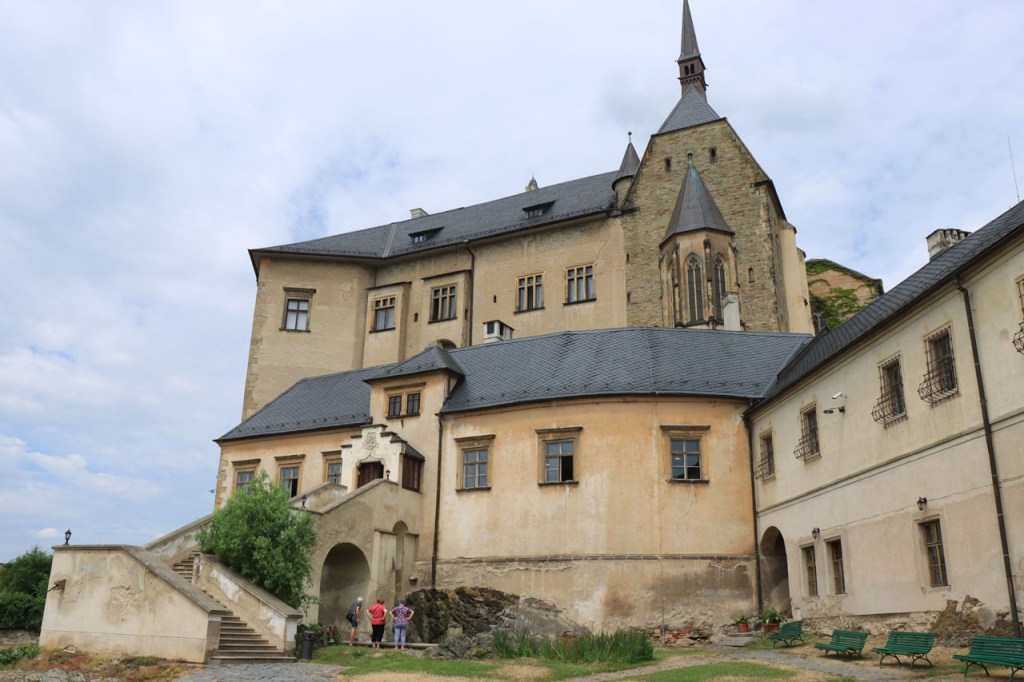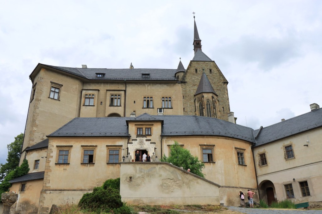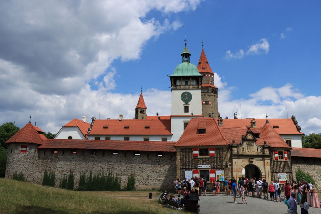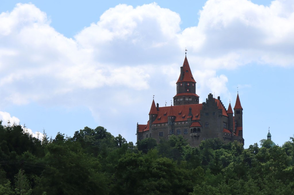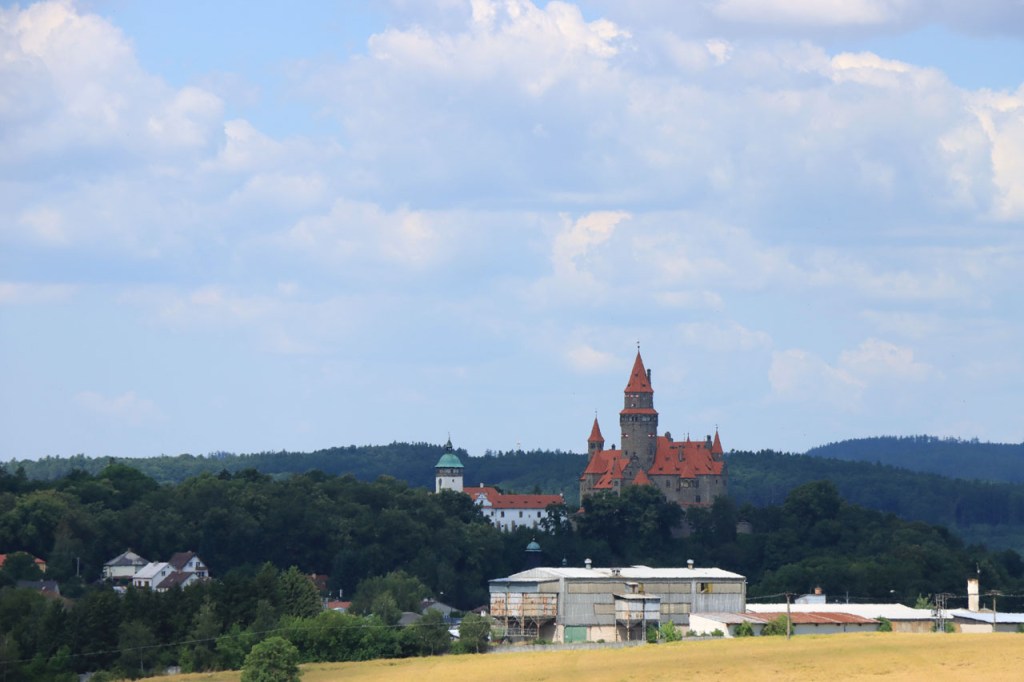 Vandaag waren we weer terug in de tropen 🙂 . Vanmorgen weer begonnen met een ommetje langs een kasteel, dat van Bouzov, waarbij ik wel heel erg dicht kwam bij waar ik een paar dagen geleden nog was. Ik heb nog gedacht van terug richting Policka te rijden voor de camping maar besloot het toch maar niet te doen, zo bijzonder was het nu ook weer niet. Het kasteel van Bouzov is er echt wel eentje uit de prentjesboeken, al van kilometers ver zie je het ook boven op zijn berg. De file voor tickets om het kasteel van binnen te bezoeken, zo veronderstel ik toch want het was me niet helemaal duidelijk, was me wat lang maar ik kon wel tot op het binnenplein. Af en toe werd de hele boel ook nog eens geblokkeerd voor foto’s en video’s van trouwpartijen, de volgende stond ook al te wachten, wat de zaak natuurlijk ook niet vooruit hielp. Na Bouzov ging het verder in overwegend zuidoostelijke richting. In de loop van de namiddag werd het snel duidelijk dat mijn beoogde camping wat ver zou zijn. Na 80 kilometer probeerde ik bij een hotel waar “Bikers” welkom waren maar ik was blijkbaar een verkeerde soort biker. Nu, de man had schijnbaar maar 2 kamers bij zijn restaurant en die bleken beiden bezet. Een eind verder zag ik in een dorp een verwijzing naar een hotel op 1 Km. Die eventuele 2 extra kilometers zou ik dan ook maar riskeren en dus ging ik eens informeren. Nu was die ene kilometer wel wreed zwaar en bleken het uiteindelijk inderdaad 2 extra kilometers, ook dit hotel was volzet. De volgende kilometers kwam ik niets meer tegen en dus zat er niets anders op dan maar door te rijden naar de camping. Daar bleek echter een festival plaats te hebben, de hele omgeving stond overvol met tentjes maar het mijne wilden ze er niet meer bij hebben. De man aan de ingang beweerde echter dat er 4 a 5 kilometer verder nog een camping zou zijn, nog een eindje verder dus. 5 kilometer verder was er niets te merken van een camping. Ik zag wel een kleine wegwijzer naar een “basecamp” en besloot daar eens een kijkje te gaan nemen. Wat ik vond was een kleine bar/bistro onderaan een rotspartij. Een camping was er niet maar de uitbater van de bar had wel een plaatsje waar een tentje kon staan, waar klimmers wel eens gebruik van maken, en waarbij ik de faciliteiten van zijn bar zou kunnen gebruiken. Uiteindelijk werd het het zoldertje van zijn bar, waar ook al eens klimmers overnachten. Ik zou er later zelfs nog 2 bikepacker collega’s bij krijgen. Deze rit was duidelijk veel te zwaar, de zwaarste in lange tijd, met naast de afstand ook nog pakweg 1.800 hoogtemeters en daardoor pakweg 8 uur in het zadel. Ik had hier buiten mijn potje kunnen gaan koken maar het was ondertussen zo laat en ik was zo moe dat ik het maar bij pizza en bier gehouden heb. Ik was ook te moe voor een blog en heb dus naar zijn wifi niet eens geïnformeerd.