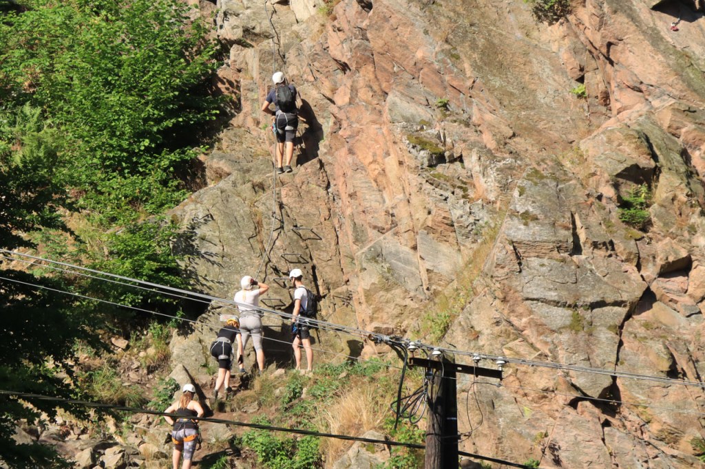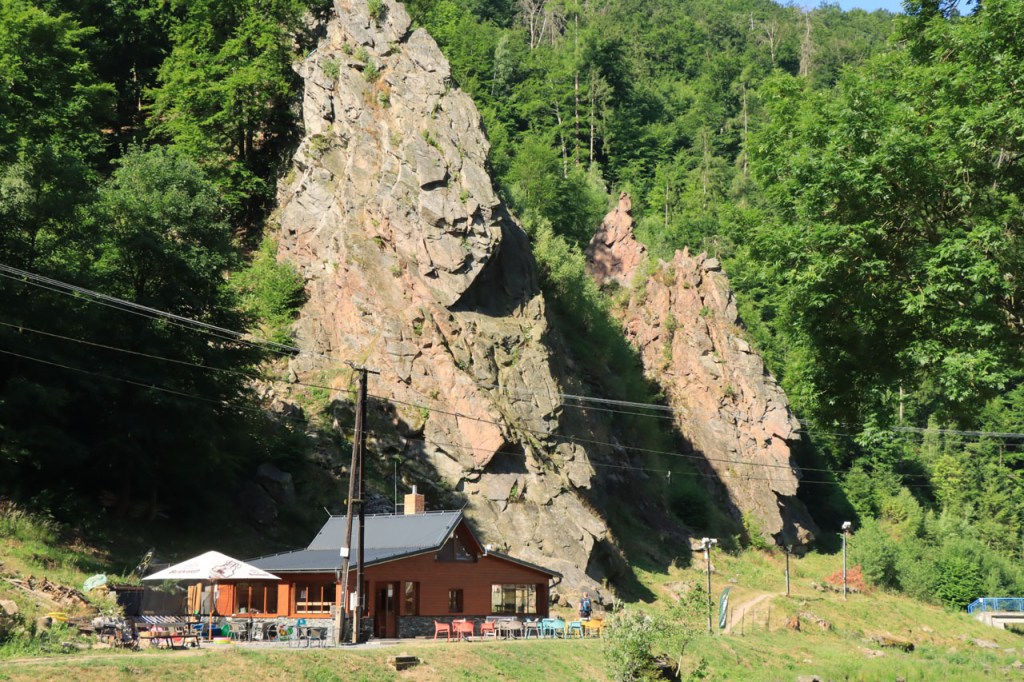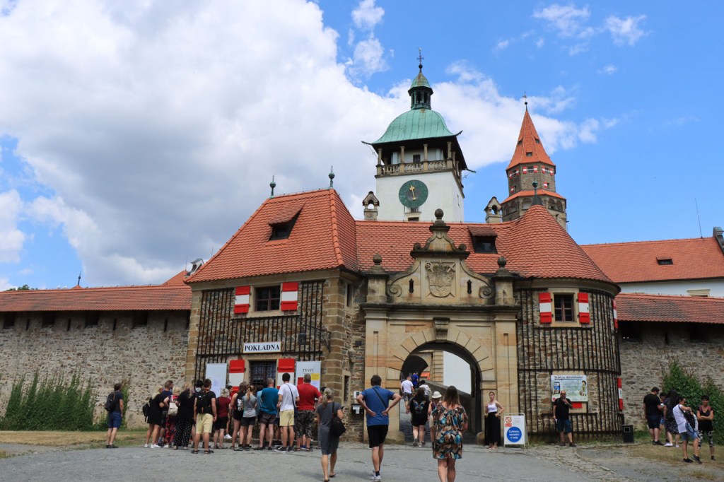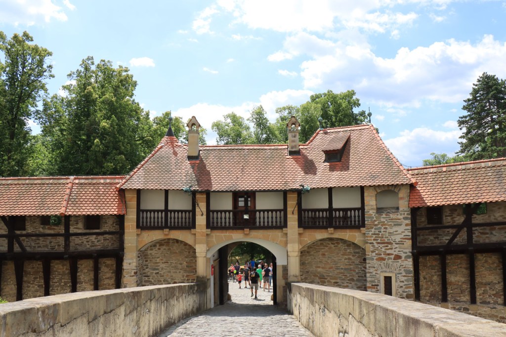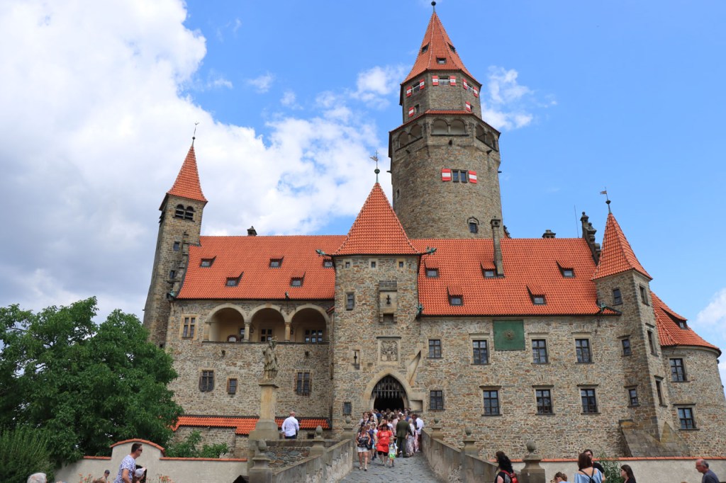 Vandaag waren we weer terug in de tropen 🙂 . Vanmorgen weer begonnen met een ommetje langs een kasteel, dat van Bouzov, waarbij ik wel heel erg dicht kwam bij waar ik een paar dagen geleden nog was. Ik heb nog gedacht van terug richting Policka te rijden voor de camping maar besloot het toch maar niet te doen, zo bijzonder was het nu ook weer niet. Het kasteel van Bouzov is er echt wel eentje uit de prentjesboeken, al van kilometers ver zie je het ook boven op zijn berg. De file voor tickets om het kasteel van binnen te bezoeken, zo veronderstel ik toch want het was me niet helemaal duidelijk, was me wat lang maar ik kon wel tot op het binnenplein. Af en toe werd de hele boel ook nog eens geblokkeerd voor foto’s en video’s van trouwpartijen, de volgende stond ook al te wachten, wat de zaak natuurlijk ook niet vooruit hielp. Na Bouzov ging het verder in overwegend zuidoostelijke richting. In de loop van de namiddag werd het snel duidelijk dat mijn beoogde camping wat ver zou zijn. Na 80 kilometer probeerde ik bij een hotel waar “Bikers” welkom waren maar ik was blijkbaar een verkeerde soort biker. Nu, de man had schijnbaar maar 2 kamers bij zijn restaurant en die bleken beiden bezet. Een eind verder zag ik in een dorp een verwijzing naar een hotel op 1 Km. Die eventuele 2 extra kilometers zou ik dan ook maar riskeren en dus ging ik eens informeren. Nu was die ene kilometer wel wreed zwaar en bleken het uiteindelijk inderdaad 2 extra kilometers, ook dit hotel was volzet. De volgende kilometers kwam ik niets meer tegen en dus zat er niets anders op dan maar door te rijden naar de camping. Daar bleek echter een festival plaats te hebben, de hele omgeving stond overvol met tentjes maar het mijne wilden ze er niet meer bij hebben. De man aan de ingang beweerde echter dat er 4 a 5 kilometer verder nog een camping zou zijn, nog een eindje verder dus. 5 kilometer verder was er niets te merken van een camping. Ik zag wel een kleine wegwijzer naar een “basecamp” en besloot daar eens een kijkje te gaan nemen. Wat ik vond was een kleine bar/bistro onderaan een rotspartij. Een camping was er niet maar de uitbater van de bar had wel een plaatsje waar een tentje kon staan, waar klimmers wel eens gebruik van maken, en waarbij ik de faciliteiten van zijn bar zou kunnen gebruiken. Uiteindelijk werd het het zoldertje van zijn bar, waar ook al eens klimmers overnachten. Ik zou er later zelfs nog 2 bikepacker collega’s bij krijgen. Deze rit was duidelijk veel te zwaar, de zwaarste in lange tijd, met naast de afstand ook nog pakweg 1.800 hoogtemeters en daardoor pakweg 8 uur in het zadel. Ik had hier buiten mijn potje kunnen gaan koken maar het was ondertussen zo laat en ik was zo moe dat ik het maar bij pizza en bier gehouden heb. Ik was ook te moe voor een blog en heb dus naar zijn wifi niet eens geïnformeerd.