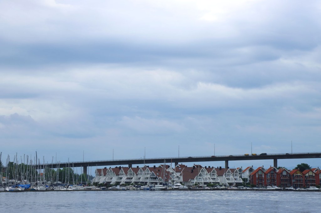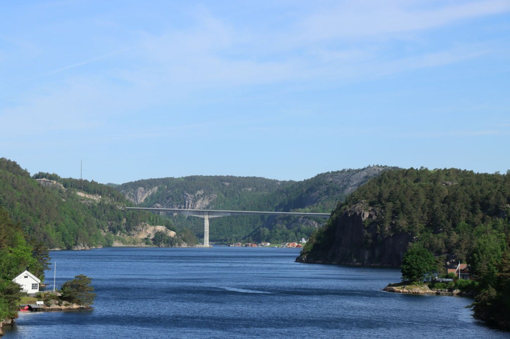 Ik had vandaag de keuze tussen een gewoon lange dag of een heel lange dag. Ik had na die bruggen eigenlijk liever een kleinere weg genomen maar die optie hield, op het moment van de finale beslissing, nog een 40 Km fietsen tot een camping in, waarvan ik natuurlijk niet kon inschatten hoe zwaar die zouden zijn en die het totaal voor vandaag op omstreeks 100 Km zouden brengen, en ook nog een veerboot, waarvan ik de timing en de duur niet ken. Ik koos dus toch maar voor de wat drukkere optie met kortere afstand naar een volgende camping. Die veerboot komt dus morgen.