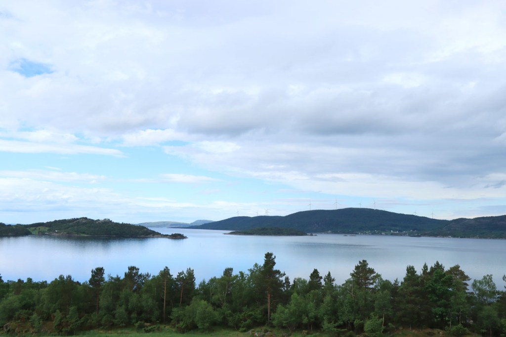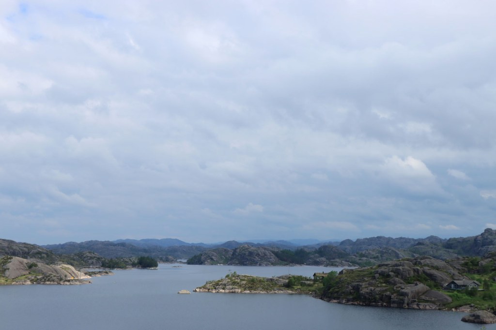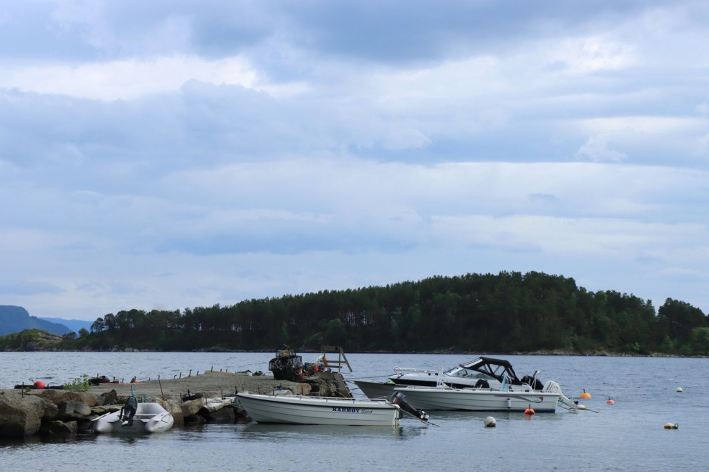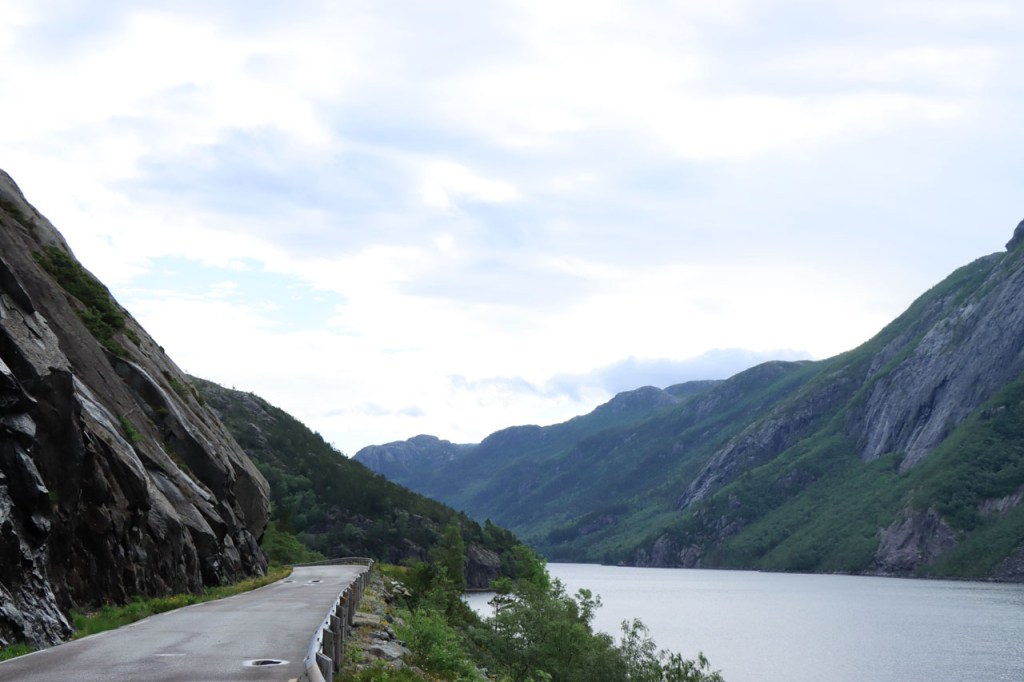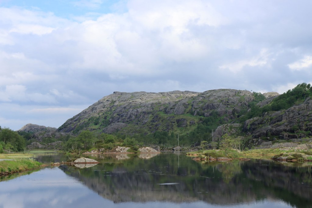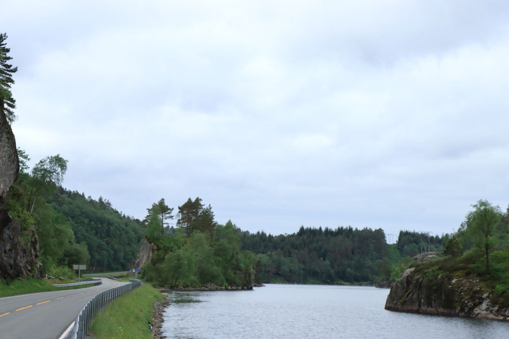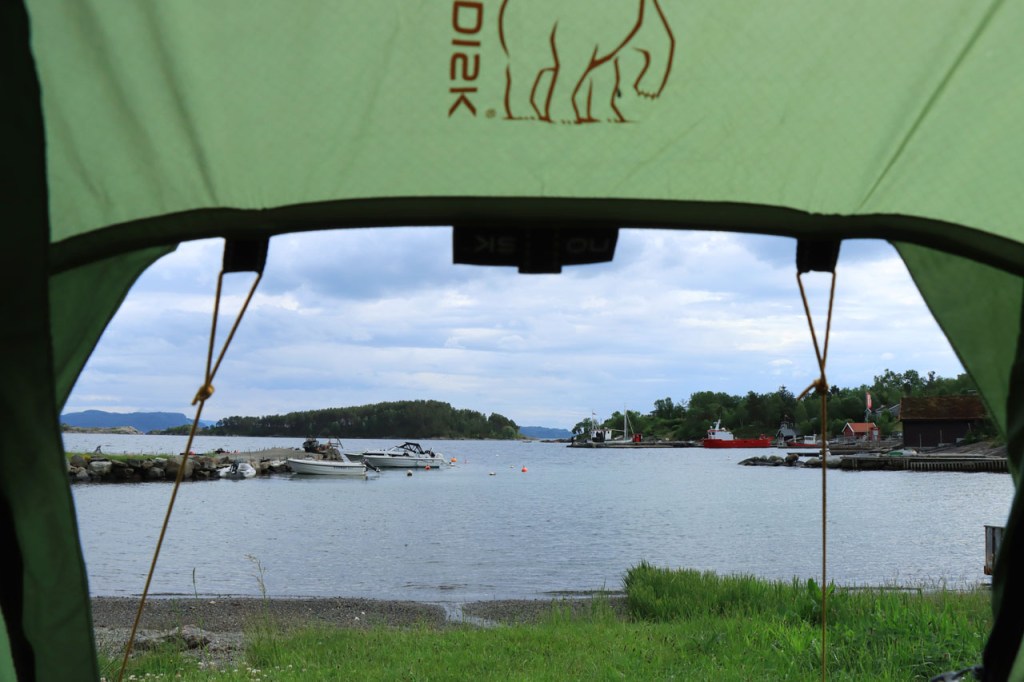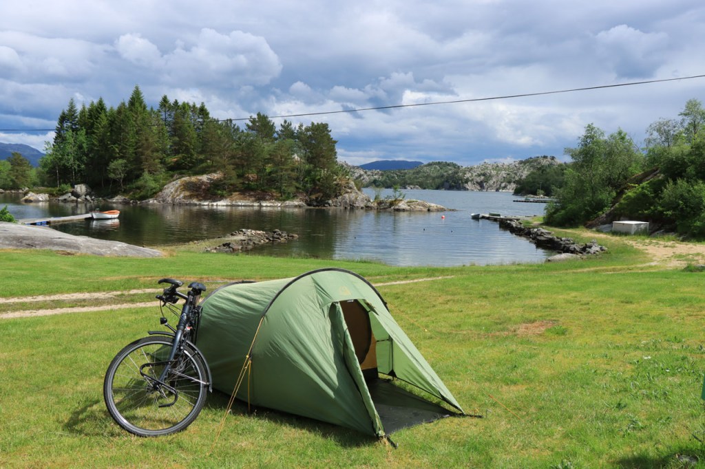 Ik heb gisteren op de camping nog wel wat mensen gezien, 2 x 2 mannen die met de kajak op de fjord gaan vissen waren en 2 vrouwen die wat kwamen kuisen en opruimen, maar niemand die iets aan me vroeg of tegen me zei. Ik heb ondertussen ook de situatie uitgewerkt. Hoewel het dus vroeger een volledig opererende camping moet geweest zijn, mijn plaatsje stond nog steeds gemarkeerd als tentplaats, huist ze tegenwoordig alleen nog campers. Zo stond het eigenlijk langs de weg ook aangekondigd maar ik had een camping nodig en ben dus toch gaan kijken. Aan de ingang staat een bareel, waar ik met de fiets automatisch langs ga, met een QR-code, via dewelke campergasten on-line kunnen inchecken en betalen waarna ze via SMS een bericht krijgen met de code om de bareel te openen. Overigens zijn er gisteren ook geen campers opgedoken. Het is wel een beetje jammer voor zo’n mooie site op zo’n mooie locatie. Ze zouden eens moeten gaan kijken naar het systeem in Nedstrand. Hoe dan ook heb ik dus gekampeerd voor de prijs van een douche, 20 Kr.