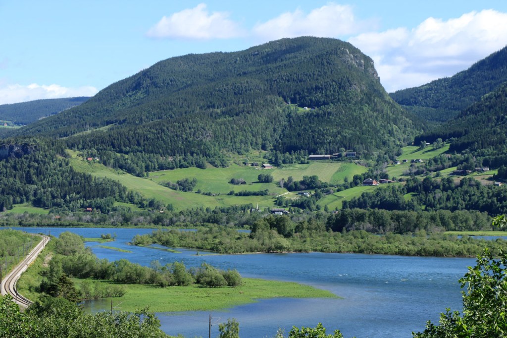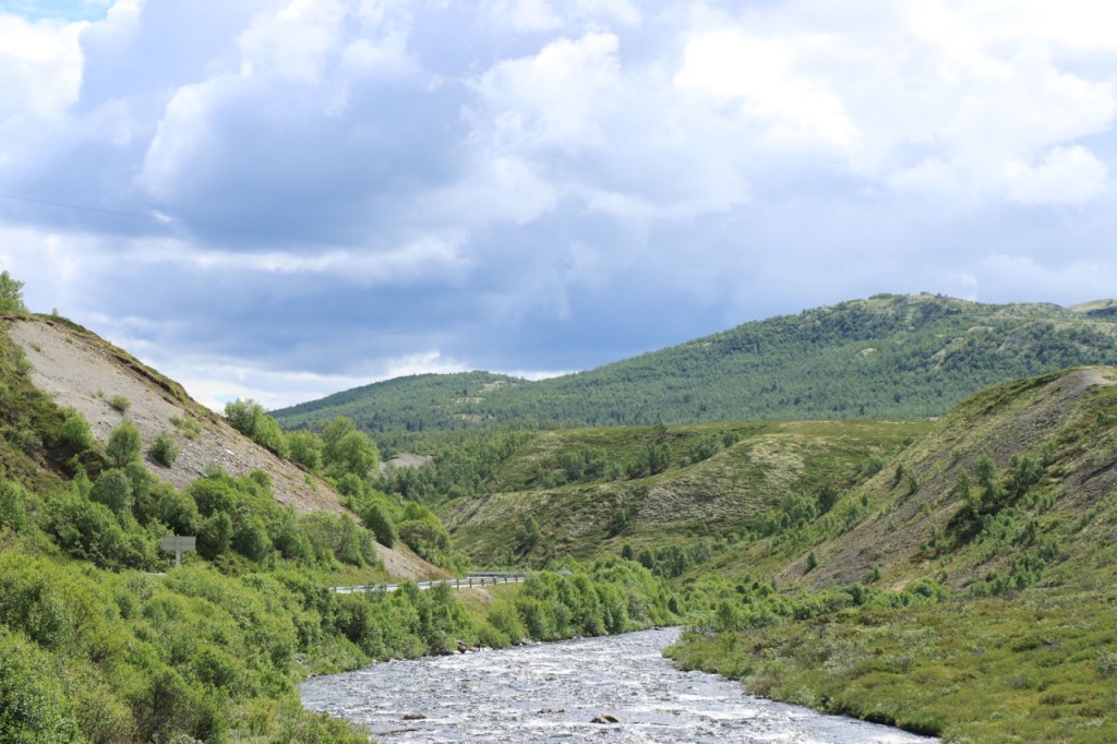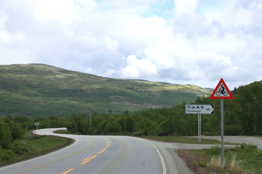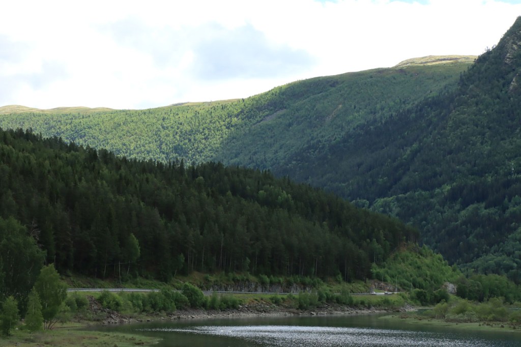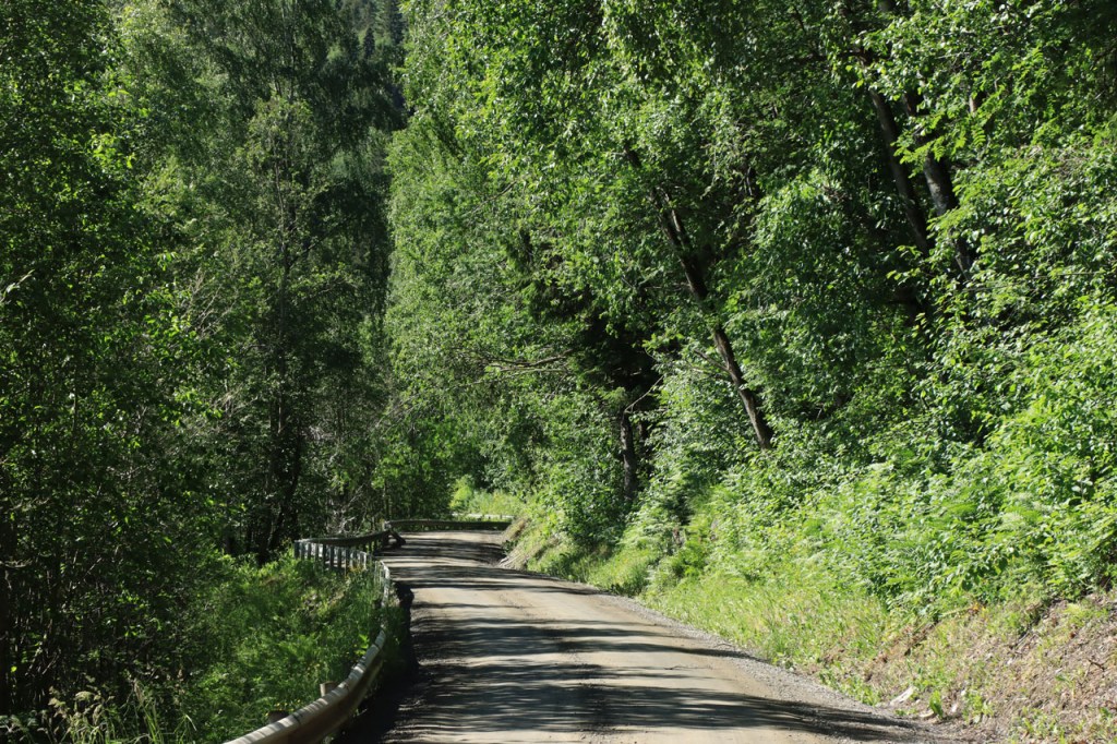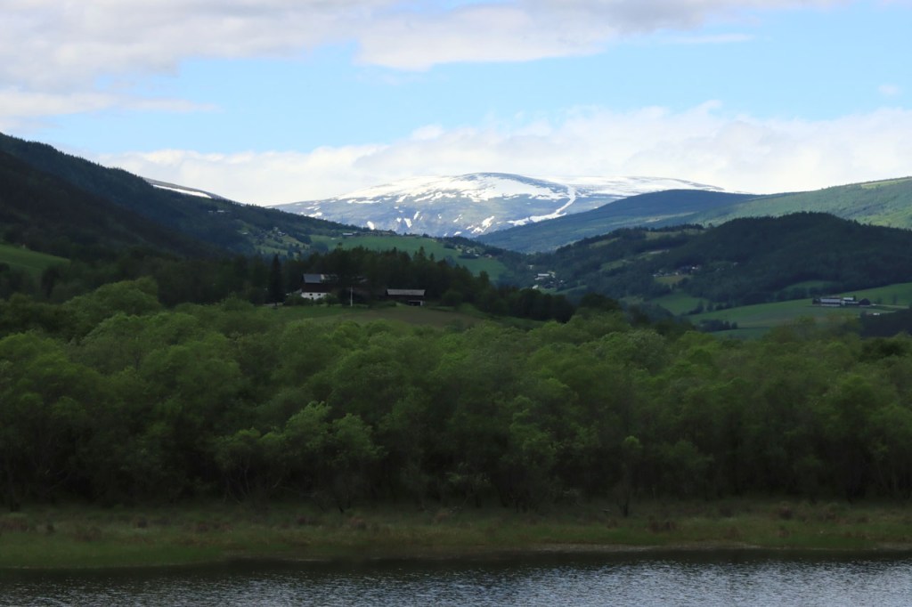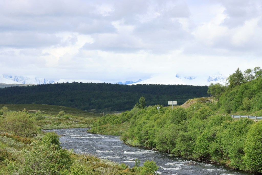 De makkelijkste route voor vandaag zou de E6 zijn maar dat was geen optie. Bij de eerste brug ging ik dus naar de overkant om daar de kleinere weg te nemen, langs de linkeroever zag ik trouwens voor dat eerste stuk geen mogelijkheid op mijn kaart. De weg aan de overkant nam echter de hoge route, weer klimmen dus. Je vraagt je af waarom. De spoorweg loopt wel mooi vlak langs het water, dan moet er toch mogelijkheid zijn om daar nog een weg naast te leggen. Hij hoeft zelfs niet verhard te zijn, de hoge weg was dat ook niet altijd. Hoe dan ook, wat een makkelijk ritje langs het water had moeten worden zou dat niet zijn. Bij de volgende brug keerde ik terug naar de andere kant om te zien of ik daar een vlakkere route kon vinden. Dat lukte bijzonder goed, tot ik met valse middelen terug naar de andere kant gestuurd werd. De Noren zetten bij elk pad of spoor dat voorbehouden is voor voetgangers en fietsers een bord maar beloven daarbij niet dat het pad of spoor ook dezelfde richting als de weg zal blijven volgen. Ik dacht bij een bepaald bord dat het fietspad onder de E6 zou duiken en deze aan de andere kant verder zou volgen. Het pad ging echter weer de rivier over en ik mocht dus terug klimmen. Achteraf bleek het misschien toch wel een meevaller. Ik zag aan de overkant grote werken rondom de E6, die de situatie daar waarschijnlijk alleen maar ingewikkelder zou maken. Ik moest dus wel weer klimmen maar vond een directe, rustige route.
