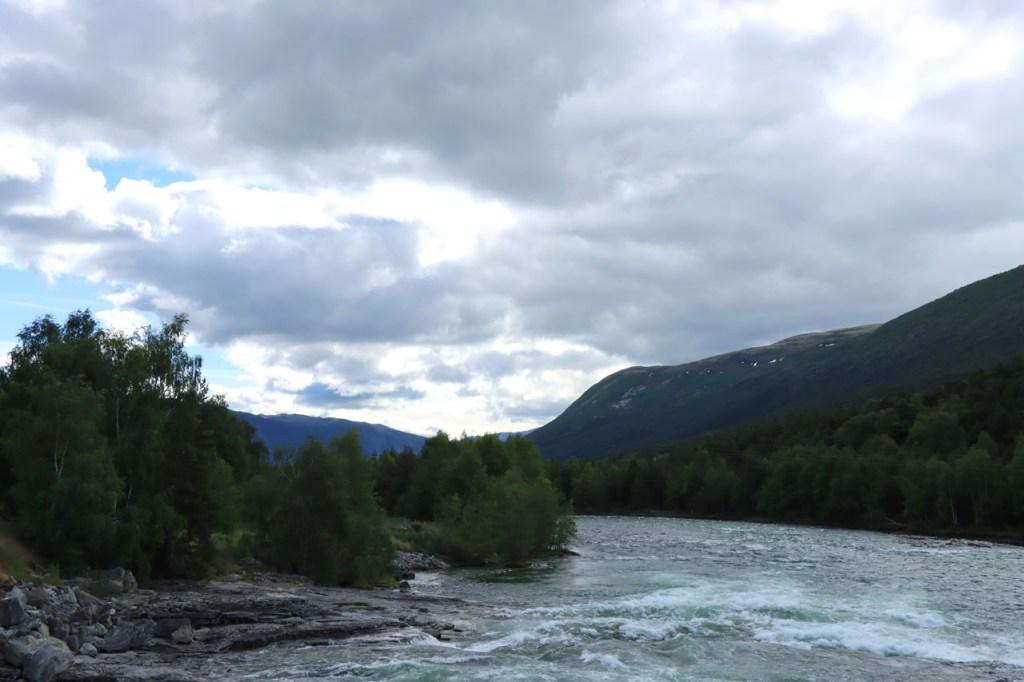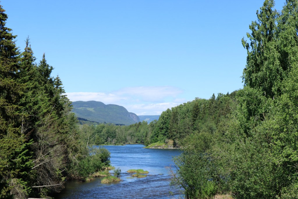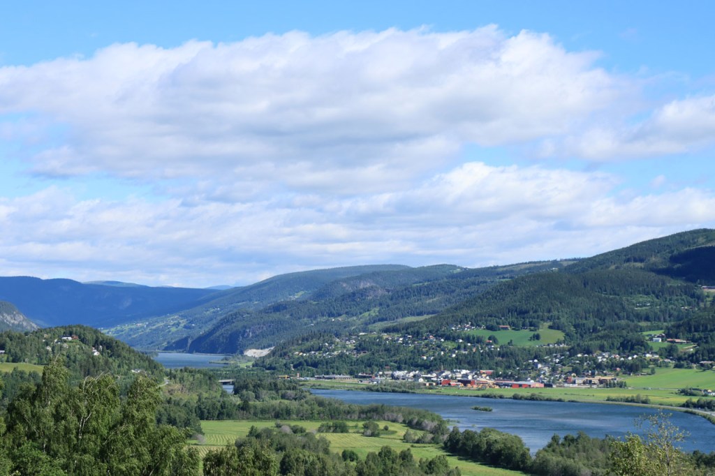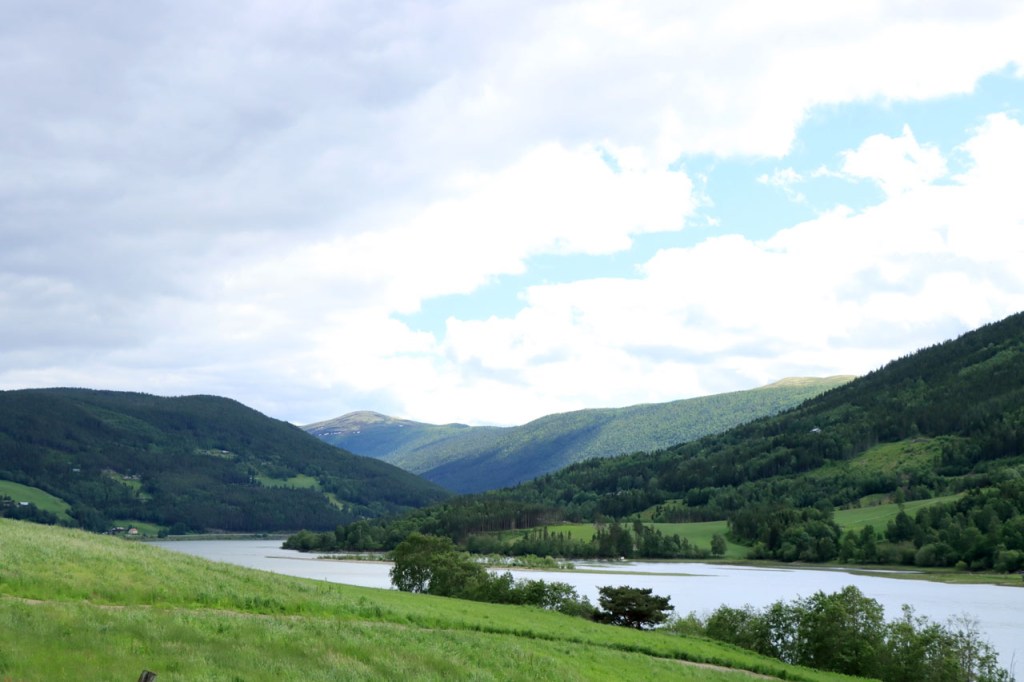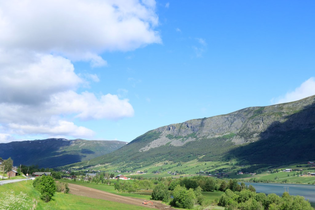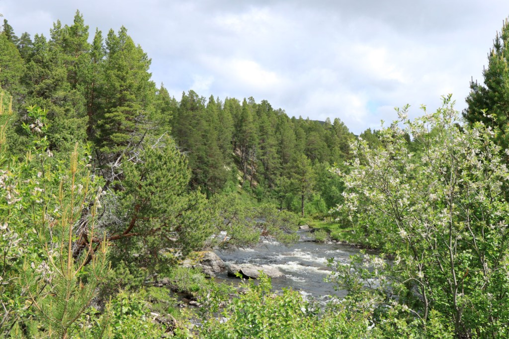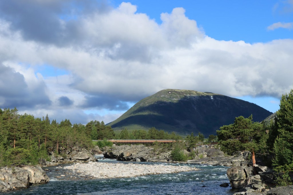 De makkelijkste route voor vandaag zou de E6 zijn maar dat was geen optie. Bij de eerste brug ging ik dus naar de overkant om daar de kleinere weg te nemen, langs de linkeroever zag ik trouwens voor dat eerste stuk geen mogelijkheid op mijn kaart. De weg aan de overkant nam echter de hoge route, weer klimmen dus. Je vraagt je af waarom. De spoorweg loopt wel mooi vlak langs het water, dan moet er toch mogelijkheid zijn om daar nog een weg naast te leggen. Hij hoeft zelfs niet verhard te zijn, de hoge weg was dat ook niet altijd. Hoe dan ook, wat een makkelijk ritje langs het water had moeten worden zou dat niet zijn. Bij de volgende brug keerde ik terug naar de andere kant om te zien of ik daar een vlakkere route kon vinden. Dat lukte bijzonder goed, tot ik met valse middelen terug naar de andere kant gestuurd werd. De Noren zetten bij elk pad of spoor dat voorbehouden is voor voetgangers en fietsers een bord maar beloven daarbij niet dat het pad of spoor ook dezelfde richting als de weg zal blijven volgen. Ik dacht bij een bepaald bord dat het fietspad onder de E6 zou duiken en deze aan de andere kant verder zou volgen. Het pad ging echter weer de rivier over en ik mocht dus terug klimmen. Achteraf bleek het misschien toch wel een meevaller. Ik zag aan de overkant grote werken rondom de E6, die de situatie daar waarschijnlijk alleen maar ingewikkelder zou maken. Ik moest dus wel weer klimmen maar vond een directe, rustige route.
