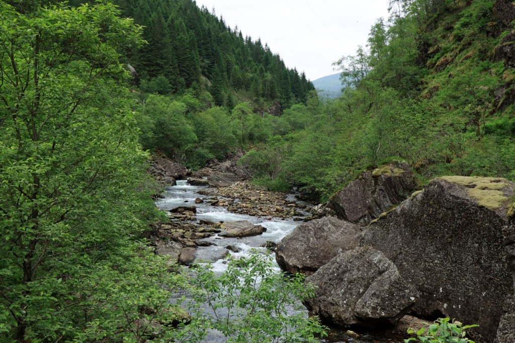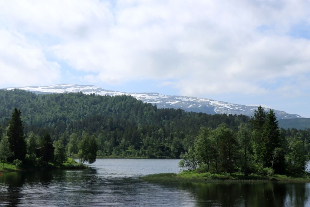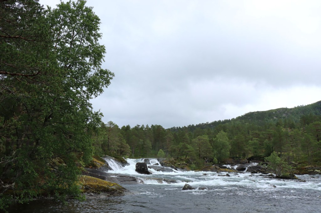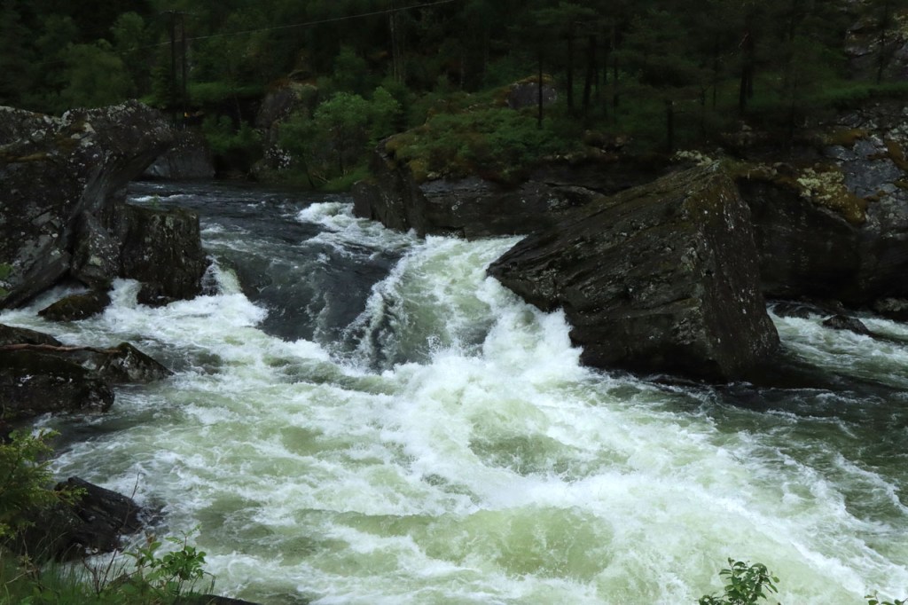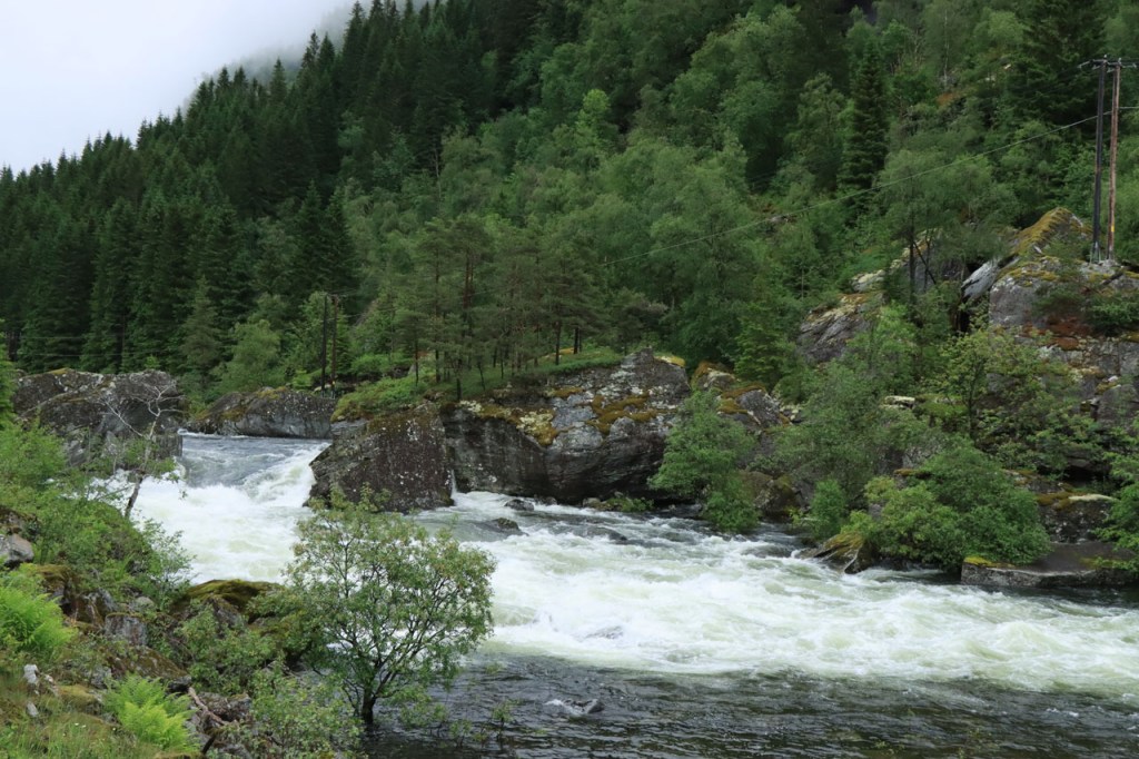Gisteren heb ik bij Bergen eigenlijk de kust als dusdanig achtergelaten maar dat wil niet zeggen dat ik meteen de zee niet meer te zien krijg, hij werkt zich in Noorwegen soms een heel eind landinwaarts 😉 . Toch kom ik al stilaan in een ander Noorwegen, het Noorwegen van de meren, rivieren, watervallen en hogere bergen, vandaag toch al boven de 400 meter, en plateaus.