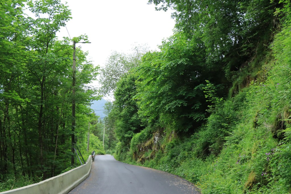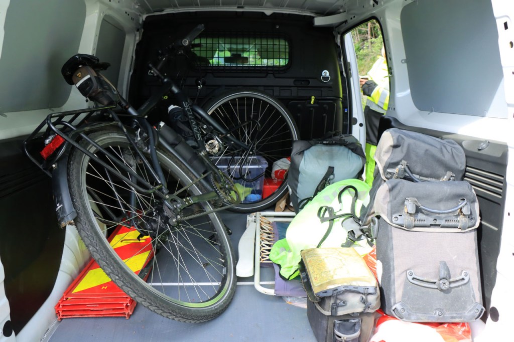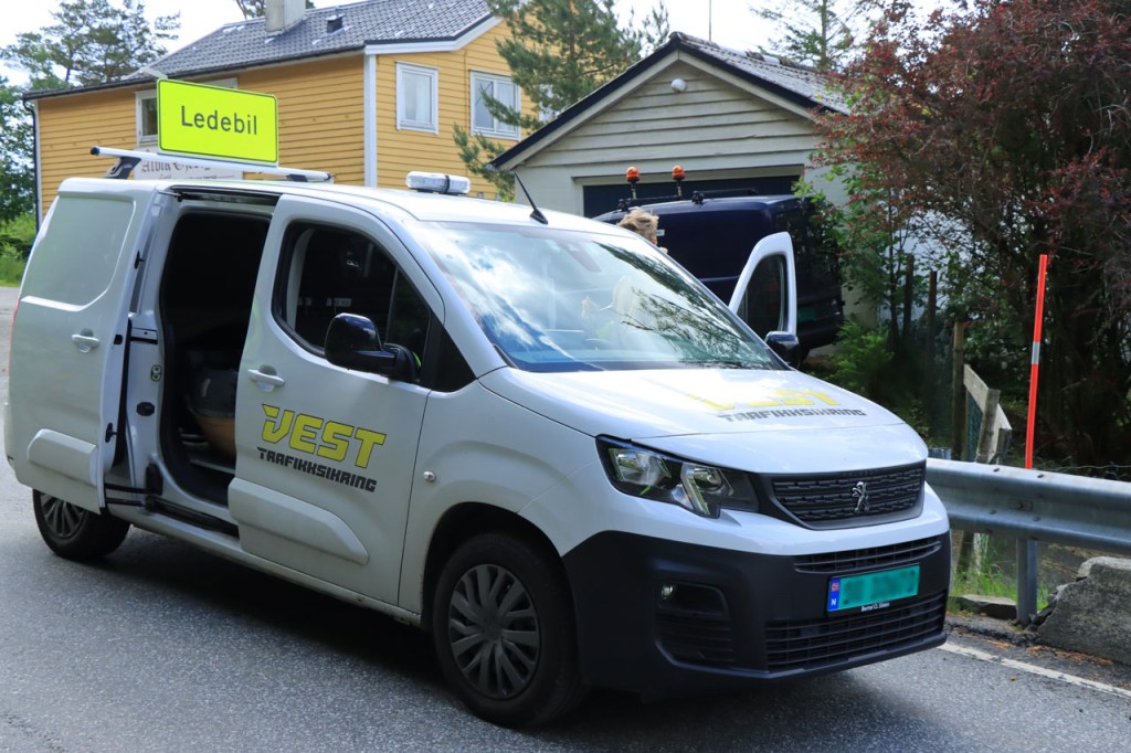 Even voorbij Ålvik werd er aan de weg gewerkt. Deze werd daarvoor gedurende enkele uren volledig gesloten en in de pauzes werd het verkeer er in konvooi langs geleid. Toen ik er aankwam was de consensus dat ik dat konvooi met mijn fiets niet zou kunnen volgen. Ook zagen de mannen geen mogelijkheid voor om buiten het konvooi de werken te passeren. Het finale besluit was dus dat ik mijn fiets in het begeleidingsvoertuig zou laden en zo de zaak zou passeren. Het bleek dat de werken vooral aan de rotswand gebeurden, waarbij er grote stukken rots verwijderd werden.