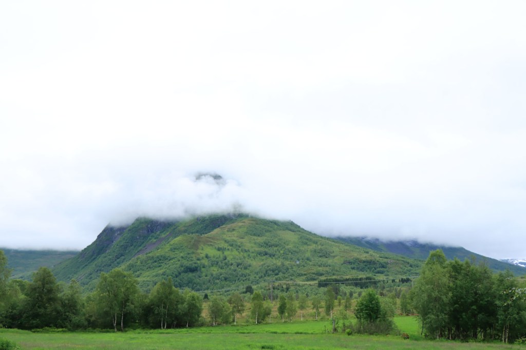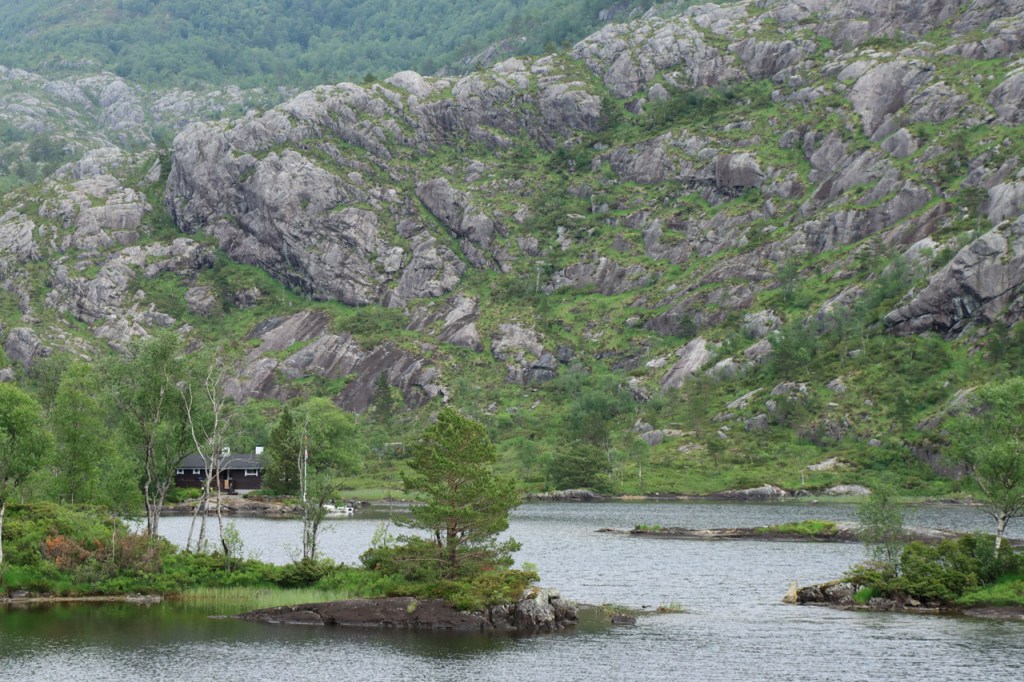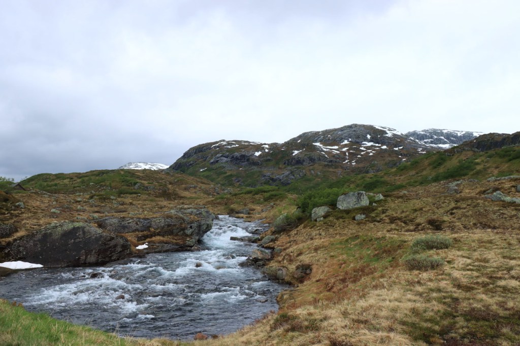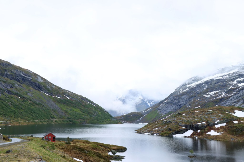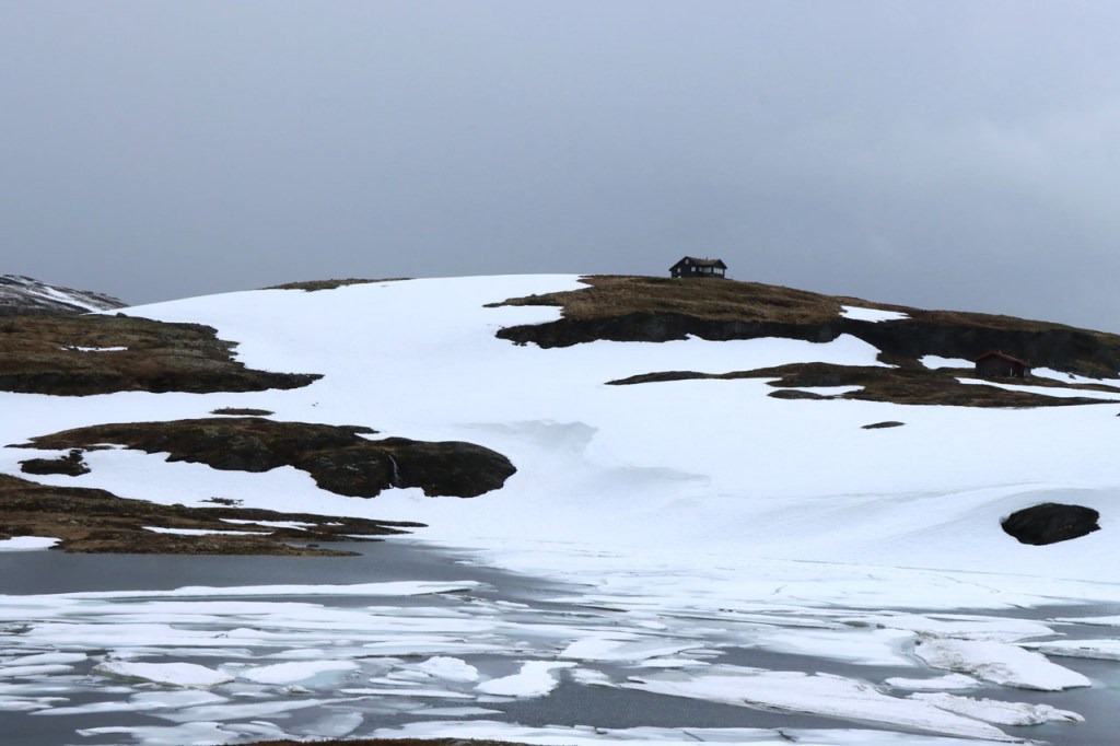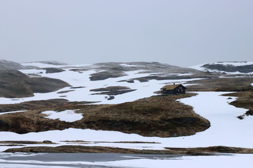 Net als gisteren moest ik vandaag over de fjell, de plateau dus. Het ging wel niet zo hoog als gisteren, niet hoog genoeg voor verse sneeuw, maar wel weer vochtig. Tijdens de afdaling ging het echt regenen en ging de temperatuur op mijn GPS weer richting 1°C. Dat is dan natuurlijk wel niet de officiële temperatuur maar eerder de gevoelstemperatuur. Ik raakte dan ook al vlug vrij verkleumd, ook volle handschoen helpen niet als ze doorweekt worden. Uiteraard was het de bedoeling om vandaag wat verder te fietsen maar toen ik, nog steeds op de fjell, een gelegenheid voor een hut zag, moest ik niet lang twijfelen: toch minstens eens naar de prijs informeren. Die prijs bleek erg schappelijk en zo werd het dus een kort ritje. Een warme douche deed zelden zoveel deugd en ik heb zelfs wat verwarming in mijn hutje. De laatste 3 foto’s zijn vanop mijn locatie.