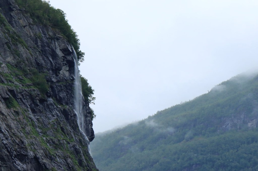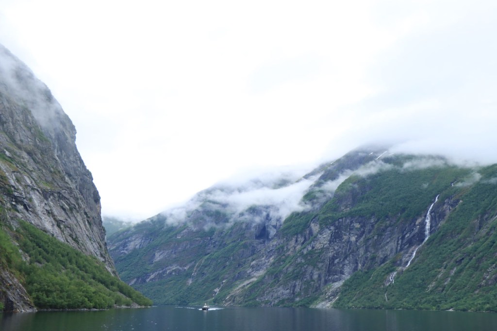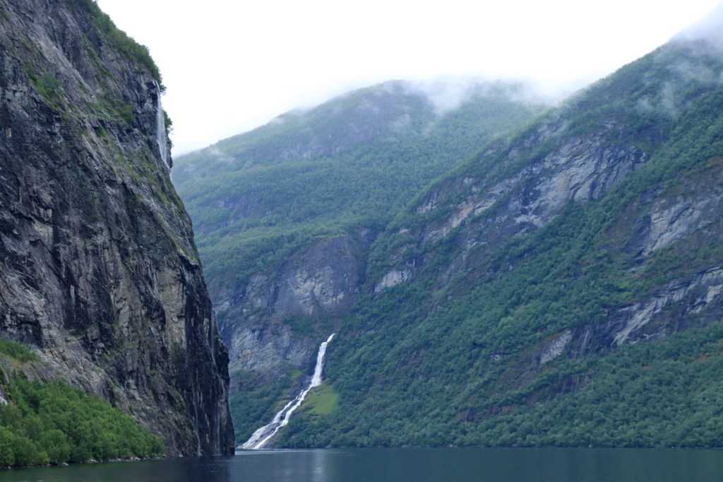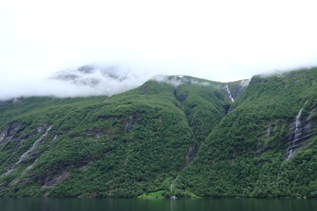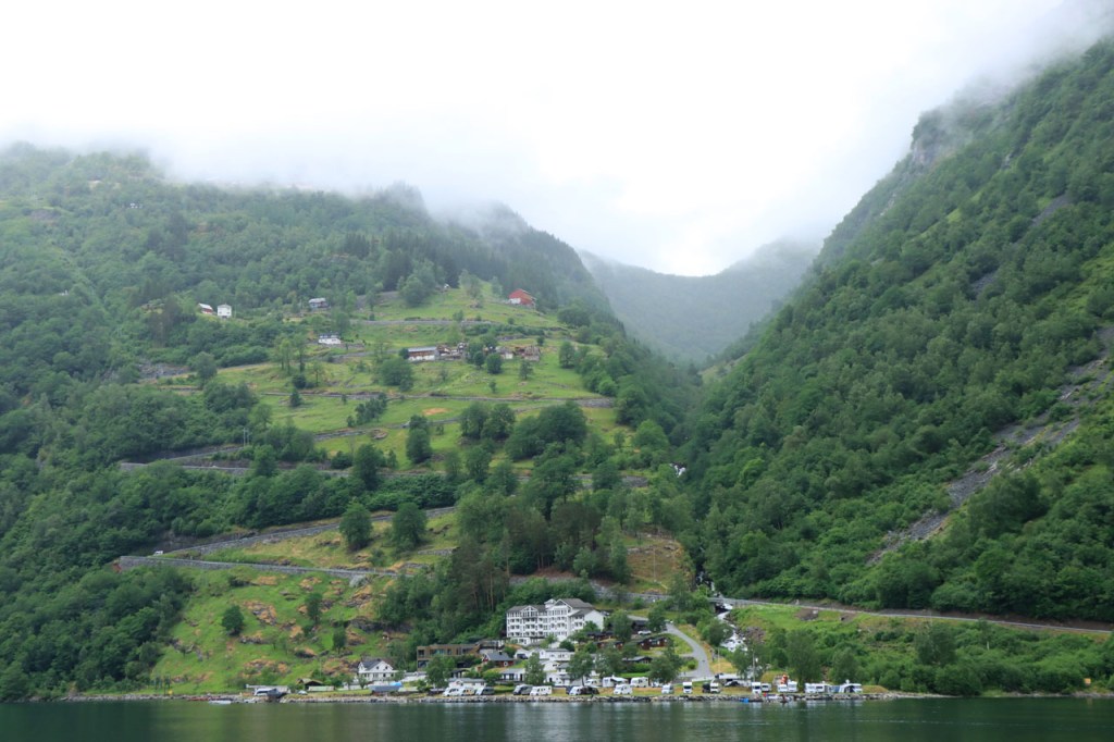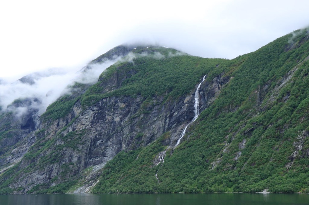 Ik heb vanmorgen de route van 2009 verlaten. Toen ging ik over de weg richting Geiranger, nu reed ik naar Hellesylt om van daar de “veerboot cruise” naar Geiranger te nemen. Zo had ik het aanvankelijk gepland maar gisteren was er twijfel over gerezen. Het is een stuk langer in het geheel, deze veerboot is niet gratis voor fietsers en de vraag was of het in de huidige omstandigheden de moeite zou zijn. Bovendien passeerde ik al meerdere keren, o.a. dus 15 jaar geleden maar ook nog 5 jaar geleden met moeder. Uiteindelijk deed ik het niet omdat ik met de koude van vandaag liever niet naar 1.00 meter klom. Morgen moet ik dat toch doen en zal het niet veel beter zijn maar in principe iets minder koud. De volgende vraag was dan in Hellesylt kamperen en morgen de boot nemen, hopend op een minimale kans op mooier weer, of meteen varen en in Geiranger kamperen. Het is voor zulke beslissingen dat ik liever alleen op fietsreis ga, je neemt je eigen beslissingen waar niemand anders last van heeft maar waarvoor je ook niemand anders de schuld kan geven 🙂 . De vaart door de Geirangerfjord viel uiteindelijk nog best mee, met de lage wolken heeft het ook wel sfeer. Kort voor het einde kreeg ik de weg te zien waarlangs ik de vorige keer Geiranger verliet, ongetwijfeld één van de zwaarste klimpartijen van die reis. Nu zal ik wegrijden langs de weg waarlangs ik toen aankwam en dat wordt waarschijnlijk gewoon wreed lastig 🙂 .