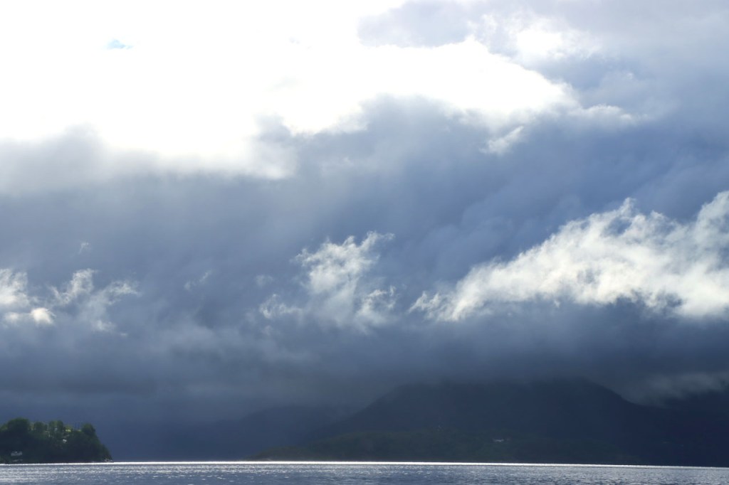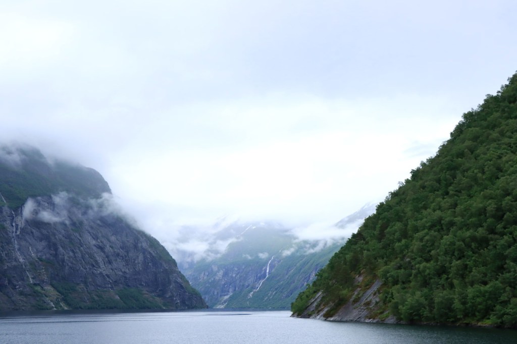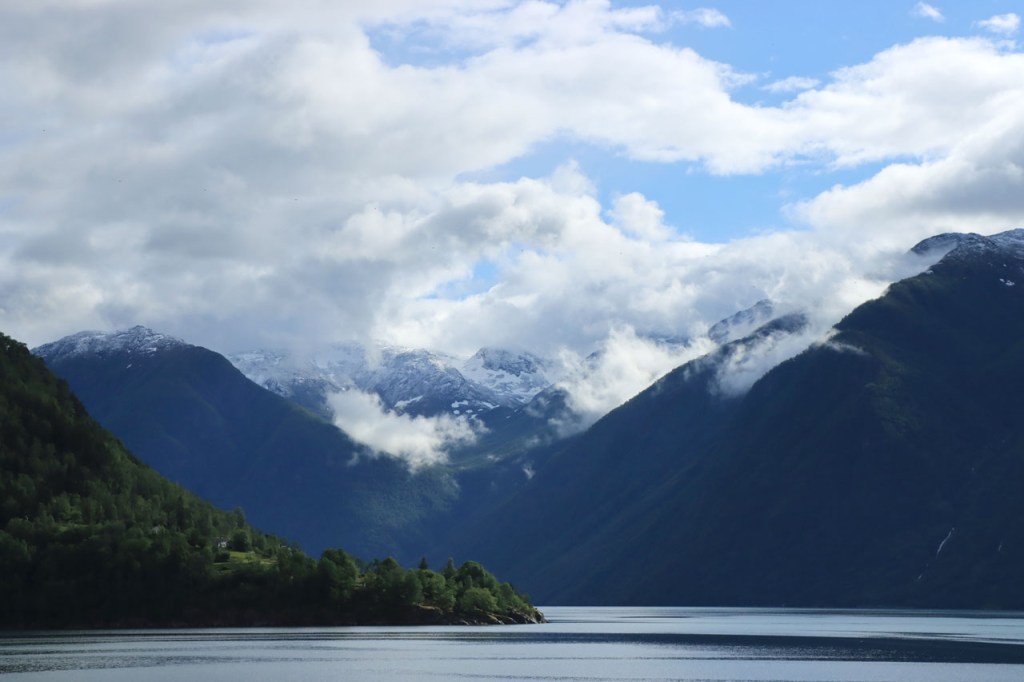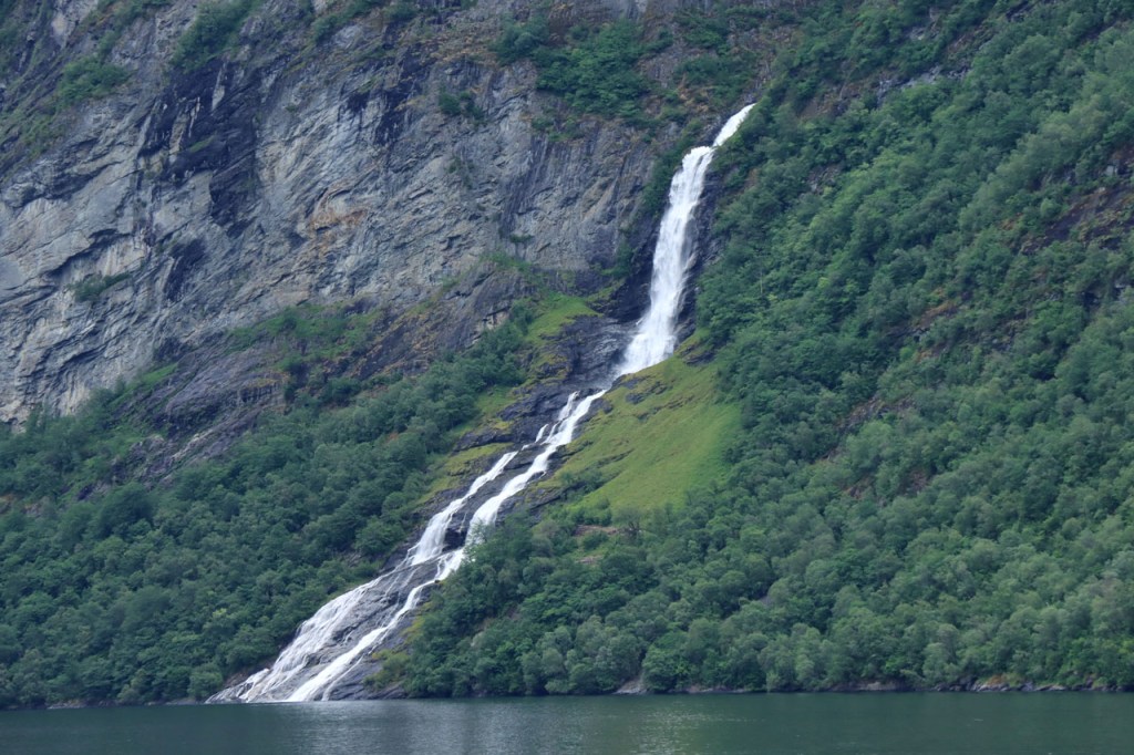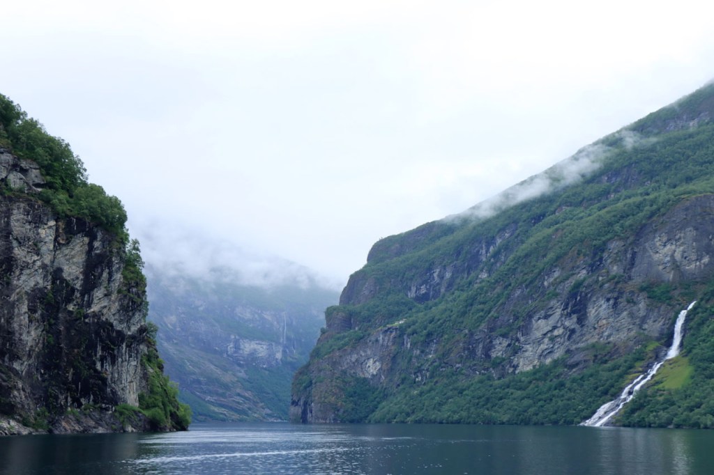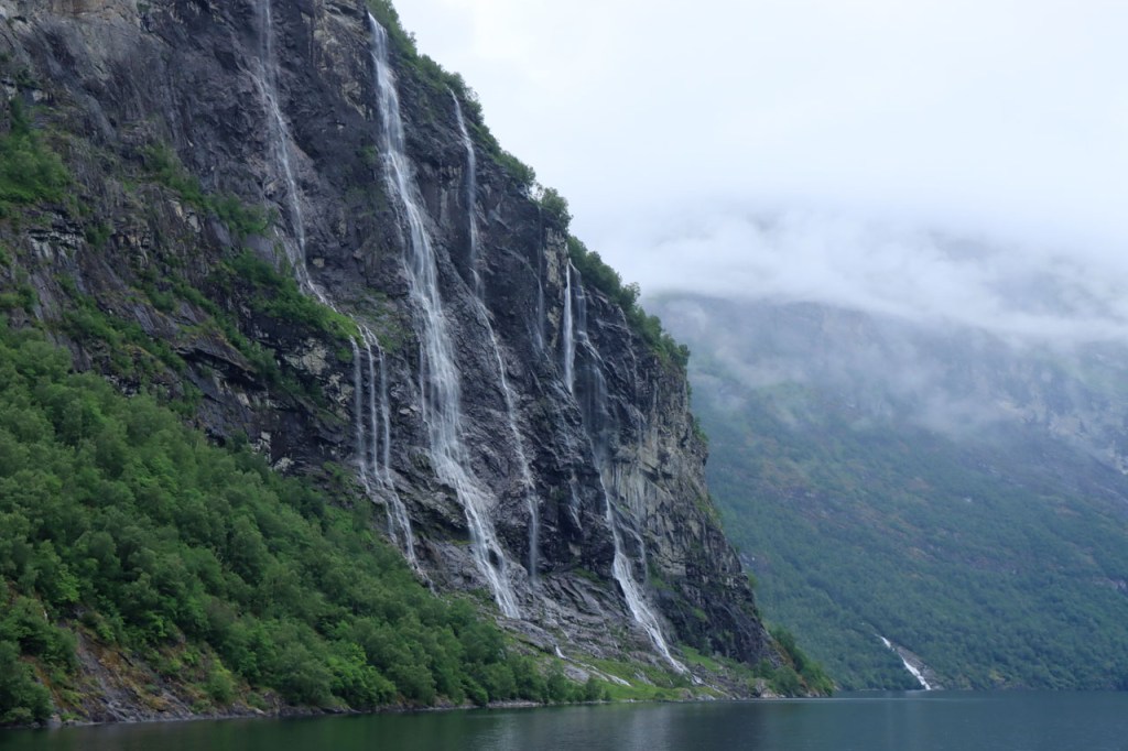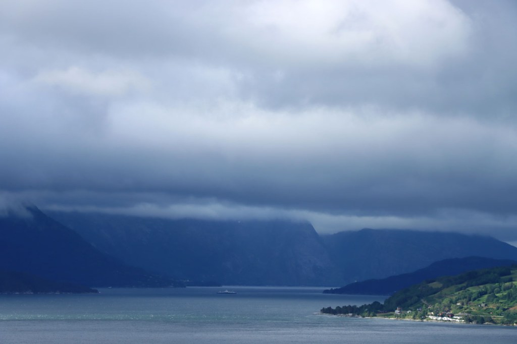 Ik heb vanmorgen de route van 2009 verlaten. Toen ging ik over de weg richting Geiranger, nu reed ik naar Hellesylt om van daar de “veerboot cruise” naar Geiranger te nemen. Zo had ik het aanvankelijk gepland maar gisteren was er twijfel over gerezen. Het is een stuk langer in het geheel, deze veerboot is niet gratis voor fietsers en de vraag was of het in de huidige omstandigheden de moeite zou zijn. Bovendien passeerde ik al meerdere keren, o.a. dus 15 jaar geleden maar ook nog 5 jaar geleden met moeder. Uiteindelijk deed ik het niet omdat ik met de koude van vandaag liever niet naar 1.00 meter klom. Morgen moet ik dat toch doen en zal het niet veel beter zijn maar in principe iets minder koud. De volgende vraag was dan in Hellesylt kamperen en morgen de boot nemen, hopend op een minimale kans op mooier weer, of meteen varen en in Geiranger kamperen. Het is voor zulke beslissingen dat ik liever alleen op fietsreis ga, je neemt je eigen beslissingen waar niemand anders last van heeft maar waarvoor je ook niemand anders de schuld kan geven 🙂 . De vaart door de Geirangerfjord viel uiteindelijk nog best mee, met de lage wolken heeft het ook wel sfeer. Kort voor het einde kreeg ik de weg te zien waarlangs ik de vorige keer Geiranger verliet, ongetwijfeld één van de zwaarste klimpartijen van die reis. Nu zal ik wegrijden langs de weg waarlangs ik toen aankwam en dat wordt waarschijnlijk gewoon wreed lastig 🙂 .