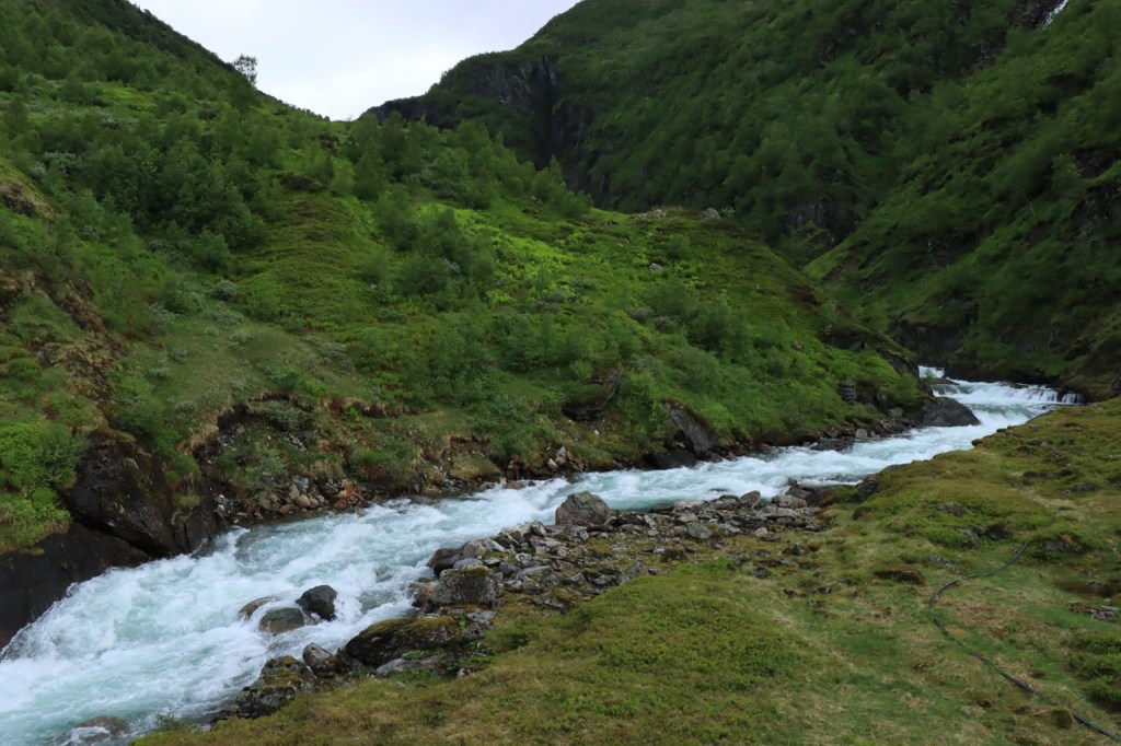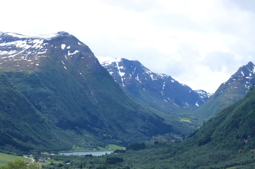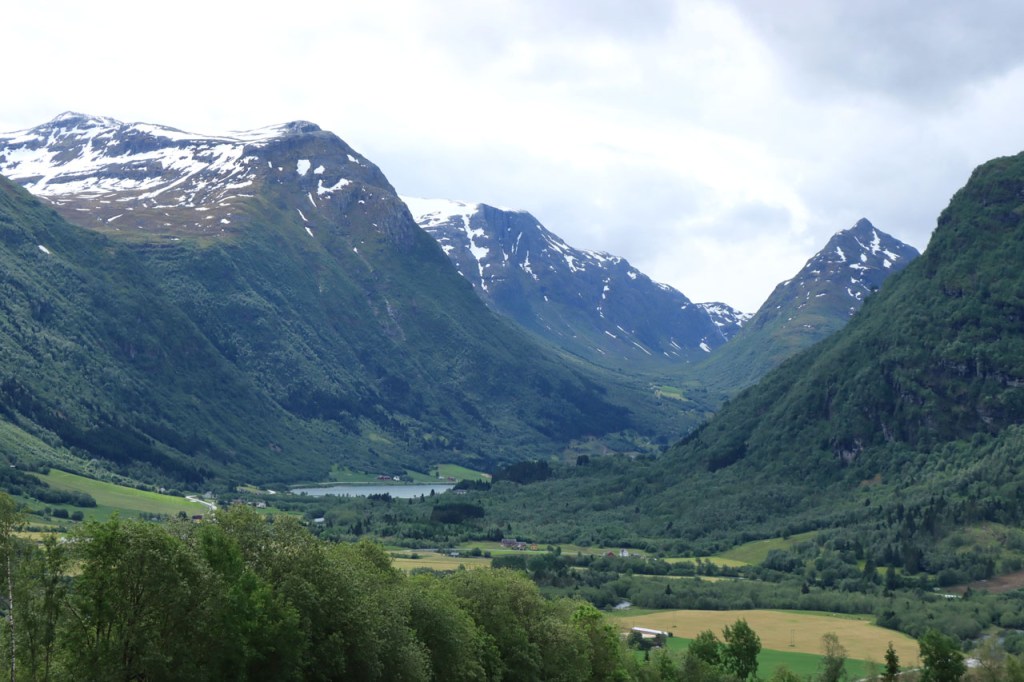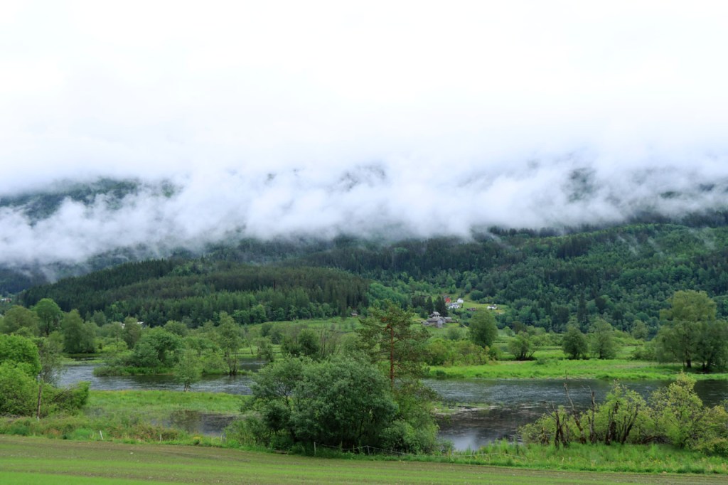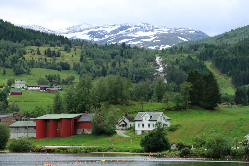 Mijn vrees voor stevig stijgen, van gisteren, bleek ongegrond, de weg liep mooi door de vallei. Ik had eventueel dus wel kunnen verder gaan tot Byrkjelo, mijn halte in dat geval. Anderzijds is het misschien gewoon beter om de ritten, zeker in de omstandigheden van de vorige 2 dagen, eerder wat korter te maken dan ze wat langer uit te rekken. Je zou overigens kunnen zeggen dat ik dat van de vallei eigenlijk allemaal op voorhand moest weten. Ik volg al sinds Voss dezelfde route als in 2009 maar herinner me dus niet zomaar alle details ervan. Wel zijn er punten die je erkent wanneer je er passeert, zoals de klim naar de fjell voorbij Voss of het zicht op Vik aan het einde van de afdaling en nu ook wel die vallei, eens je er bent dus.