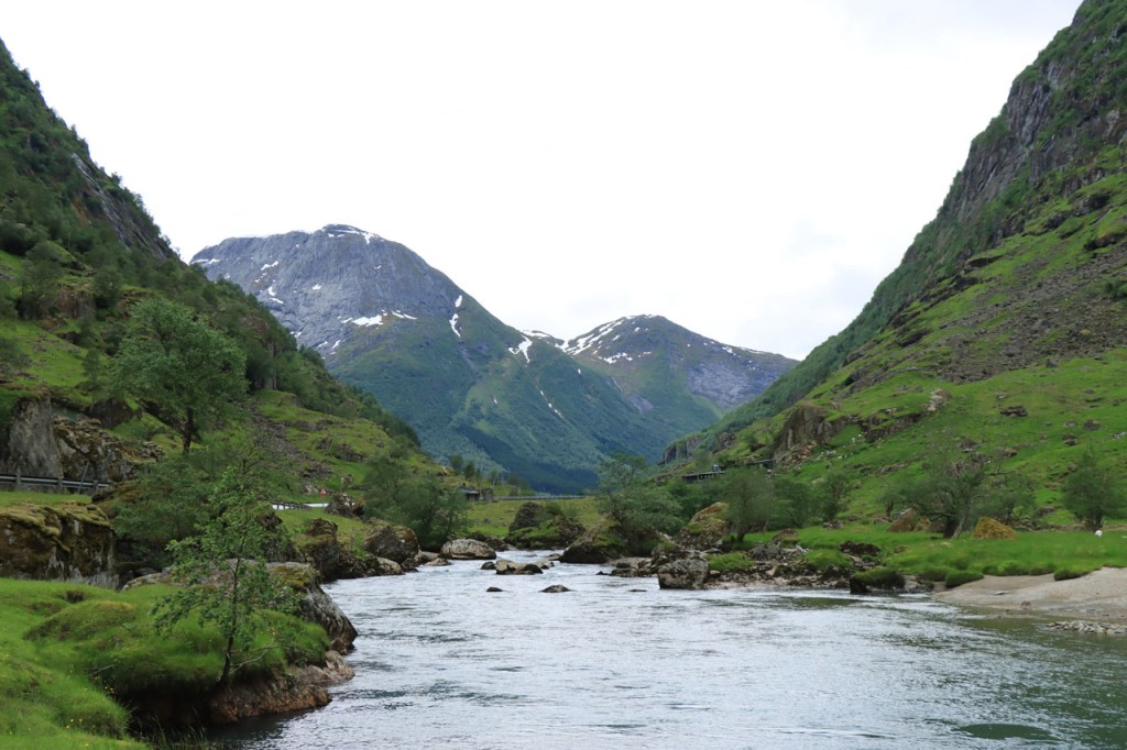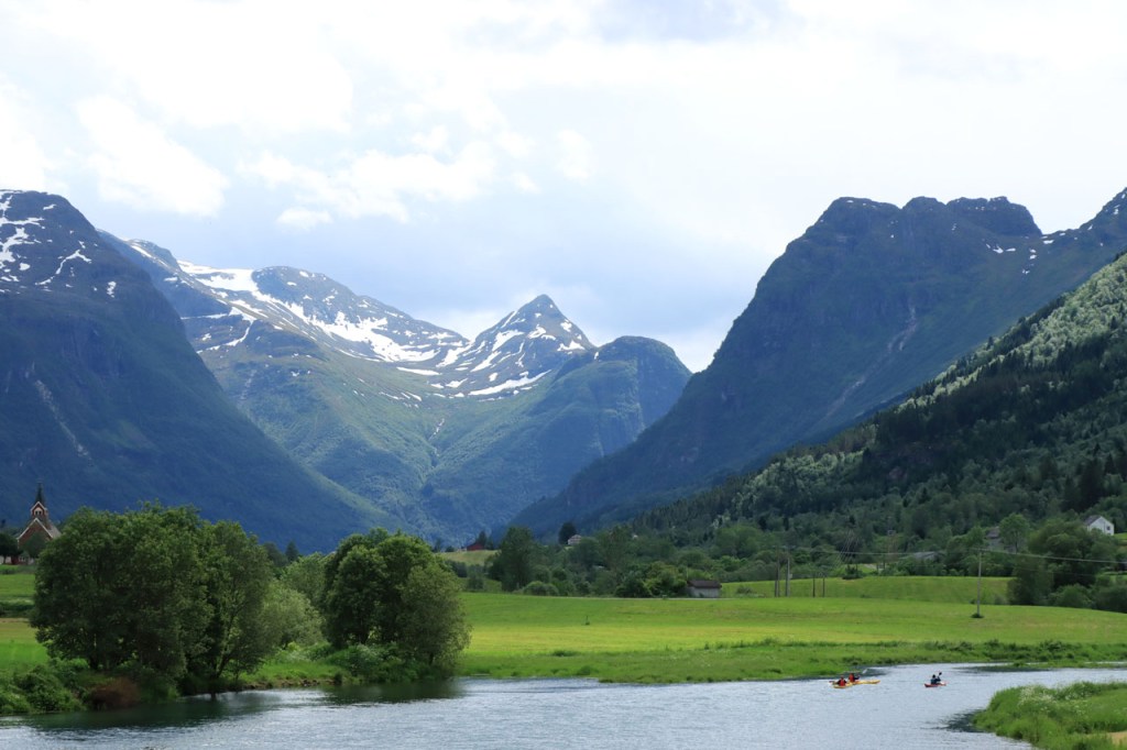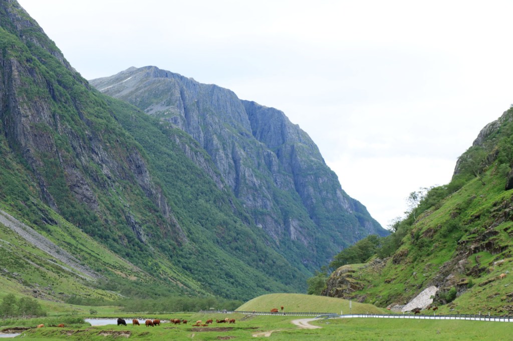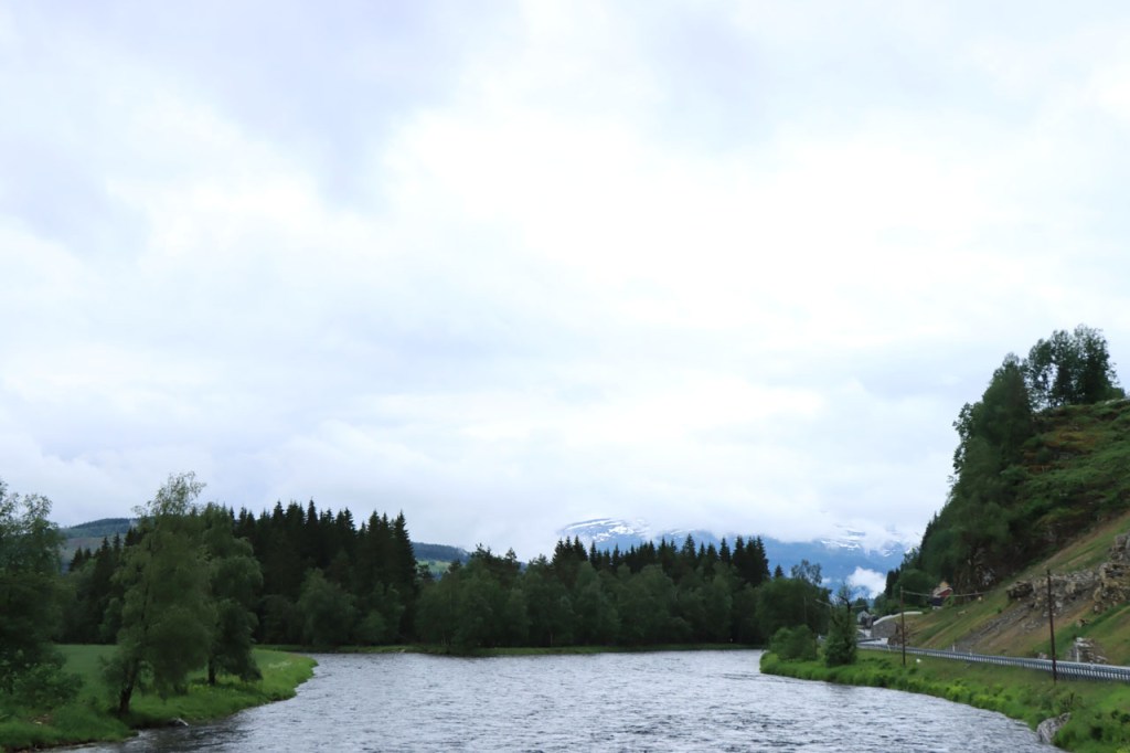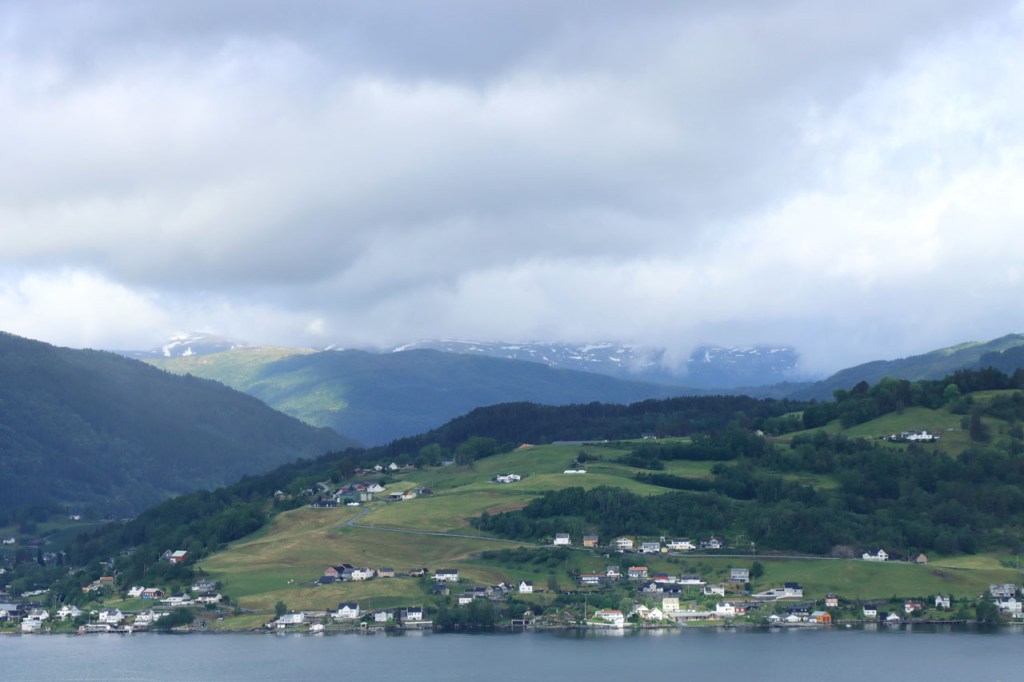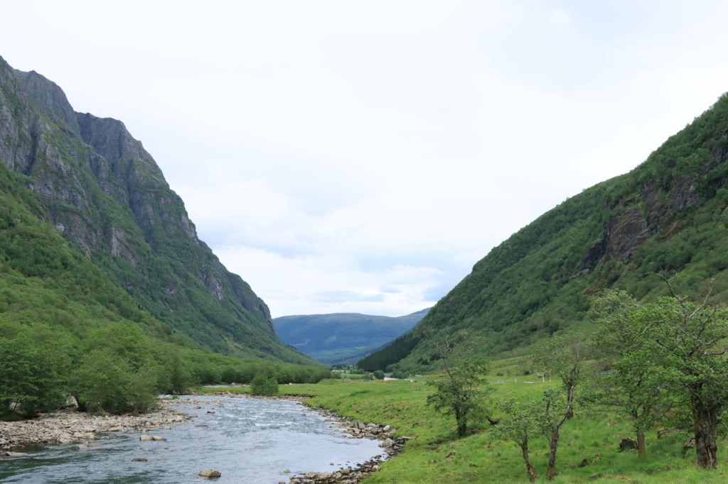 Mijn vrees voor stevig stijgen, van gisteren, bleek ongegrond, de weg liep mooi door de vallei. Ik had eventueel dus wel kunnen verder gaan tot Byrkjelo, mijn halte in dat geval. Anderzijds is het misschien gewoon beter om de ritten, zeker in de omstandigheden van de vorige 2 dagen, eerder wat korter te maken dan ze wat langer uit te rekken. Je zou overigens kunnen zeggen dat ik dat van de vallei eigenlijk allemaal op voorhand moest weten. Ik volg al sinds Voss dezelfde route als in 2009 maar herinner me dus niet zomaar alle details ervan. Wel zijn er punten die je erkent wanneer je er passeert, zoals de klim naar de fjell voorbij Voss of het zicht op Vik aan het einde van de afdaling en nu ook wel die vallei, eens je er bent dus.