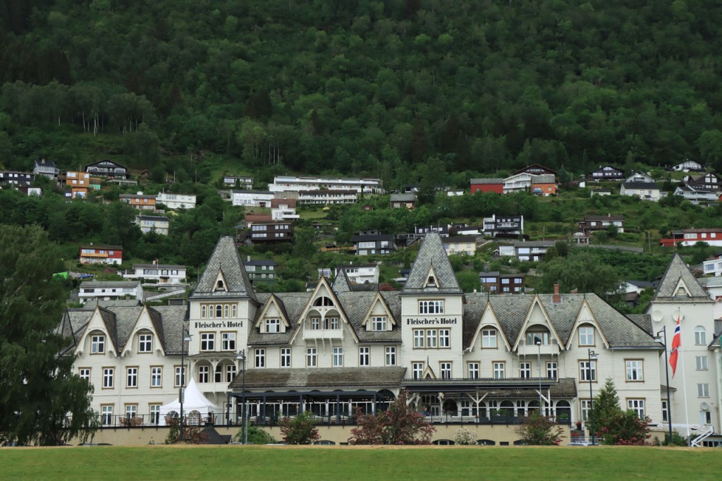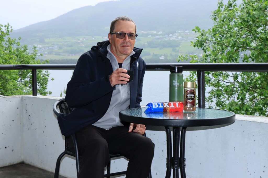 Ik hoorde onlangs op TV dat Voss een beetje een reputatie van adrenaline stad zou hebben, vanwege de activiteiten die men hier kan doen. Buiten een occasionele poster heb ik daar echter nog maar weinig van gemerkt. Voor mij is Voss vooral een rust stadje. Ik ging in de voormiddag wel even tot in het centrum. Daarbij horen in Voss het Fleischer’s Hotel en het oudste stenen kerkje van Noorwegen tot de vaste waarden 🙂 , al had ik deze keer wel een andere hoek op het Fleischer’s. Na de middag heerste dus vooral rust. Ik probeerde daarbij nog wel een foto van vorige keer, met oploskoffie en koekjes op het balkon van de herberg, te recreëren.