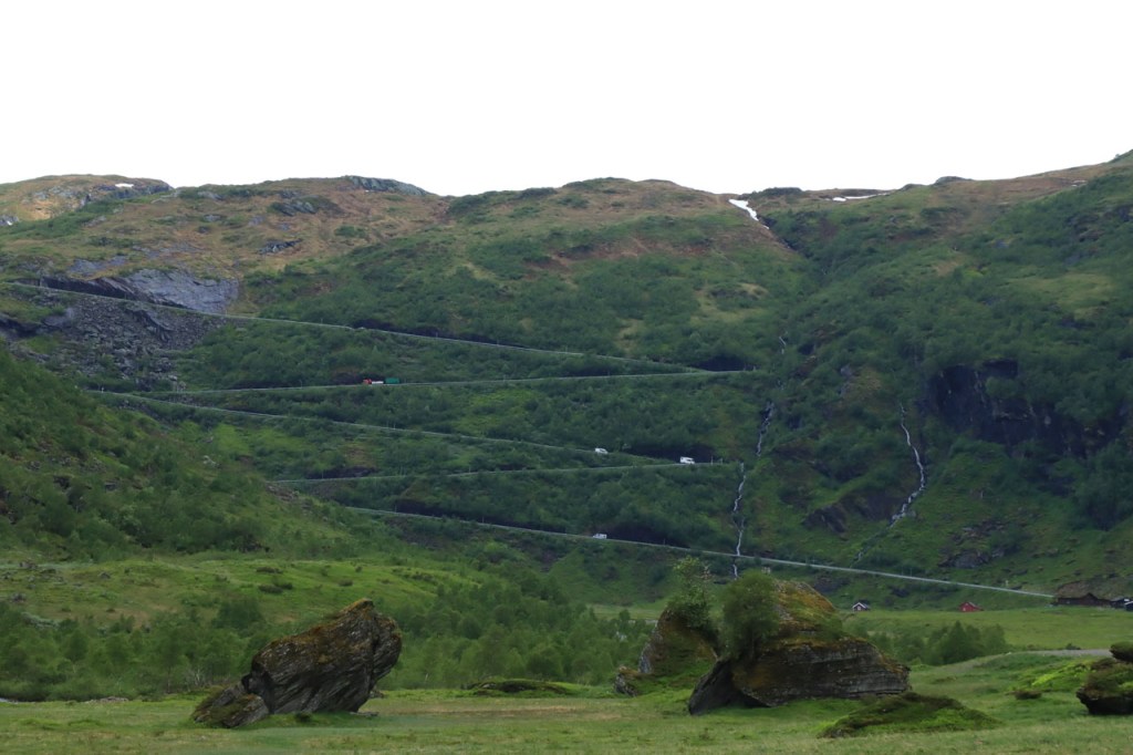 De uitgang van Geiranger in de andere richting mag dan zwaar zijn vanwege zijn steilte en spectaculair met zijn haarspeldbochten maar die in deze richting moet qua steilheid niet veel onderdoen en het blijft maar duren. Over de eerste 16 kilometer deed ik bijna 3 uur. Eigenlijk vond ik het zelf al wel enigszins straf dat ik er uberhaupt boven geraakte, bij momenten was het echt doorbijten. Gisteren was ik nog best blij met mijn beslissing van langs Geiranger te gaan maar deze voormiddag al veel minder. Dat bedoelde ik gisteren dus met mijn voorkeur om solo te reizen, bij duo reizen zouden daar problemen van kunnen komen.