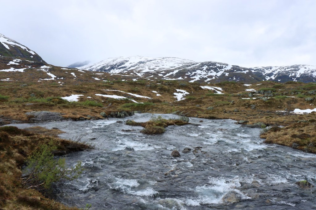 Naar het einde van de rit werd het weer wel wat beter en de kilometers al een tijdje wat makkelijker maar het bleef wel koud en eigenlijk had ik door de omstandigheden vandaag wel wat eerder willen stoppen. Volgens mijn kaart waren er mogelijkheden maar ik zag ze niet. Er waren wel enkele plaatsen maar dat was dan ondertussen bijvoorbeeld een hotel in plaats van hutten, een hut kan best maar een hotelkamer alleen in nood 😉 , of ik kon er gewoon niet terecht of er werd niet opgenomen. Dus werd het de camping van Dønfoss. Ik had eigenlijk ook een hut gewild om echt op te warmen en uit te drogen maar dat prijsverschil tussen hut en tent was echt te groot. Gelukkig staat er ondertussen wel een zonnetje en wat wind, het is niet te geloven hoe vlot die combinatie zaken droogt 🙂 .